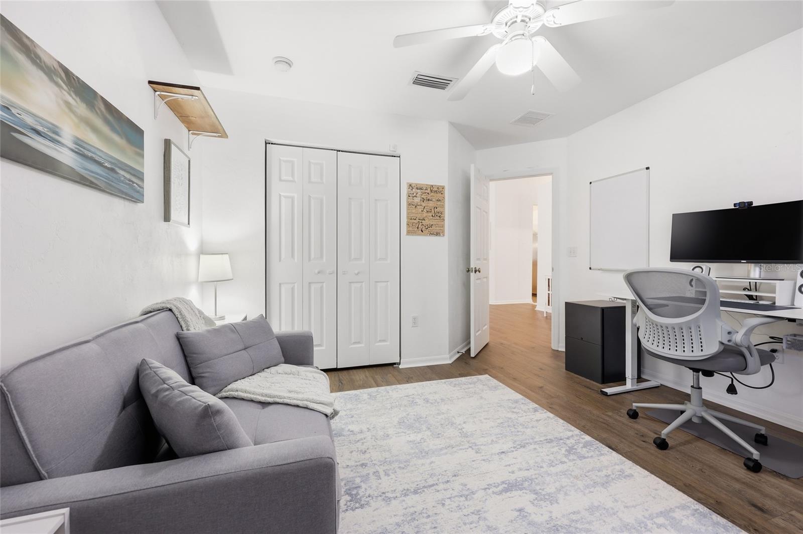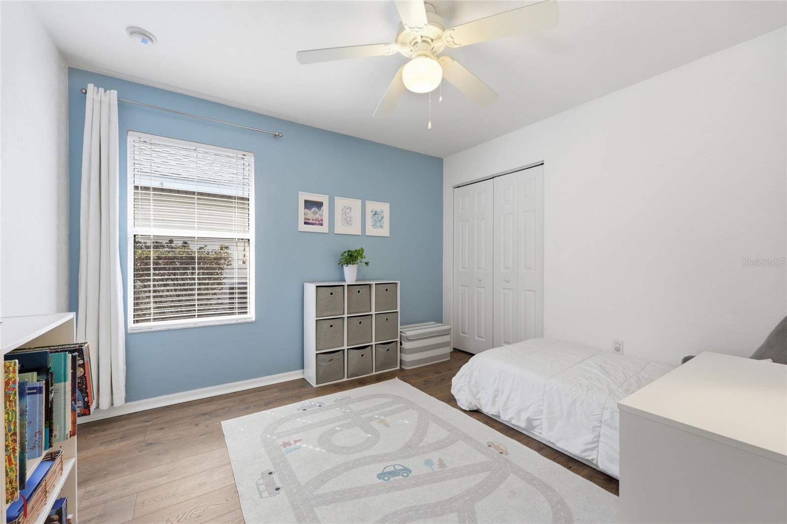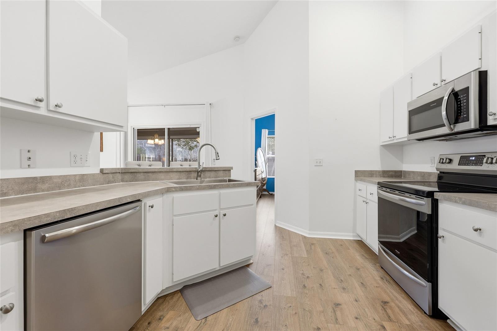 Welcome to resort-style living in sought-after Sorrento; impeccably maintained 4-bedroom, 2-bath home offers a rare combination of dramatic architectural details and major system updates. You are greeted immediately by a covered front porch with serene conservation wooded views—no front neighbors! Step inside to discover soaring 18-foot ceilings that bathe the common areas and primary suite in natural light. The smart 3-way split floor plan ensures maximum privacy for all. The heart of the home features wood laminate flooring (2022) and a kitchen dressed to impress with a full suite of Frigidaire Gallery stainless steel appliances and a deep single-tub stainless sink (2025). Truly move-in ready, the heavy lifting has already been done for you: New Roof (2023), Water Heater (2023), HVAC (2019), and fresh Interior/Exterior Paint (2022). Relax on your screened lanai overlooking the fully fenced backyard, or explore the neighborhood. Sorrento offers fiber-optic internet and resort-style amenities, including a pool with splash pad, tennis/pickleball courts, basketball court, playground, fitness center and nature walks. This dream home won’t be on the market long. Schedule your showing today!