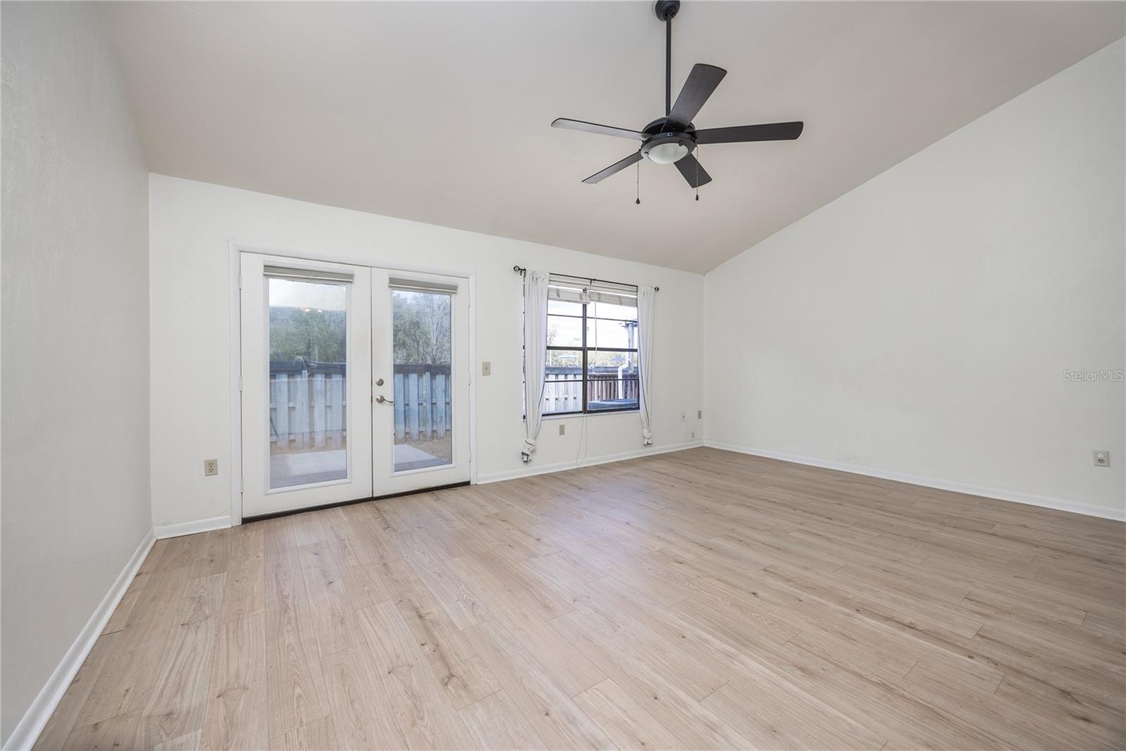 Affordable homeownership with park views! This bright and inviting 3-bedroom, 2-bath home offers low HOA living and a private backyard overlooking Abby Wambach Park — providing a peaceful setting with no rear neighbors. The bright and airy floor plan features vaulted ceilings and abundant natural light throughout. The kitchen is both stylish and functional with granite countertops, stainless steel appliances, and great workspace for cooking and entertaining. A convenient laundry closet with high-end appliances is located on the ground floor. The layout includes one bedroom and a full bath on the main level, offering flexibility for guests, a home office, or additional living space. French doors open to the patio and backyard, where you can relax and enjoy the park views. Conveniently located close to bus lines, shopping, and everyday amenities, making daily living easy and accessible.