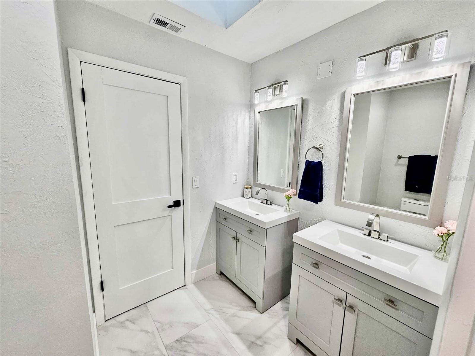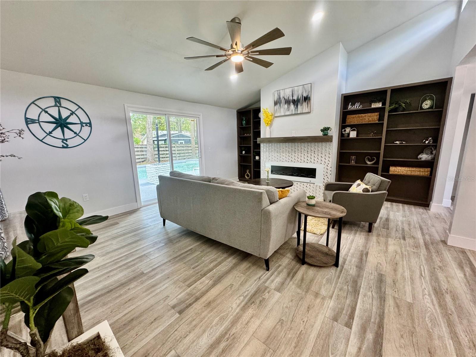 This fully updated pool home offers style and convenience of a great SW Gainesville location. Step inside to discover a completely remodeled home with LVP flooring throughout, upgraded lighting, a new front and sliding glass door, interior and exterior paint, a new garage door, roof (2021), and HVAC (2019). Upon entering the home, you will find a spacious living and dining room combo with soaring vaulted ceilings, abundant natural light, and gorgeous built-ins surrounding a new fireplace with multiple mood settings, as well as fancy glass tile. The kitchen has new shaker cabinets, tile backsplash, quartz countertops, and stainless steel appliances. The primary suite is spacious with a walk-in closet and access to the in-ground pool. The primary bathroom was fully updated with a new vanity, upgraded lighting, and a spa-like shower with a frameless shower door. The guest bath features double vanities for added convenience, new tile, and lighting. Step outside to your newly resurfaced in-ground pool (2025) with new pool equipment—perfect for relaxing or entertaining, with plenty of room to still run in the yard. This move-in-ready home gives you the peace of a move-in-ready home, the convenience of SW Gainesville, and the fun of your personal pool. The owner is a licensed real estate agent in the state of Florida.