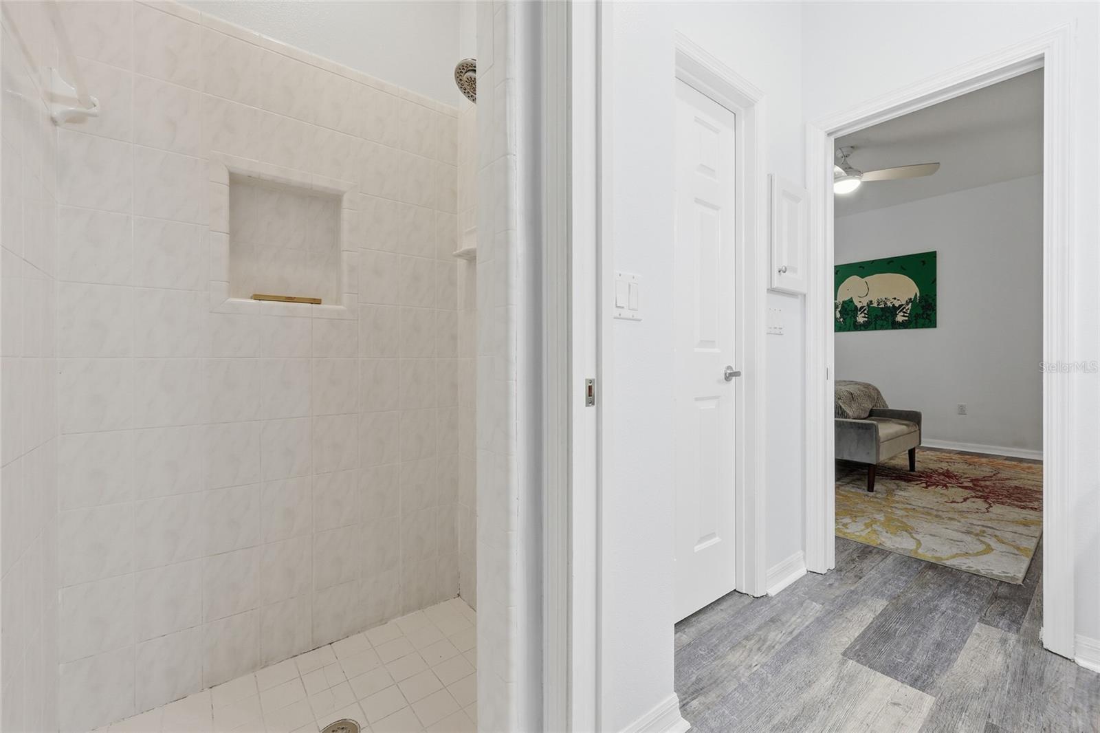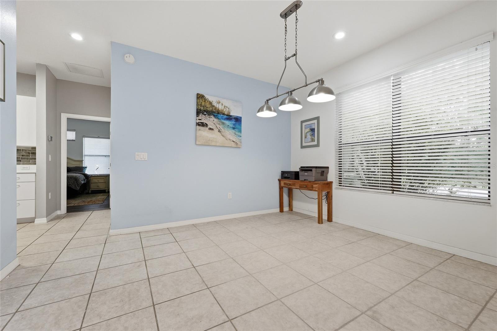 Welcome to this beautifully maintained home in the desirable South Pointe community, offering sidewalks, a community pool, and a park, perfect for an active and connected lifestyle. As you arrive, you will immediately notice the Florida friendly front yard and inviting curb appeal, complemented by durable stucco construction with a concrete block and steel frame. Step inside to a welcoming entry with a convenient coat closet, leading you into an expansive, light filled living space. This oversized living area features built in shelving and offers incredible flexibility, easily convertible back to an additional bedroom if desired. The updated kitchen is both functional and stylish, featuring white cabinetry, smart stone countertops, a pantry, a tile backsplash, and newer stainless steel appliances including a refrigerator, dishwasher, and hood, plus a two year old stove. Just off the kitchen, you will find a laundry closet and a built in desk with shelving, perfect for a home office or organization station. Adjacent to the kitchen, the dining area offers access to a large storage space, ideal for keeping everything neatly tucked away. Updated lighting throughout enhances the home’s bright and modern feel. The split floor plan provides privacy, with the secondary bedroom featuring luxury vinyl plank flooring and a new ceiling fan, and a nearby bathroom with a pocket door allowing for a private suite feel. The primary suite is a true retreat with LVP flooring, a spacious walk in closet, and an en suite bath with a separate toilet and shower area. Step outside to enjoy the screened lanai overlooking a fully fenced backyard with a peaceful and private garden setting, complete with no rear neighbors, mature landscaping, a persimmon tree, and a tranquil pond feature. Major system updates include a roof from 2022, HVAC from 2019, and a water heater from 2023. Additional highlights include a utility sink in the garage and attic storage for added convenience. Conveniently located with easy access to I 75, hospitals, shopping, dining, and everyday essentials, this home blends comfort, flexibility, and privacy in one of Gainesville’s most sought after neighborhoods. Do not miss it!