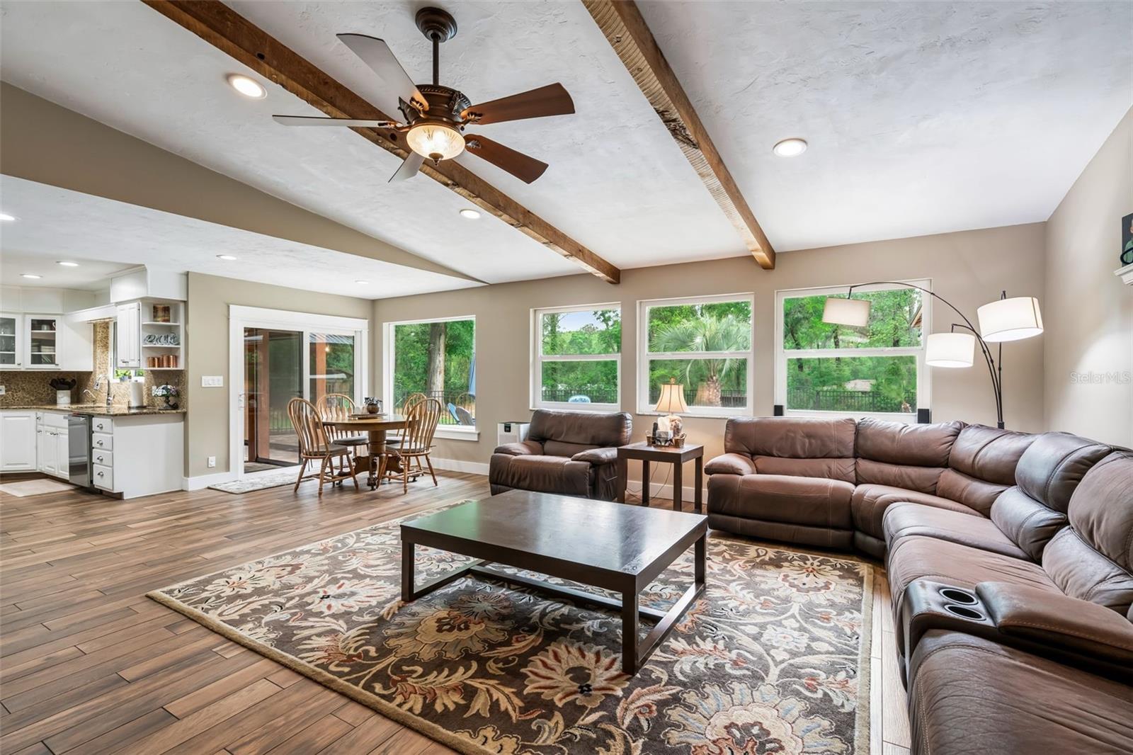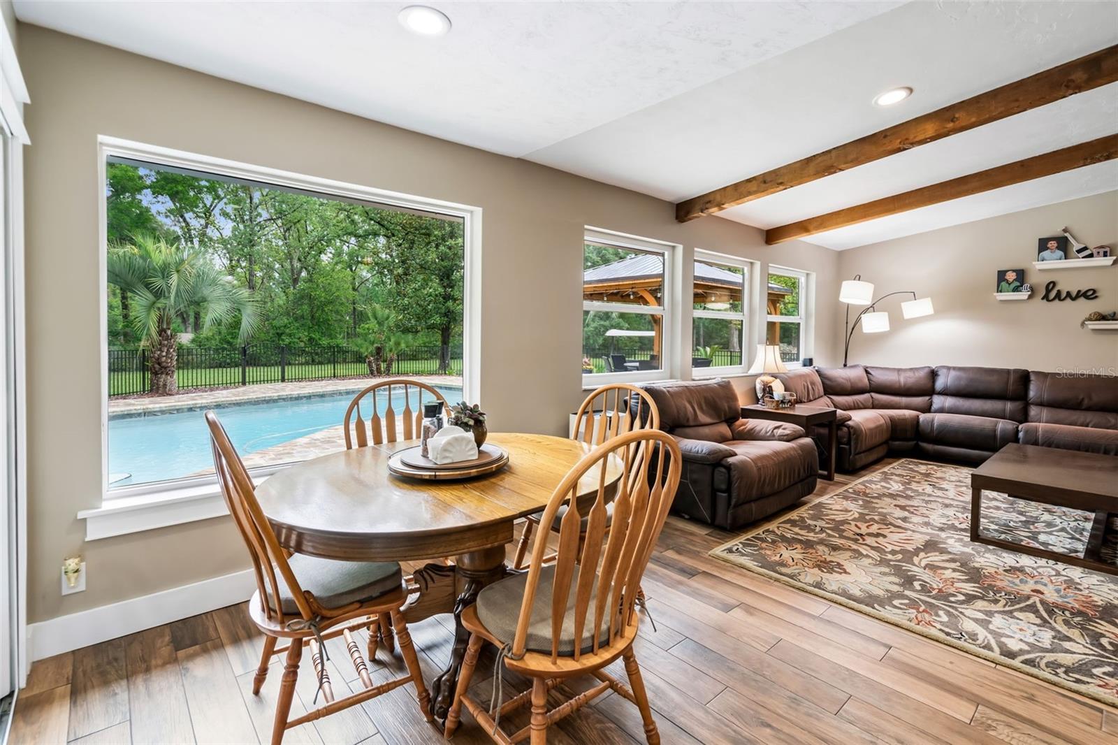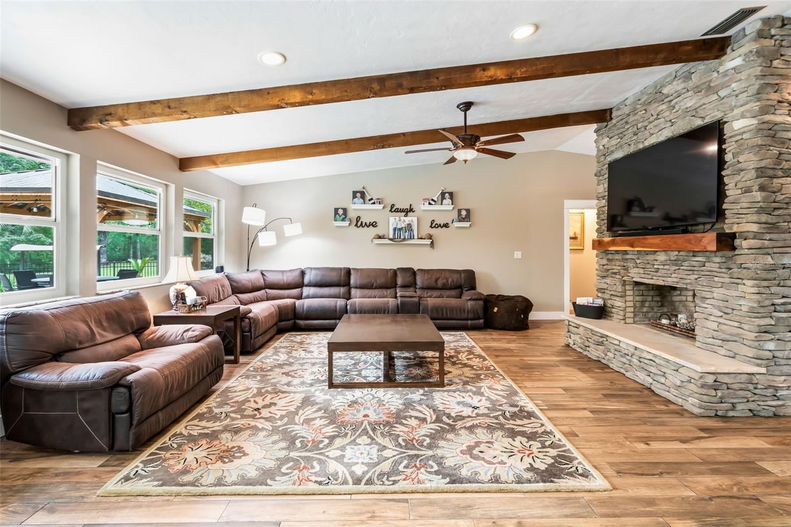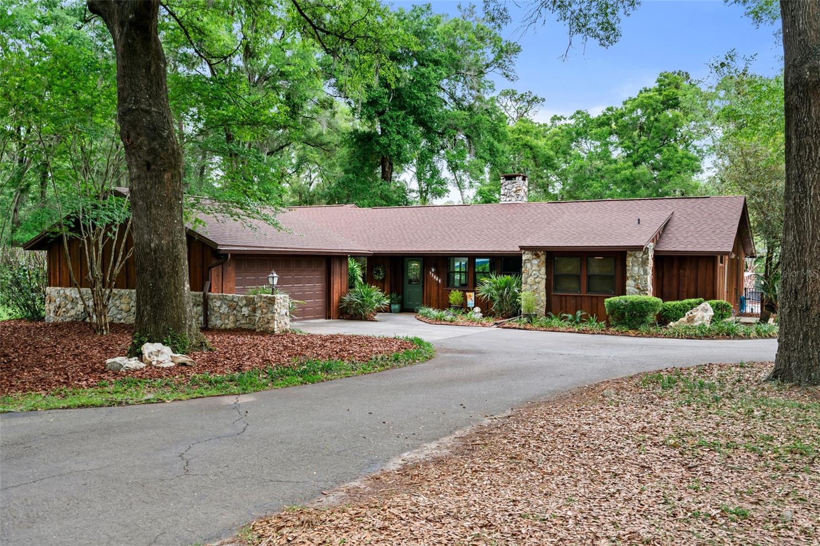 Tucked behind a private gated drive on a beautifully maintained and fully fenced 2.8-acre lot, this exceptional single-story ranch offers the perfect blend of country privacy and Gainesville convenience. Located just minutes from I-75 and backing up to Jonesville Park, this property delivers space, flexibility, and extensive recent upgrades. The home is configured as 5 bedrooms and 3 bathrooms with 3,061 heated and cooled SF, plus an additional bonus room or den ideal for a home office, playroom, or flex space. Inside, you’ll find updated flooring, paint, baseboards, trim, and interior doors, along with energy-efficient vinyl CWS windows and sliding door, a double-sided fireplace, walk-in pantry, and a spacious mud room with storage cabinets, wash tub, and washer/dryer. Major updates include a new A/C in 2021, new roof in 2023, two new hot water heaters in 2023, and a new insulated garage door and opener in 2022. Outdoor living truly sets this property apart, with a remodeled and resurfaced PebbleTec pool, approximately 2,500 SF of pavers, a gazebo with lighting, fan, and power, spacious covered porch with enclosed TV and automatic roll-up screens, all completed in 2024. A top of the line double bay metal building built in 2022 adds incredible versatility with 1,550 SF of enclosed space, 16-foot eave height, two insulated 12' x 14' garage doors, insulated ceiling, 4K interior lighting, thermostat-driven wall fan, galvanized steel conduit, abundant receptacles, a 50-amp RV or welding receptacle, 720 SF of additional covered parking, and ample exterior lighting. Ideal for RV and/or boat storage, workshop use, hobby space, or even a private sports training area such as a batting cage. The property also includes a 215 SF detached storage building with an A/C window unit. Zoned for excellent Gainesville schools like Meadowbrook Elementary and Buchholz High School. Minutes from shopping and restaurants in Jonesville and Tioga Town Center. This is a rare opportunity where space, privacy, and convenience come together. Schedule your private showing today and experience it for yourself before it's gone.