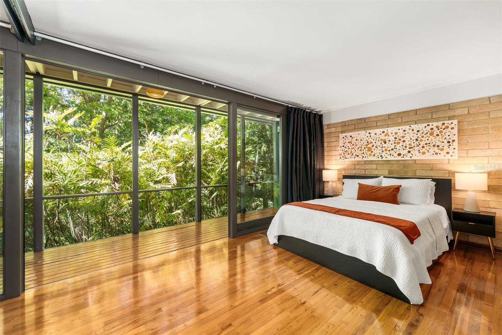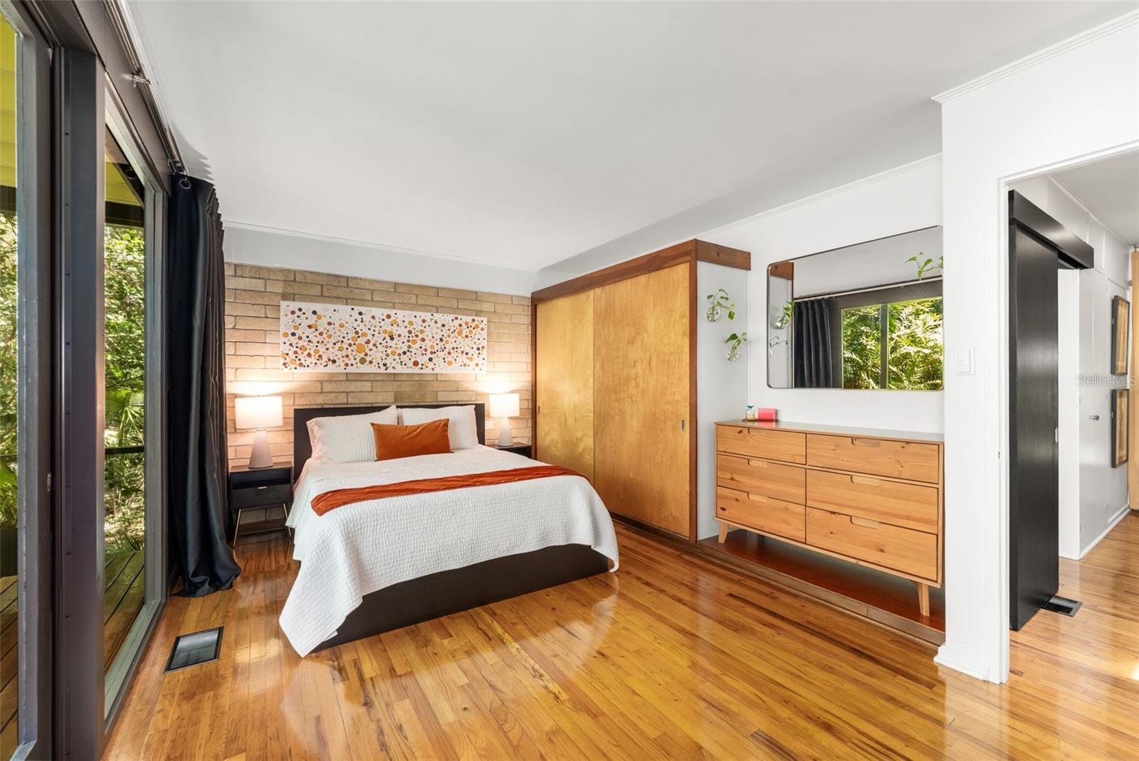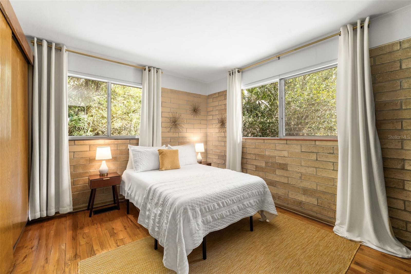 Welcome to the Tree House—one of Gainesville’s most notable mid-century modern residences nestled amid the canopy overlooking Hogtown Creek. Originally designed in 1956 and set on a stunning almost one-acre homesite, this jewel box of a property features a meticulously restored two-bedroom, one bath residence with additional detached workshop that could easily be transformed into an accessory dwelling unit. A rare architectural treasure set in an abundance of nature, this home evokes the feeling of a luxe Costa Rican villa while embracing the timeless principles of Frank Lloyd Wright inspired design—where architecture and nature exist as one. Breathtaking panoramic views and an abundance of natural light greet you as soon as you walk through the door. Continuous glass sliders spanning the entire back of the home dissolve the boundary between indoors and out, creating an immersive living experience second to none. The Tree House's distinctive, organic character is showcased through stacked limestone brickwork, refinished hardwood floors and numerous preserved original details. At the heart of the home, a handcrafted wood-burning fireplace anchors the living area creating a central focal point of warmth, while the partially open kitchen has been sleekly updated to blend contemporary convenience with timeless design. Highlights include a modern cooktop, stainless steel sink, stainless smart refrigerator, custom spice rack and newly restored original Thermador oven. Each bedroom boasts original mid-century built-ins and wall-to-wall sliding wood closets, cedar lined with striking natural grain and custom millwork, offering generous storage while serving as a true design feature. The absolute showstopper, however, is the home's back porch which runs the entire length of the residence and features exposed beam ceilings, completely refinished decking and sweeping views of the surrounding greenery. This elevated indoor-outdoor living space feels like a private sanctuary—perfect for morning coffee, evening gatherings, or simply taking in the peaceful, nature-filled setting. Along the west side of the main residence, you'll find an intimate courtyard with multi-level patio featuring mosaic flagstone pavers, custom lattice work, a creeping vine wall and slatted wood privacy paneling. An additional elevated wood deck overlooks the space, creating a layered, garden-inspired environment ideal for entertaining or quiet relaxation. Adjacent to the courtyard, is an almost 300 square foot detached workshop, complete with a separate electric panel, making it the ideal place for a home gym, yoga studio or easy ADU conversion. A jasmine covered carport flanked by breeze blocks, as well as a freshly mulched driveway with guest parking area and a large thoughtfully landscaped front yard finish out this incredible home. Despite its private, refuge-like setting, this one-of-a-kind property is conveniently located walking distance from Aldi, Publix, coffee shops, and offers a direct route down 13th Street to the University of Florida. Eclectic, sultry, and undeniably unique—the Tree House is a masterclass in mid-century modern design, restored and ready for its next steward. Don't miss this opportunity to make it yours!