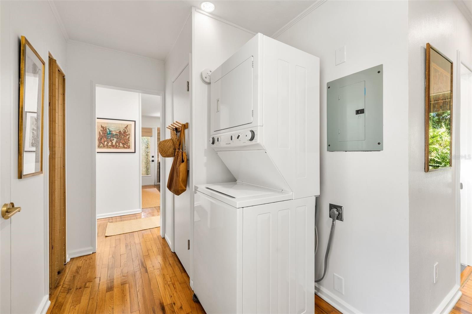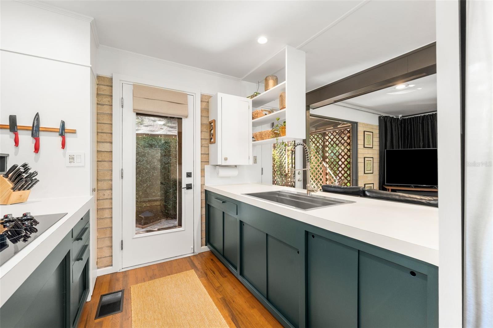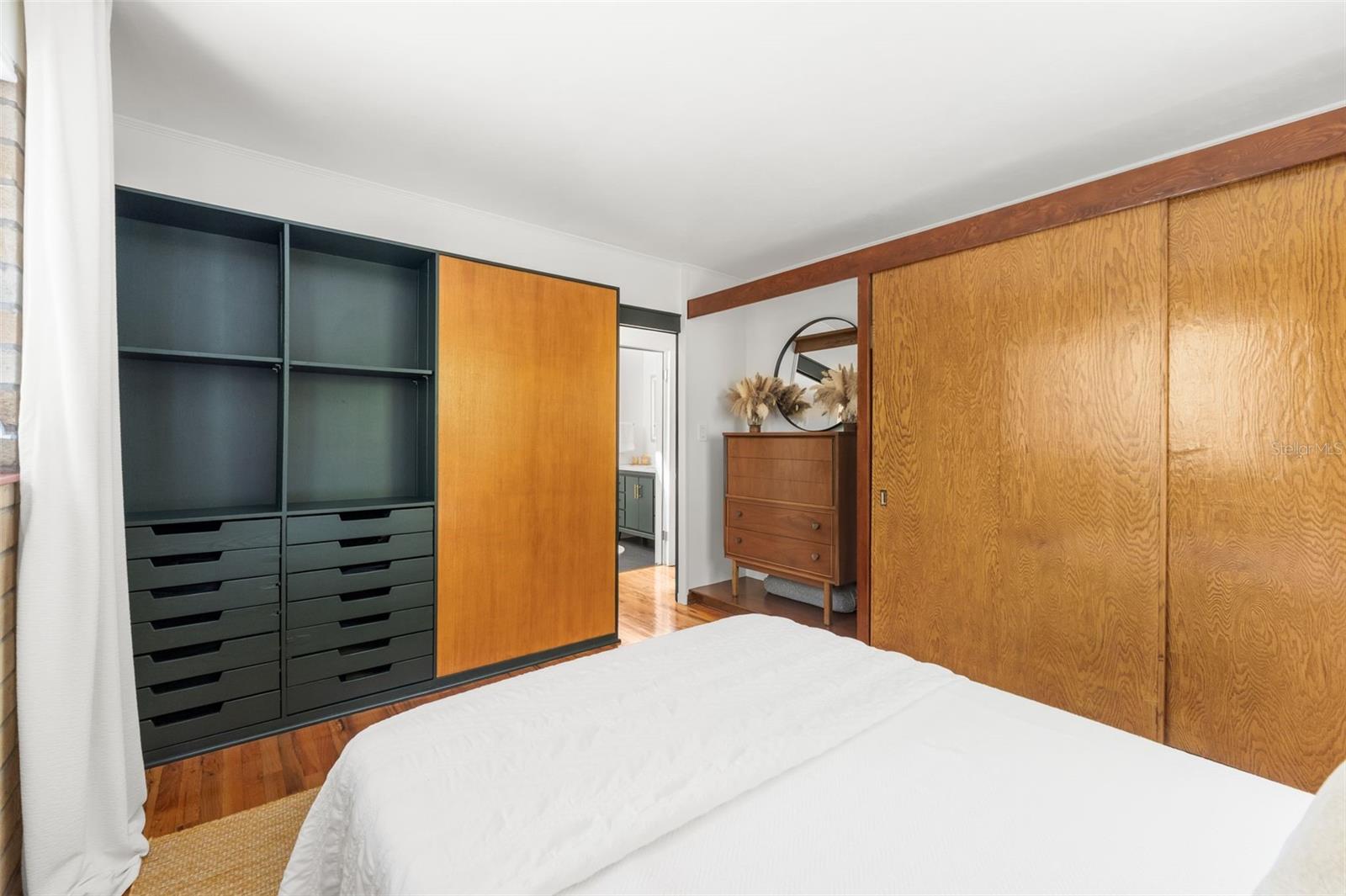 Welcome to the Tree House—one of Gainesville’s most notable mid-century modern residences nestled amid the canopy overlooking Hogtown Creek. Originally designed in 1956 and set on a stunning almost one-acre homesite, this jewel box of a property features a meticulously restored two-bedroom, one bath residence with additional detached workshop that could easily be transformed into an accessory dwelling unit. A rare architectural treasure set in an abundance of nature, this home evokes the feeling of a luxe Costa Rican villa while embracing the timeless principles of Frank Lloyd Wright inspired design—where architecture and nature exist as one. Breathtaking panoramic views and an abundance of natural light greet you as soon as you walk through the door. Continuous glass sliders spanning the entire back of the home dissolve the boundary between indoors and out, creating an immersive living experience second to none. The Tree House's distinctive, organic character is showcased through stacked limestone brickwork, refinished hardwood floors and numerous preserved original details. At the heart of the home, a handcrafted wood-burning fireplace anchors the living area creating a central focal point of warmth, while the partially open kitchen has been sleekly updated to blend contemporary convenience with timeless design. Highlights include a modern cooktop, stainless steel sink, stainless smart refrigerator, custom spice rack and newly restored original Thermador oven. Each bedroom boasts original mid-century built-ins and wall-to-wall sliding wood closets, cedar lined with striking natural grain and custom millwork, offering generous storage while serving as a true design feature. The absolute showstopper, however, is the home's back porch which runs the entire length of the residence and features exposed beam ceilings, completely refinished decking and sweeping views of the surrounding greenery. This elevated indoor-outdoor living space feels like a private sanctuary—perfect for morning coffee, evening gatherings, or simply taking in the peaceful, nature-filled setting. Along the west side of the main residence, you'll find an intimate courtyard with multi-level patio featuring mosaic flagstone pavers, custom lattice work, a creeping vine wall and slatted wood privacy paneling. An additional elevated wood deck overlooks the space, creating a layered, garden-inspired environment ideal for entertaining or quiet relaxation. Adjacent to the courtyard, is an almost 300 square foot detached workshop, complete with a separate electric panel, making it the ideal place for a home gym, yoga studio or easy ADU conversion. A jasmine covered carport flanked by breeze blocks, as well as a freshly mulched driveway with guest parking area and a large thoughtfully landscaped front yard finish out this incredible home. Despite its private, refuge-like setting, this one-of-a-kind property is conveniently located walking distance from Aldi, Publix, coffee shops, and offers a direct route down 13th Street to the University of Florida. Eclectic, sultry, and undeniably unique—the Tree House is a masterclass in mid-century modern design, restored and ready for its next steward. Don't miss this opportunity to make it yours!