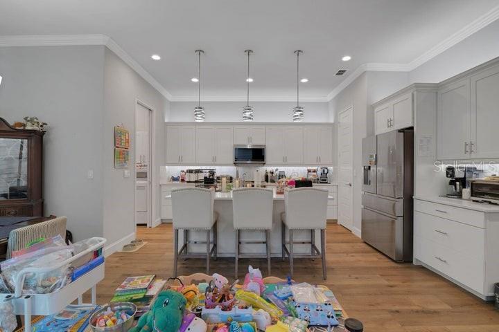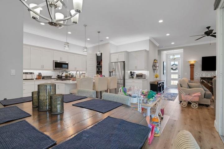 Step into this stunning 2020-built home in the highly desirable Grand Preserve of Kanapaha. Modern 2-story with 4 beds, 3 baths, and 2-car garage. Features luxury vinyl plank flooring throughout, crown molding, high-volume and tray ceilings, and innovative collapsing wall slider leading to a screened patio. The main level boasts a flowing open floor plan with a bedroom and full bath, while the upper level showcases versatile loft, primary en-suite with two walk-in closets, double vanity, and glass frameless shower. The chef's kitchen is a highlight, with quartz countertops, tiled backsplash, under-counter lighting, pantry, and spacious island with storage and seating. HOA includes cable, internet, front yard landscaping, pool, clubhouse, billiards. A must see; schedule your showing today!