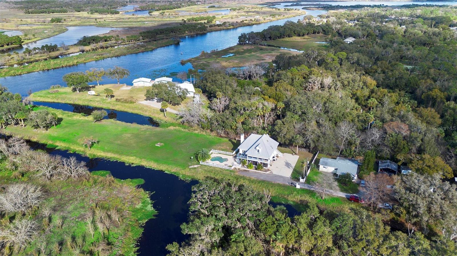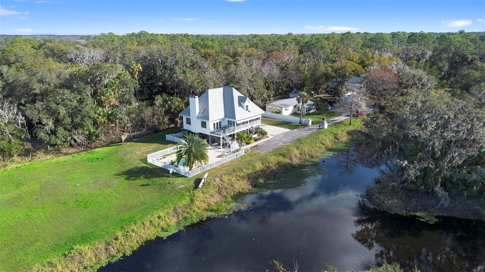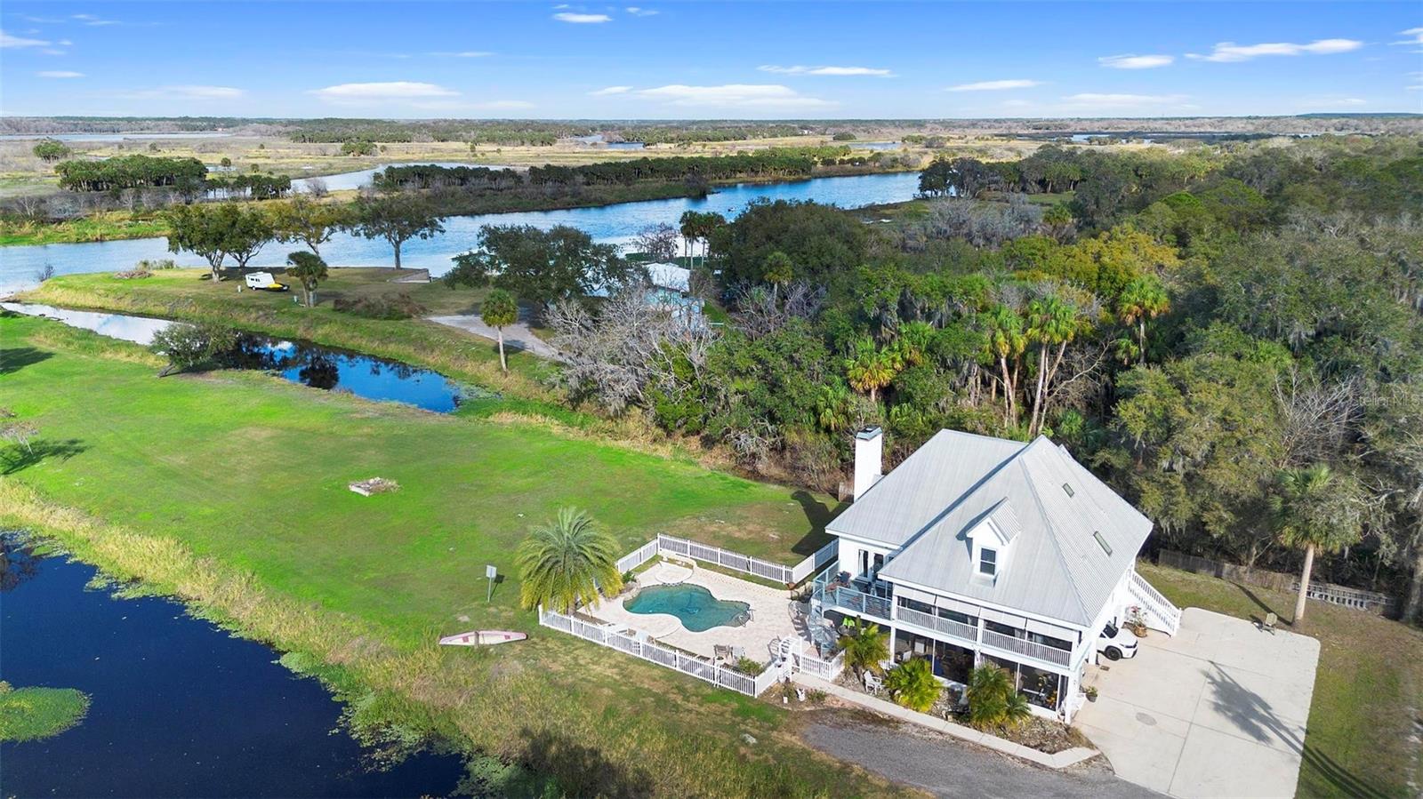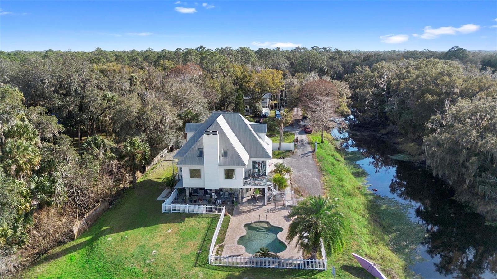 Experience true Florida living in this secluded gated custom built “Key West” architectural style pool home on “The Point” 150’ canal front home with riparian rights is a unique property with direct access to the St. Johns River and water views on three (3) sides, surrounded by county owned, never to be built on islands. Enjoy the breeze as you sit on the river and watch the boats go by. No expense spared when building this home. Extras include Pilings drilled 40 ft down into ground for structural integrity, foam backed vinyl siding for extra insulation a 50 year metal roof, tongue and groove wood ceilings on porches, extensive use of crown molding and tall baseboards throughout, double pane windows, Hurricane resistant french doors off dining and Pella french doors off living. just to name a few. Enjoy beautiful sunsets/relax on one of the three (3) outdoor porches with an outdoor summer kitchen and bath overlooking the open saltwater pool with optional therapy jets. Oversized carport 2-3 car is located under home (ceilings upgraded to metal for easy maintenance) Cargo lift elevator installed to bring items upstairs (up to 900 lb weight capacity) Upon entering the home you’ll be greeted with a 25’+- ceiling in living area, marble woodburning fireplace with raised hearth for seating, real Hardwood floors and custom wrought Iron staircase. Light and bright kitchen with ample cabinet space, panty, quartz countertops and wood ceilings. Master bedroom suite and bath and laundry located on main floor with second and third bedrooms, bath and loft upstairs. Perfect home for entertaining and enjoying true Florida living. Two additional parcels being conveyed ID#'s 32-19-32-300-0220-0000, 32-19-32-300-013A- Property adjacent to the subject to the north (approx. 2 acres) is owned by Seminole County. See attachments for additional information and surveys.