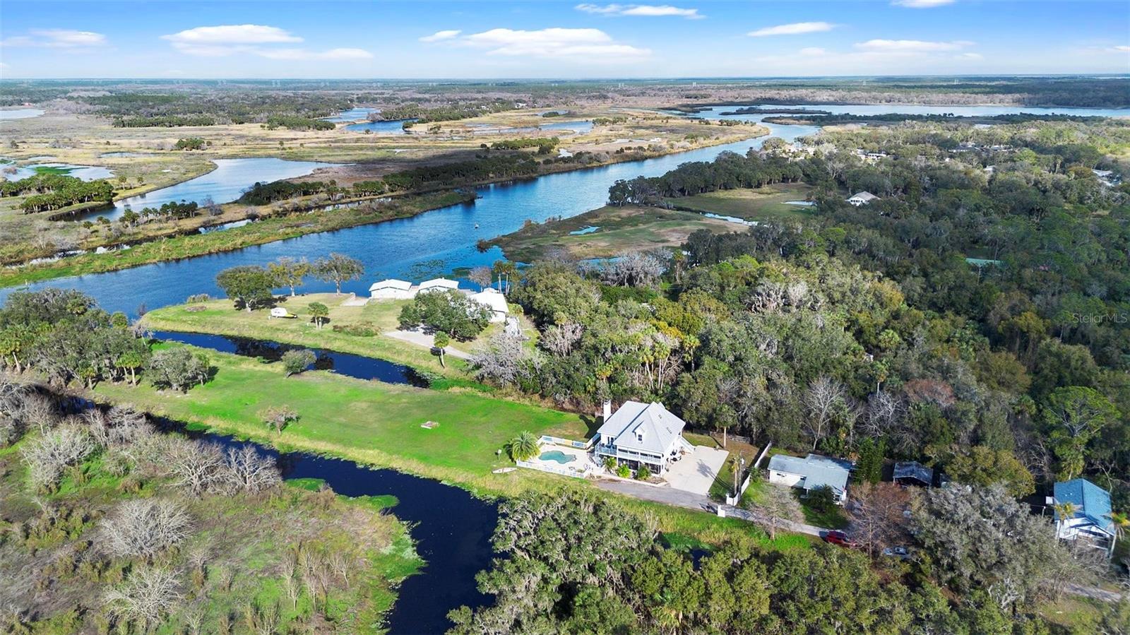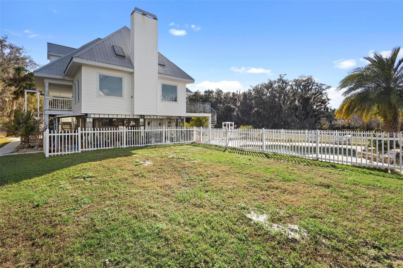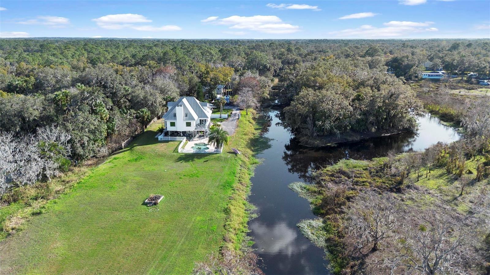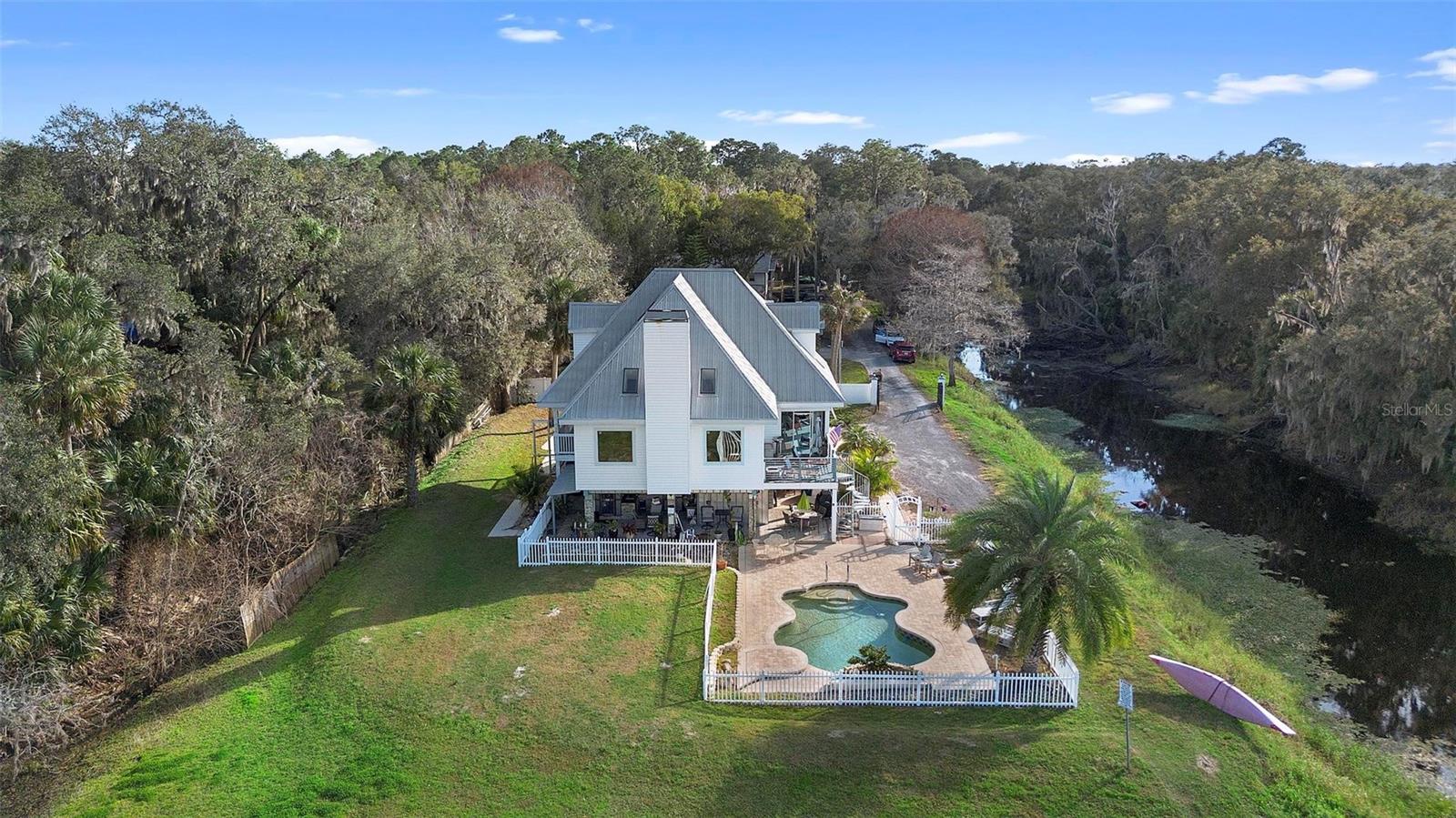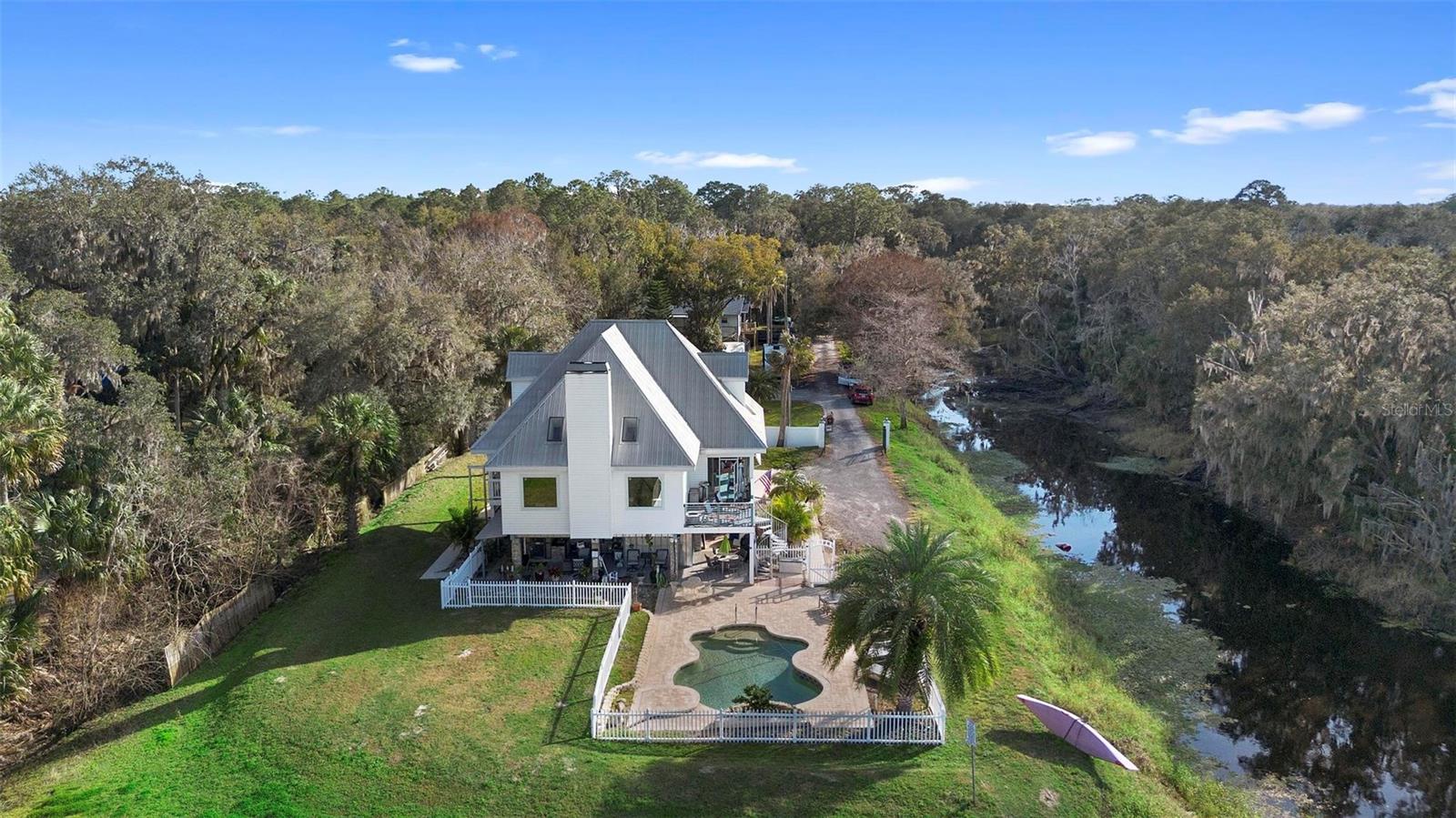 Experience true Florida living in this secluded gated custom built “Key West” architectural style pool home on “The Point” 150’ canal front home with riparian rights is a unique property with direct access to the St. Johns River and water views on three (3) sides, surrounded by county owned, never to be built on islands. Enjoy the breeze as you sit on the river and watch the boats go by. No expense spared when building this home. Extras include Pilings drilled 40 ft down into ground for structural integrity, foam backed vinyl siding for extra insulation a 50 year metal roof, tongue and groove wood ceilings on porches, extensive use of crown molding and tall baseboards throughout, double pane windows, Hurricane resistant french doors off dining and Pella french doors off living. just to name a few. Enjoy beautiful sunsets/relax on one of the three (3) outdoor porches with an outdoor summer kitchen and bath overlooking the open saltwater pool with optional therapy jets. Oversized carport 2-3 car is located under home (ceilings upgraded to metal for easy maintenance) Cargo lift elevator installed to bring items upstairs (up to 900 lb weight capacity) Upon entering the home you’ll be greeted with a 25’+- ceiling in living area, marble woodburning fireplace with raised hearth for seating, real Hardwood floors and custom wrought Iron staircase. Light and bright kitchen with ample cabinet space, panty, quartz countertops and wood ceilings. Master bedroom suite and bath and laundry located on main floor with second and third bedrooms, bath and loft upstairs. Perfect home for entertaining and enjoying true Florida living. Two additional parcels being conveyed ID#'s 32-19-32-300-0220-0000, 32-19-32-300-013A- Property adjacent to the subject to the north (approx. 2 acres) is owned by Seminole County. See attachments for additional information and surveys.