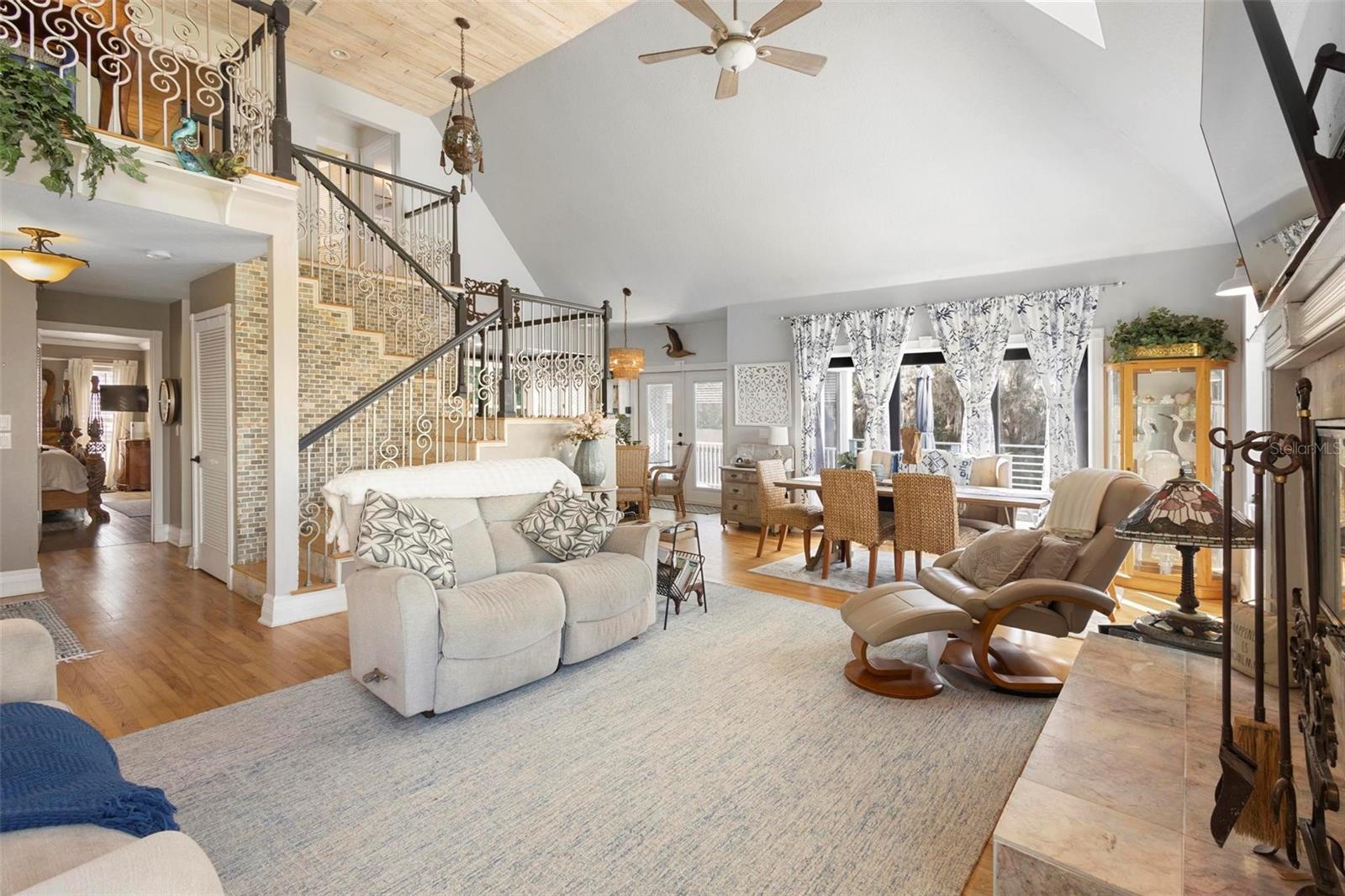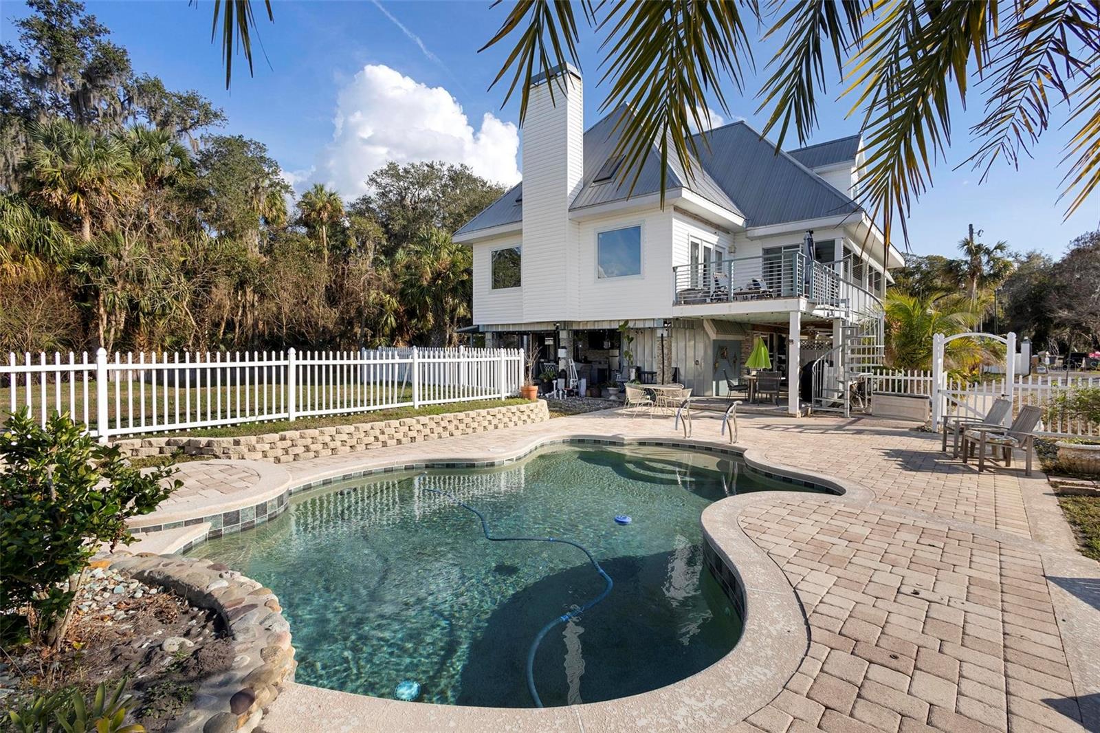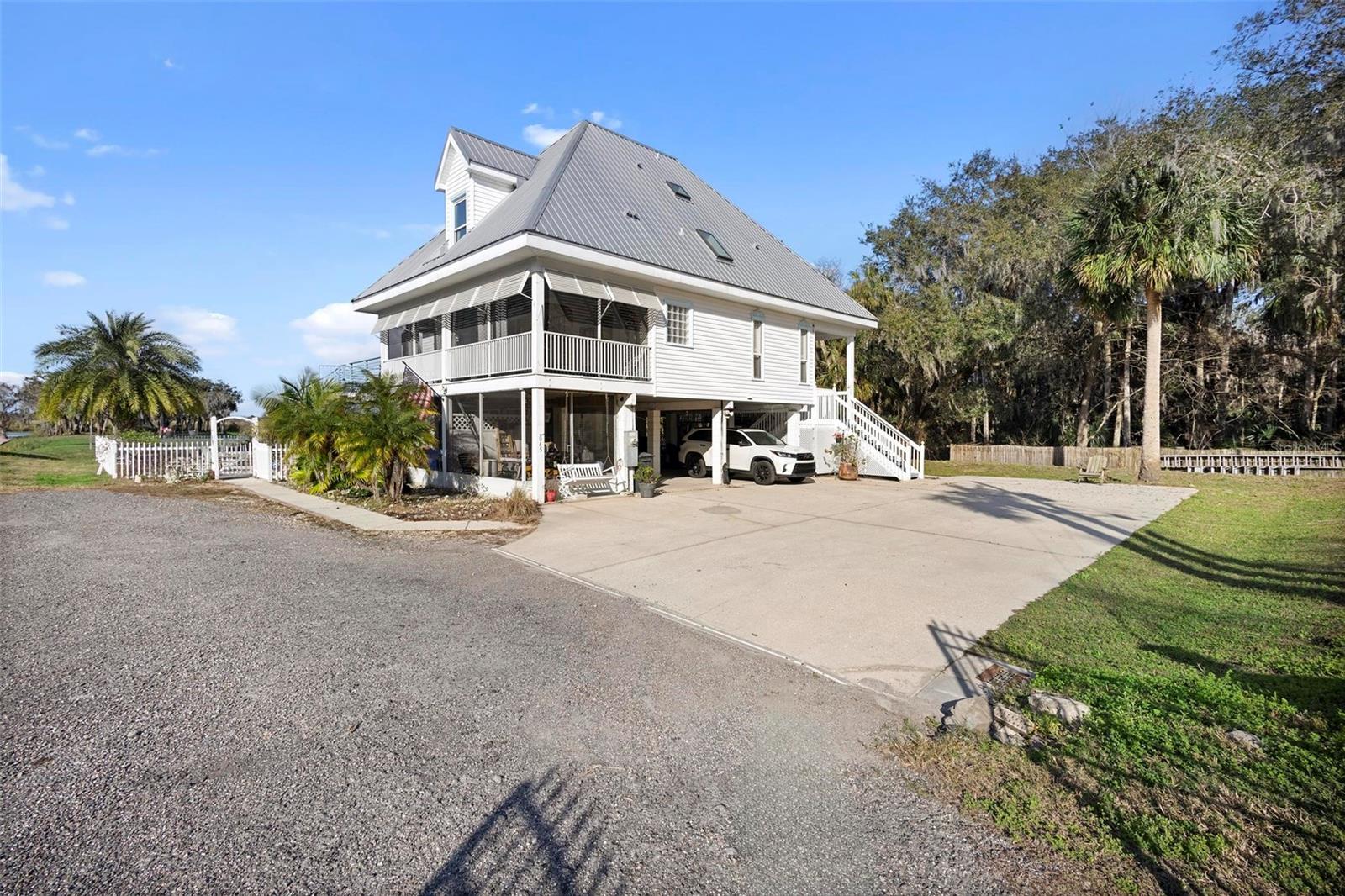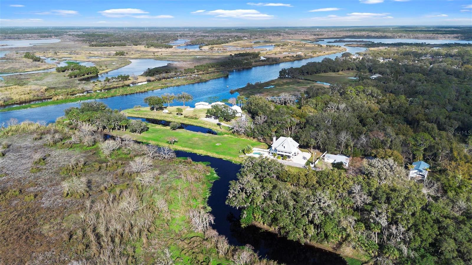 Experience true Florida living in this secluded gated custom built “Key West” architectural style pool home on “The Point” 150’ canal front home with riparian rights is a unique property with direct access to the St. Johns River and water views on three (3) sides, surrounded by county owned, never to be built on islands. Enjoy the breeze as you sit on the river and watch the boats go by. No expense spared when building this home. Extras include Pilings drilled 40 ft down into ground for structural integrity, foam backed vinyl siding for extra insulation a 50 year metal roof, tongue and groove wood ceilings on porches, extensive use of crown molding and tall baseboards throughout, double pane windows, Hurricane resistant french doors off dining and Pella french doors off living. just to name a few. Enjoy beautiful sunsets/relax on one of the three (3) outdoor porches with an outdoor summer kitchen and bath overlooking the open saltwater pool with optional therapy jets. Oversized carport 2-3 car is located under home (ceilings upgraded to metal for easy maintenance) Cargo lift elevator installed to bring items upstairs (up to 900 lb weight capacity) Upon entering the home you’ll be greeted with a 25’+- ceiling in living area, marble woodburning fireplace with raised hearth for seating, real Hardwood floors and custom wrought Iron staircase. Light and bright kitchen with ample cabinet space, panty, quartz countertops and wood ceilings. Master bedroom suite and bath and laundry located on main floor with second and third bedrooms, bath and loft upstairs. Perfect home for entertaining and enjoying true Florida living. Two additional parcels being conveyed ID#'s 32-19-32-300-0220-0000, 32-19-32-300-013A- Property adjacent to the subject to the north (approx. 2 acres) is owned by Seminole County. See attachments for additional information and surveys.