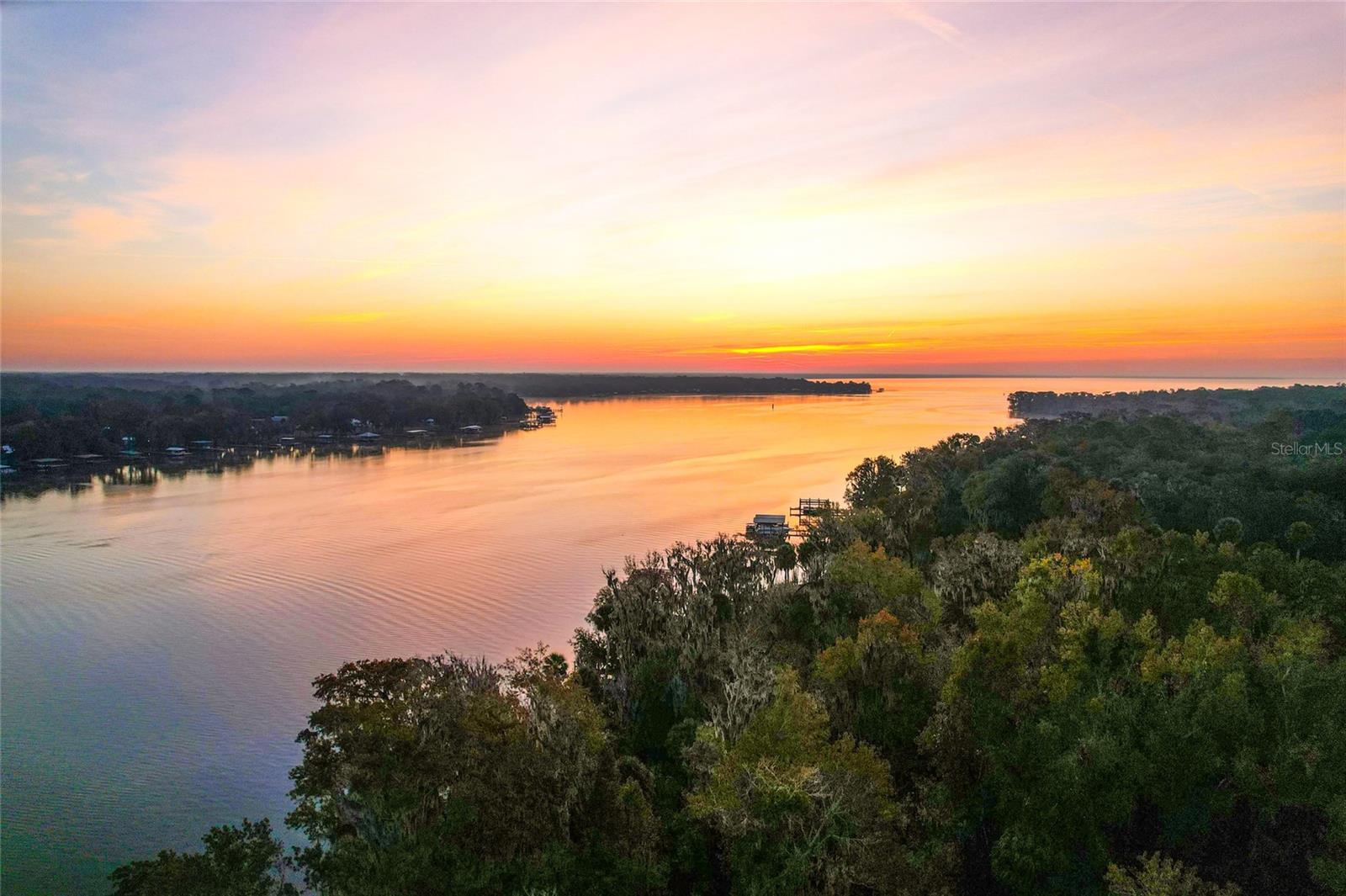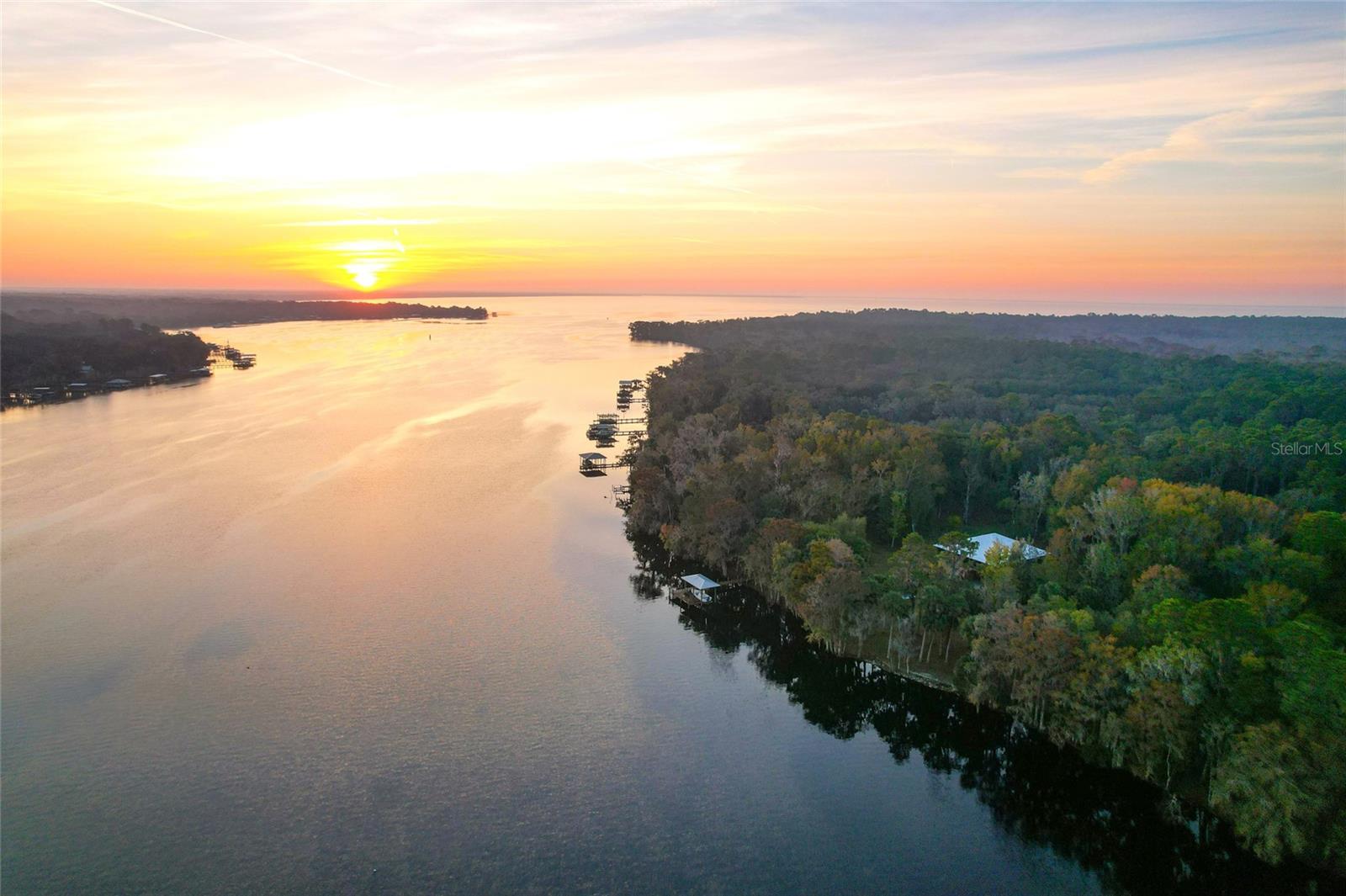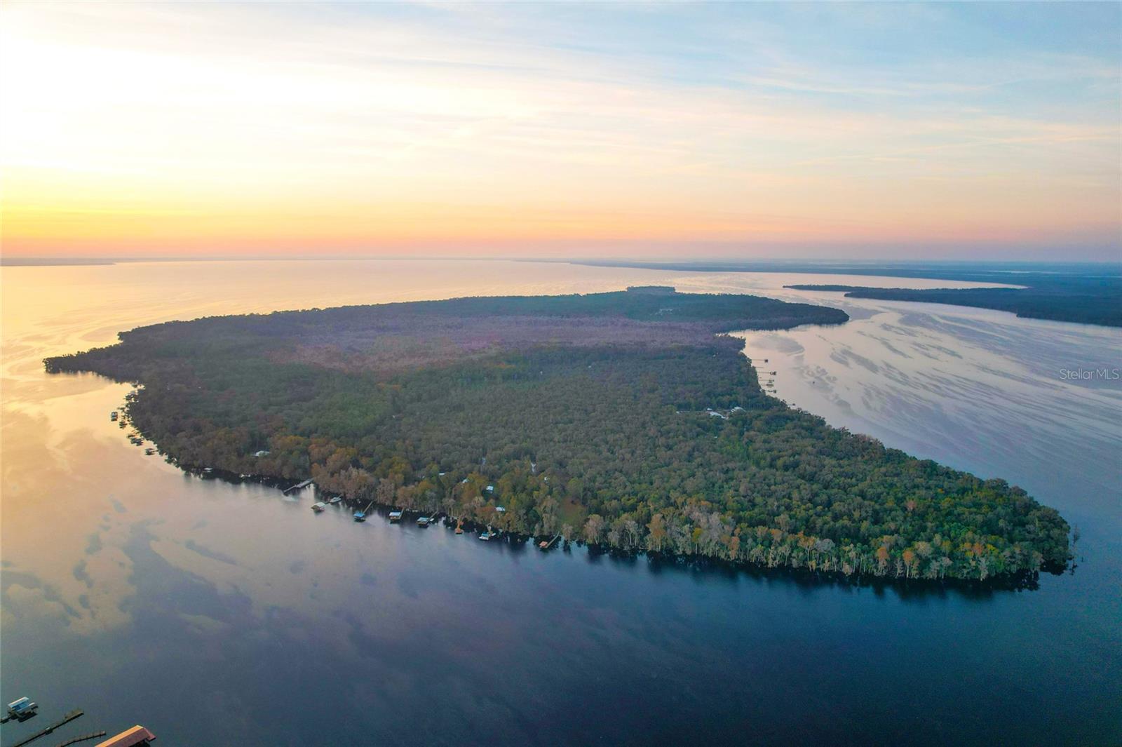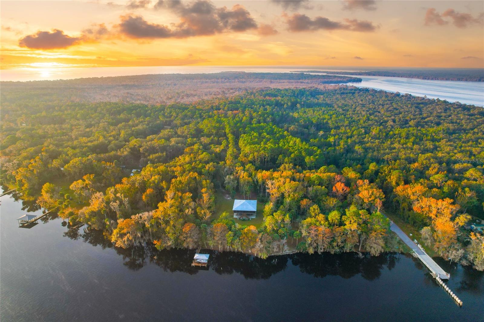 Discover an extraordinary private retreat where modern craftsmanship meets untouched natural beauty. Set on 6.37 secluded acres with 284 ft of pristine St. Johns River frontage on two build-able lots, this elevated 2- bedroom, 2.5 bath residence built in 2017 offers a rare blend of sophistication, serenity, and exclusivity. A grand wrap of 1,536 sq ft of screened porches frames the home, creating effortless indoor/outdoor living with panoramic river views. Inside, 1,915 sq ft of living space features an open-concept great room with gas fireplace and river-facing sliders. The chef’s kitchen showcases hand-selected granite with river-inspired veining, Bosch appliances, a walk-in pantry, and abundant cabinet storage with pullouts. The primary suite opens through French doors to the back porch where tranquil wooded views and evening breezes create a relaxing respite from city life. This room features a large walk-in closet and private bathroom with double-sink vanity and beautifully crafted tile shower. The guest suite has large windows with wooded views and two closets for extra storage, while the separate, second bathroom features a walk-in shower and large single vanity. A spacious, spray-insulated walk-able attic, meticulously maintained systems, and interior weather-protected staircase ensure year-round comfort and convenience. The enclosed portion of the ground level includes a mudroom, half bath, storage room, utility sink, and a secondary refrigerator – ideal for extended stays or entertaining. Outdoor living is unparalleled. A remote-controlled covered boat lift with 5,000 pound weight capacity, private dock, fortified concrete seawall, pavered fire-pit, and spacious covered patio with 1,100 square feet of pavers create the perfect setting for boating, fishing, wildlife viewing, or simply enjoying the peaceful surroundings. This unique property offers unmatched tranquility, natural beauty and a true escape to the laid-back lifestyle of Drayton Island living. With direct access to Lake George, Florida’s second largest lake, and close proximity to some of Florida’s most celebrated freshwater springs, recreation is right at your doorstep. Watch wild turkeys and deer stroll across the yard, spot manatees and river otters in the water, and enjoy prolific bird-life, including bald eagles, ospreys, herons, egrets, owls and other migrating species. World-class bass fishing, dark-sky stargazing, and sweeping river vistas elevate the experience to something truly extraordinary. Other notable features of this property include a fenced garden complete with its own irrigation system and a 12x20 custom shed for plenty of extra storage. Accessible only by private vessel or county run ferry, Drayton Island offers unmatched privacy and the rare luxury of true escape while still within reach of Orlando, Jacksonville, St. Augustine, and Daytona. Just minutes by boat to marinas, local restaurants and essential conveniences, this property presents a rare opportunity to own a waterfront estate surrounded by luxury, nature, and absolute tranquility... This is not just a home – it’s a lifestyle, a sanctuary, and a legacy property.
