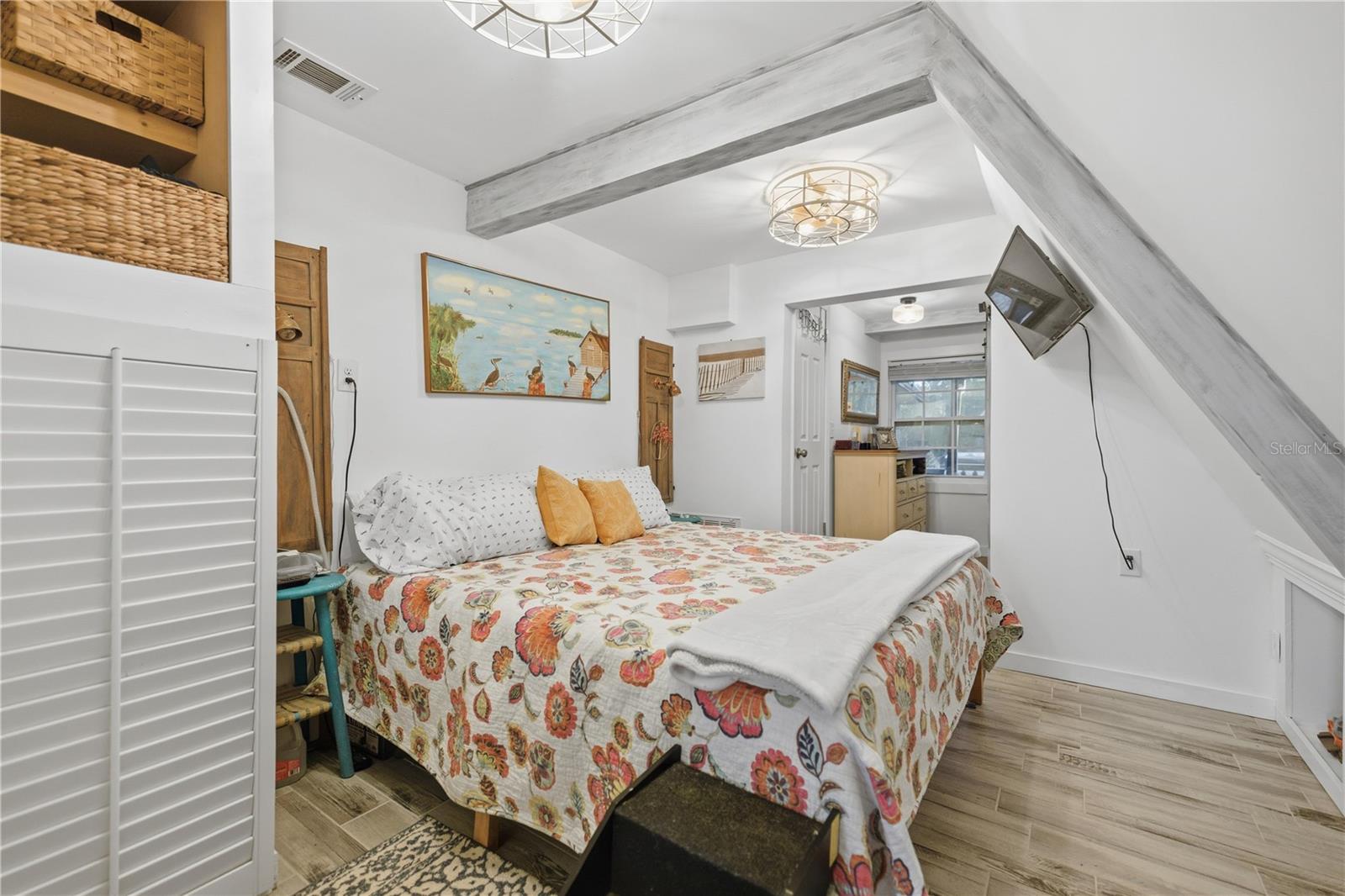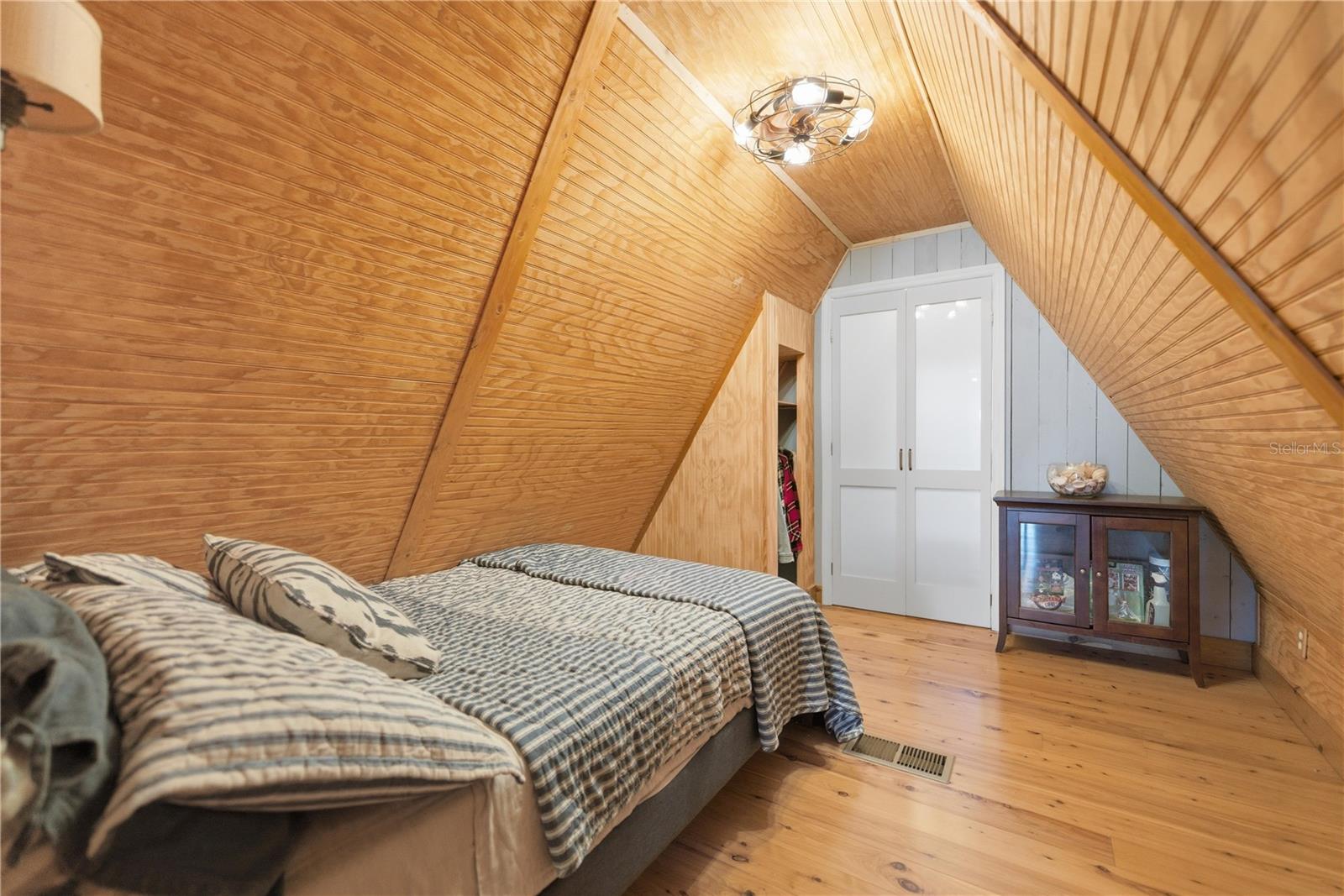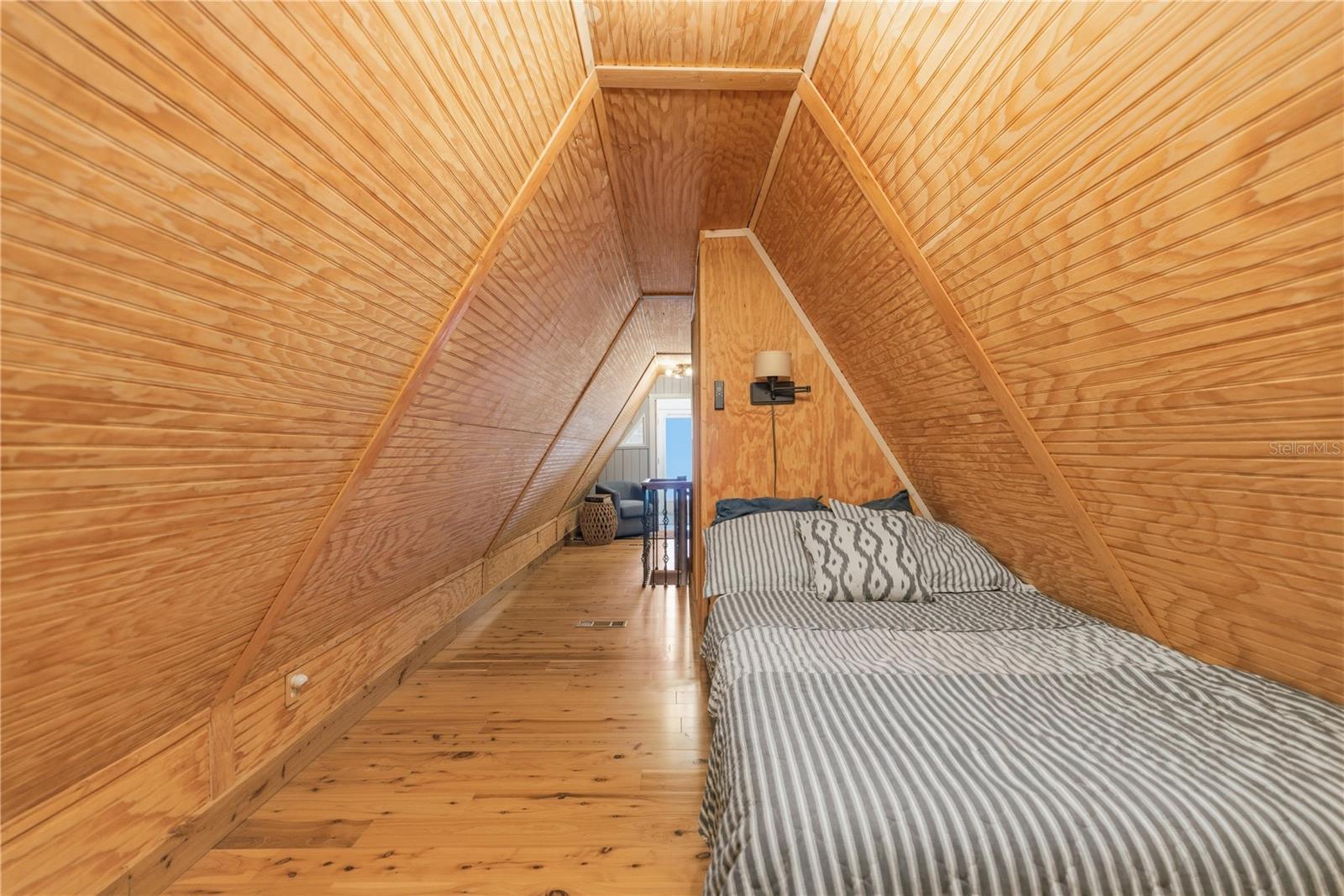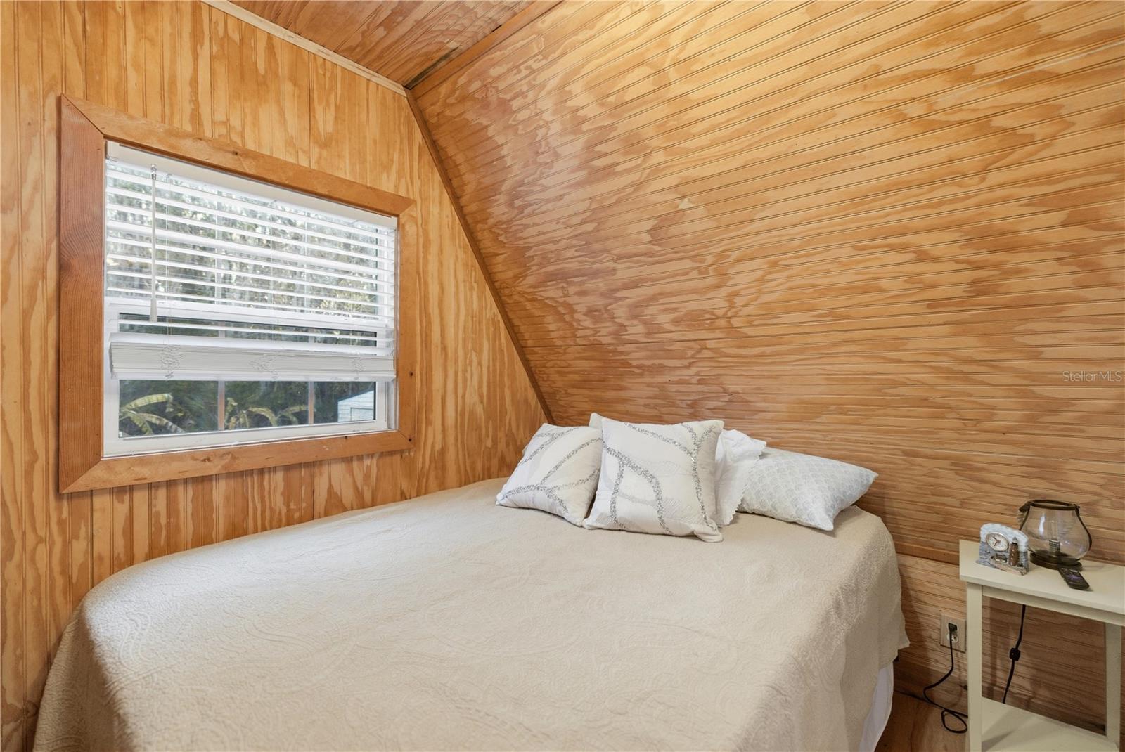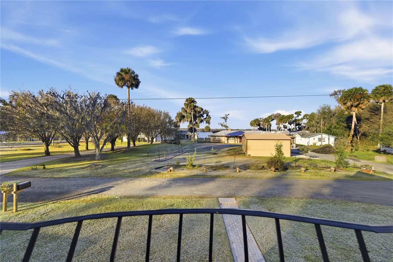 This fully remodeled, fully furnished A-frame with views of Lake George is an ideal vacation rental or personal retreat in peaceful Georgetown, Florida.Thoughtfully updated from top to bottom, this home blends modern finishes with timeless character and incredible indoor-outdoor living. The kitchen is a true showpiece, featuring beautiful shiplap walls, sleek modern appliances, and warm butcher block countertops. Tastefully selected tile flooring flows throughout the entire downstairs, creating a cohesive and durable living space. The primary bedroom and full ensuite bathroom are conveniently located on the main level, offering comfort and privacy. In the living room, a freshly painted spiral staircase with new treads leads upstairs, adding architectural interest and charm. The upper level showcases stunning hardwood flooring throughout, with luxury vinyl plank flooring in the half bathroom. Two upstairs bedrooms provide flexible living options—one private bedroom comfortably fits a full-size bed and includes a small closet and a window overlooking the backyard, while the second bedroom easily accommodates a full-size bed with additional space for a sitting area. Upstairs at the front of the home, a versatile flex space features an exterior door that opens to a balcony overlooking Lake George—an ideal spot to enjoy unforgettable sunsets and tranquil water views. Outdoor living is just as impressive, with a large screened-in back porch perfect for relaxing or entertaining, and a thoughtfully designed mudroom that provides a functional entry into the home. The property spans two lots totaling approximately 0.65 acres, offering privacy and room to spread out. Additional highlights include a whole-house propane generator (excluding AC), a 28 x 24 detached garage ideal for boats or RVs, and a separate laundry/storage building—perfect for hosting guests. Located with views of scenic Lake George, this home is surrounded by boating, fishing, kayaking, and abundant wildlife, making it a highly desirable vacation destination. Georgetown’s laid-back, Old Florida charm and stunning sunsets create an unforgettable guest experience, ideal for short-term rentals, weekend getaways, or seasonal stays. This one-of-a-kind Lake George property combines modern upgrades, generous space, and serene natural surroundings—perfect as a full-time residence or a peaceful getaway. Don't miss this opportunity to own this one-of-a-kind property in Old Florida!