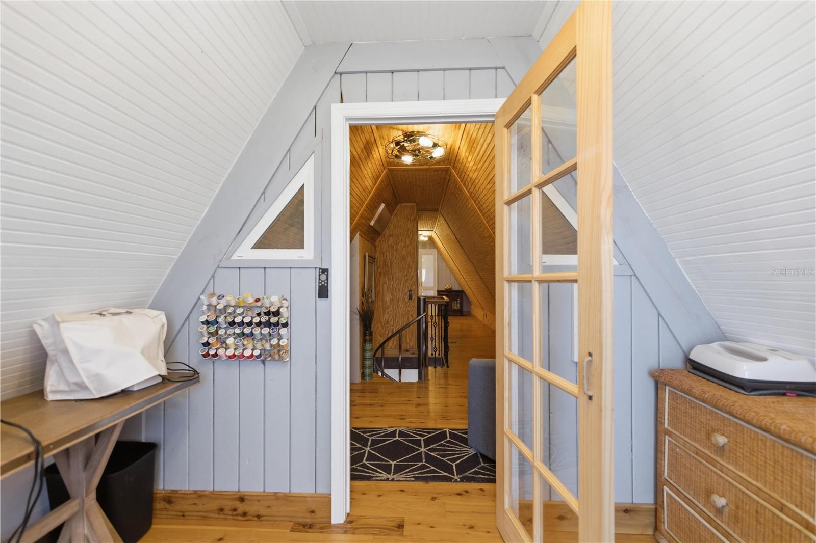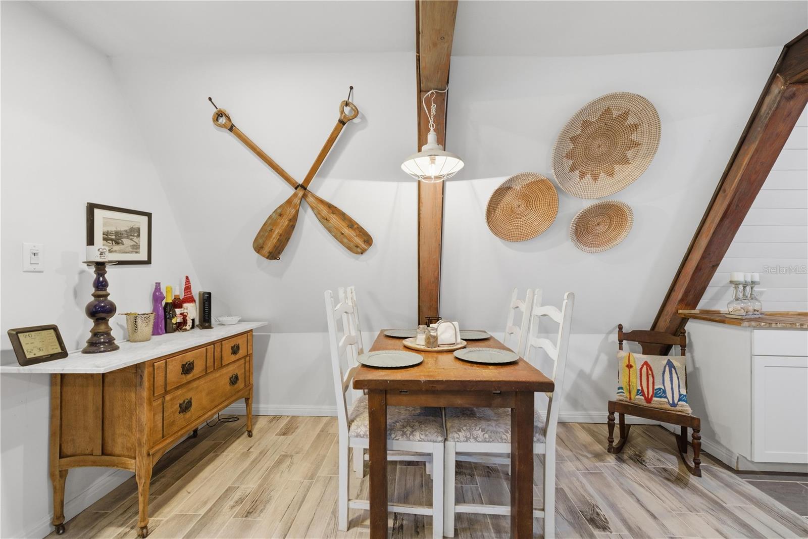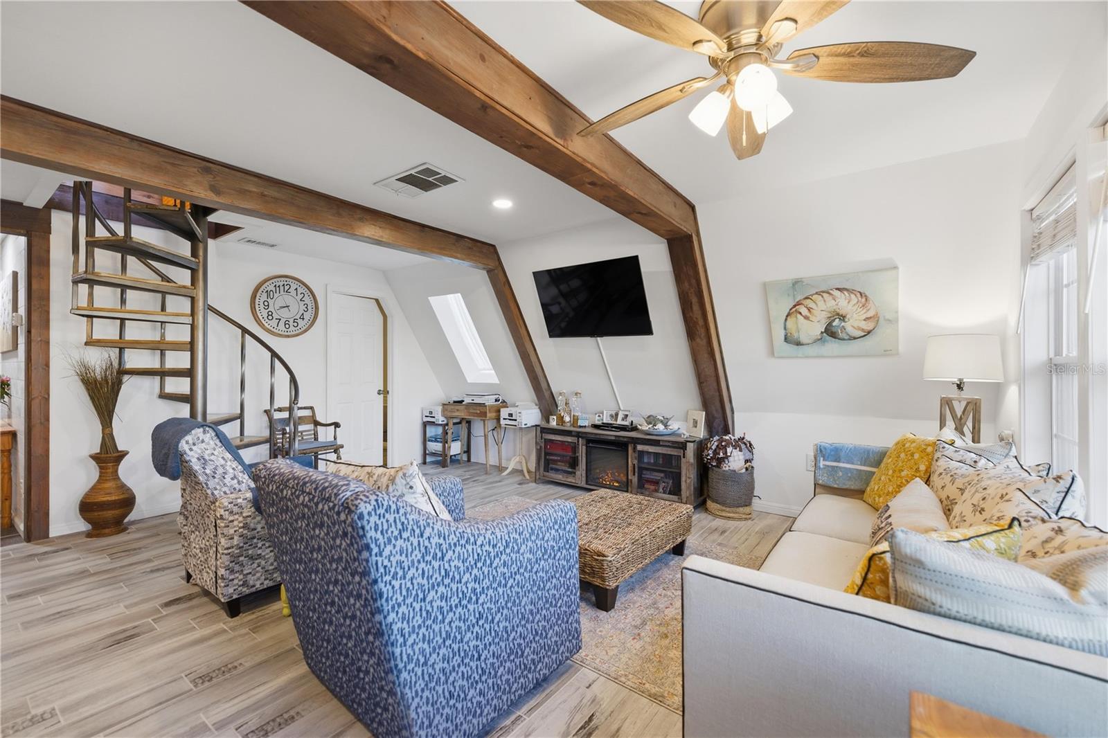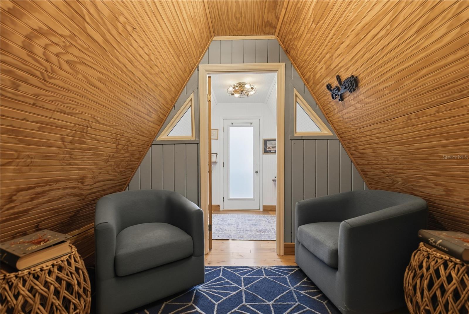 This fully remodeled, fully furnished A-frame with views of Lake George is an ideal vacation rental or personal retreat in peaceful Georgetown, Florida.Thoughtfully updated from top to bottom, this home blends modern finishes with timeless character and incredible indoor-outdoor living. The kitchen is a true showpiece, featuring beautiful shiplap walls, sleek modern appliances, and warm butcher block countertops. Tastefully selected tile flooring flows throughout the entire downstairs, creating a cohesive and durable living space. The primary bedroom and full ensuite bathroom are conveniently located on the main level, offering comfort and privacy. In the living room, a freshly painted spiral staircase with new treads leads upstairs, adding architectural interest and charm. The upper level showcases stunning hardwood flooring throughout, with luxury vinyl plank flooring in the half bathroom. Two upstairs bedrooms provide flexible living options—one private bedroom comfortably fits a full-size bed and includes a small closet and a window overlooking the backyard, while the second bedroom easily accommodates a full-size bed with additional space for a sitting area. Upstairs at the front of the home, a versatile flex space features an exterior door that opens to a balcony overlooking Lake George—an ideal spot to enjoy unforgettable sunsets and tranquil water views. Outdoor living is just as impressive, with a large screened-in back porch perfect for relaxing or entertaining, and a thoughtfully designed mudroom that provides a functional entry into the home. The property spans two lots totaling approximately 0.65 acres, offering privacy and room to spread out. Additional highlights include a whole-house propane generator (excluding AC), a 28 x 24 detached garage ideal for boats or RVs, and a separate laundry/storage building—perfect for hosting guests. Located with views of scenic Lake George, this home is surrounded by boating, fishing, kayaking, and abundant wildlife, making it a highly desirable vacation destination. Georgetown’s laid-back, Old Florida charm and stunning sunsets create an unforgettable guest experience, ideal for short-term rentals, weekend getaways, or seasonal stays. This one-of-a-kind Lake George property combines modern upgrades, generous space, and serene natural surroundings—perfect as a full-time residence or a peaceful getaway. Don't miss this opportunity to own this one-of-a-kind property in Old Florida!