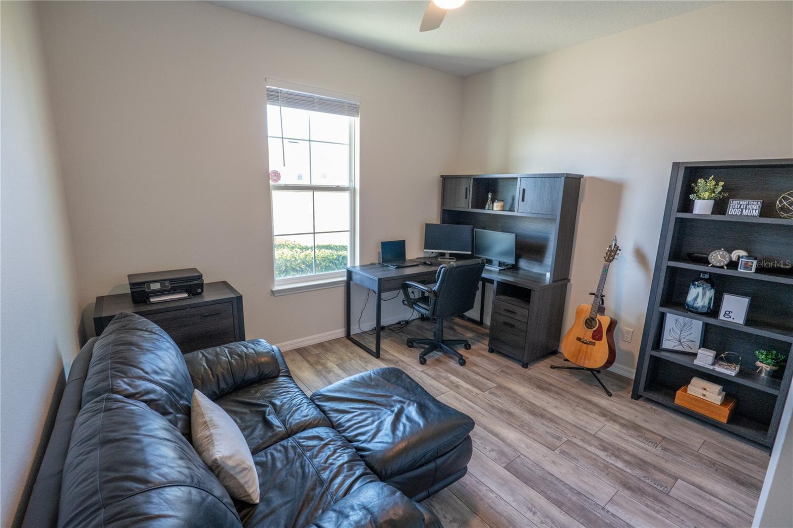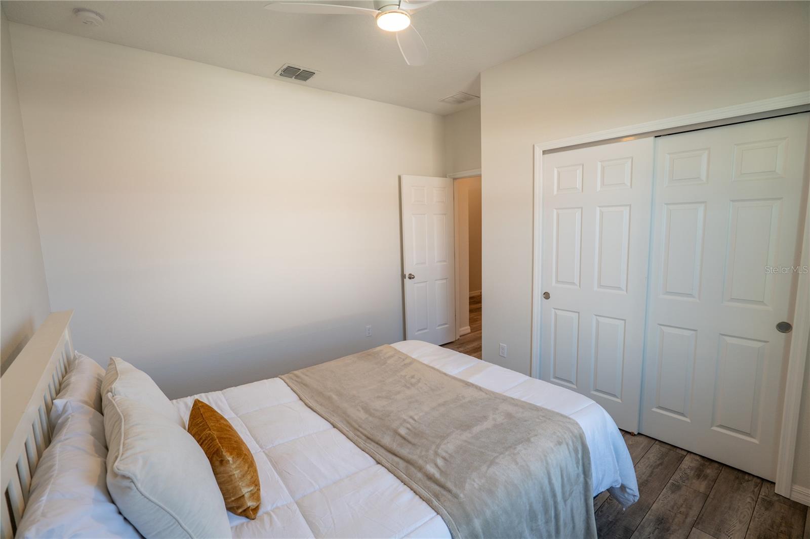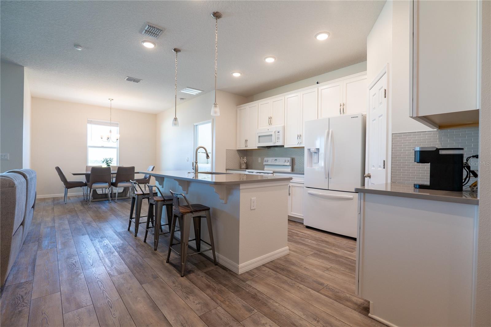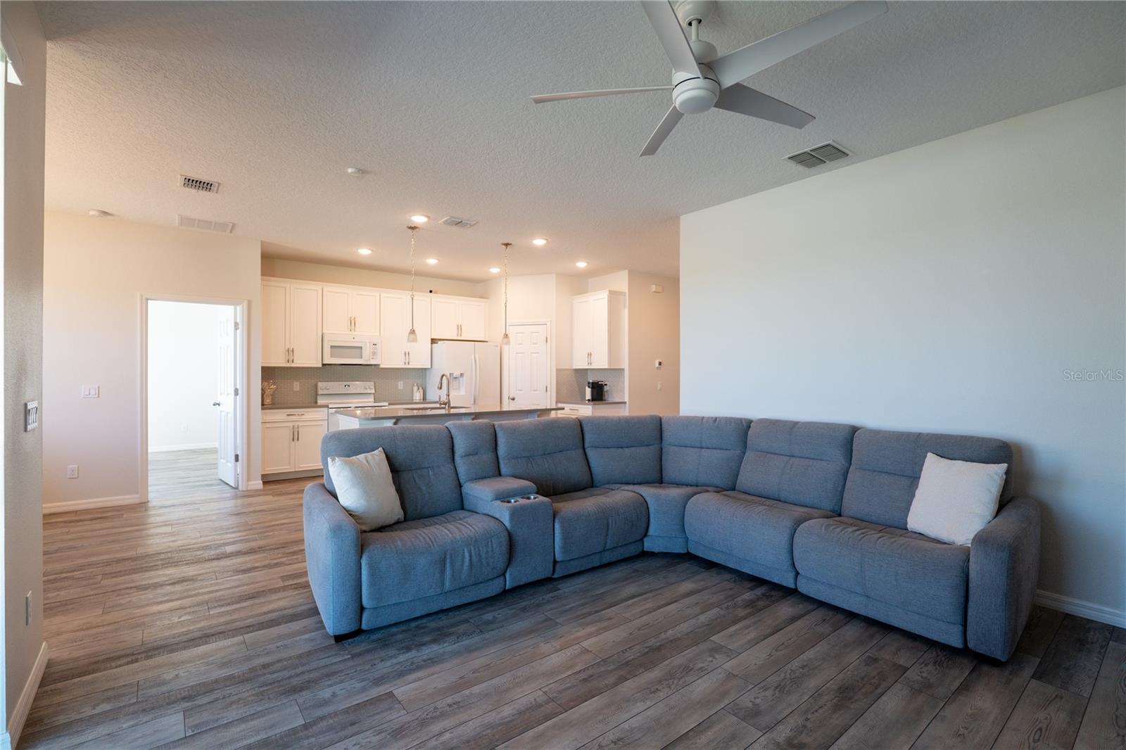 Better than new, this move-in-perfect home boasts numerous upgrades and breathtaking views that will leave you feeling like you're living on top of the world. Enjoy panoramic vistas for miles & miles, including a distant peak @ the lake. Inside, you’ll find luxury vinyl flooring, sleek quartz countertops, a stylish backsplash, and spacious 42-inch cabinets. The home also features a fully fenced backyard, providing privacy and security. Bright and airy, the open floor plan invites natural light to flood the space, creating a warm and welcoming atmosphere. Relax on the covered back porch or patio, where you'll always feel a cool breeze high up on the hill. Off the patio is a gravel fire pit area perfect for a relaxing evening by the fire or for marshmallow roasts! Community amenities include a sparkling pool and playground, and you’re just 1.7 miles from public access & boat ramp at Marsh on Lake Yale, one of Florida's top bass fishing destinations. Built for energy efficiency with double-paned glass windows and sturdy concrete block construction, this home offers both comfort and sustainability. Conveniently located close to The Attractions, The Villages, Eustis, Mount Dora, and greater Orlando, this is the perfect blend of modern living and serene nature. Paradise awaits. Welcome home!