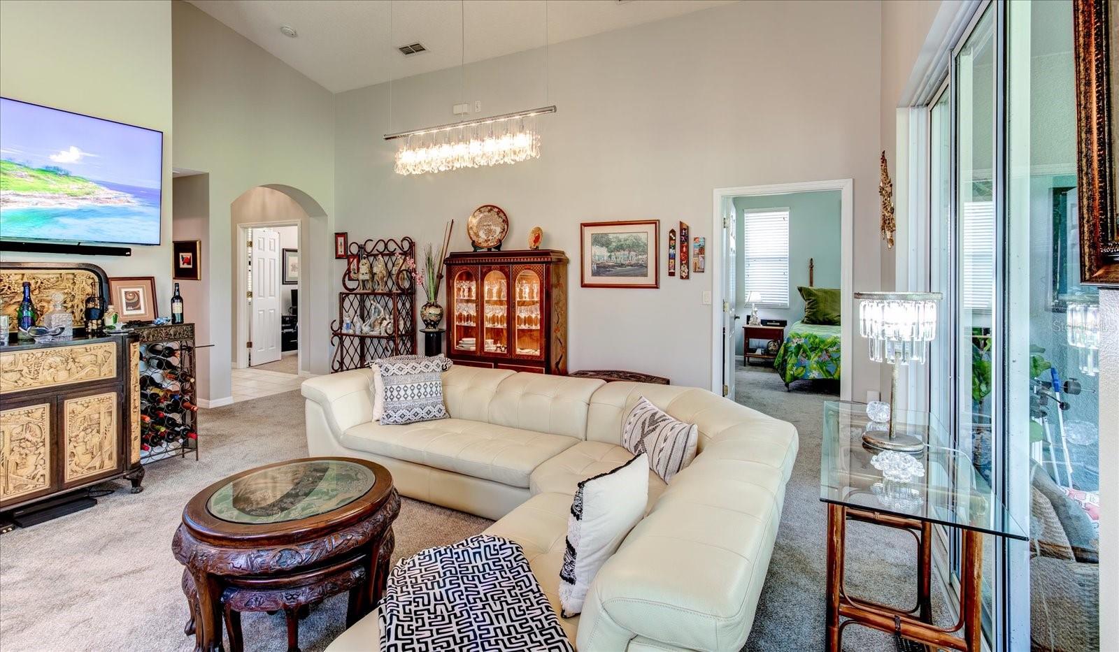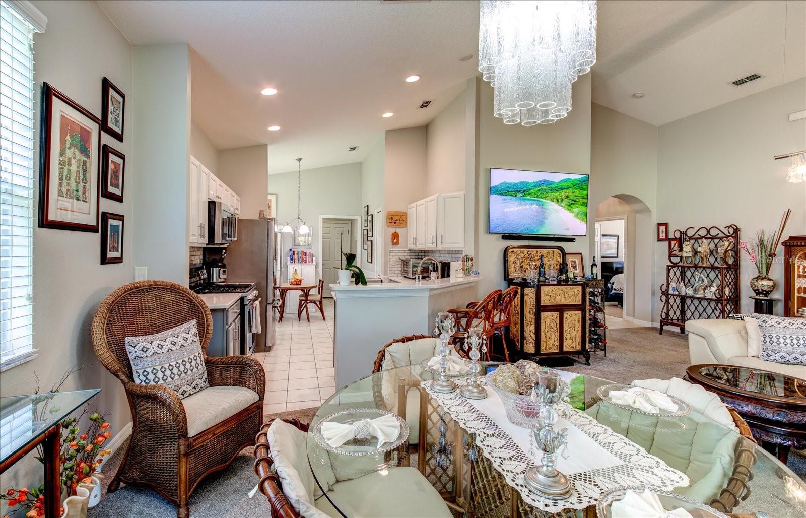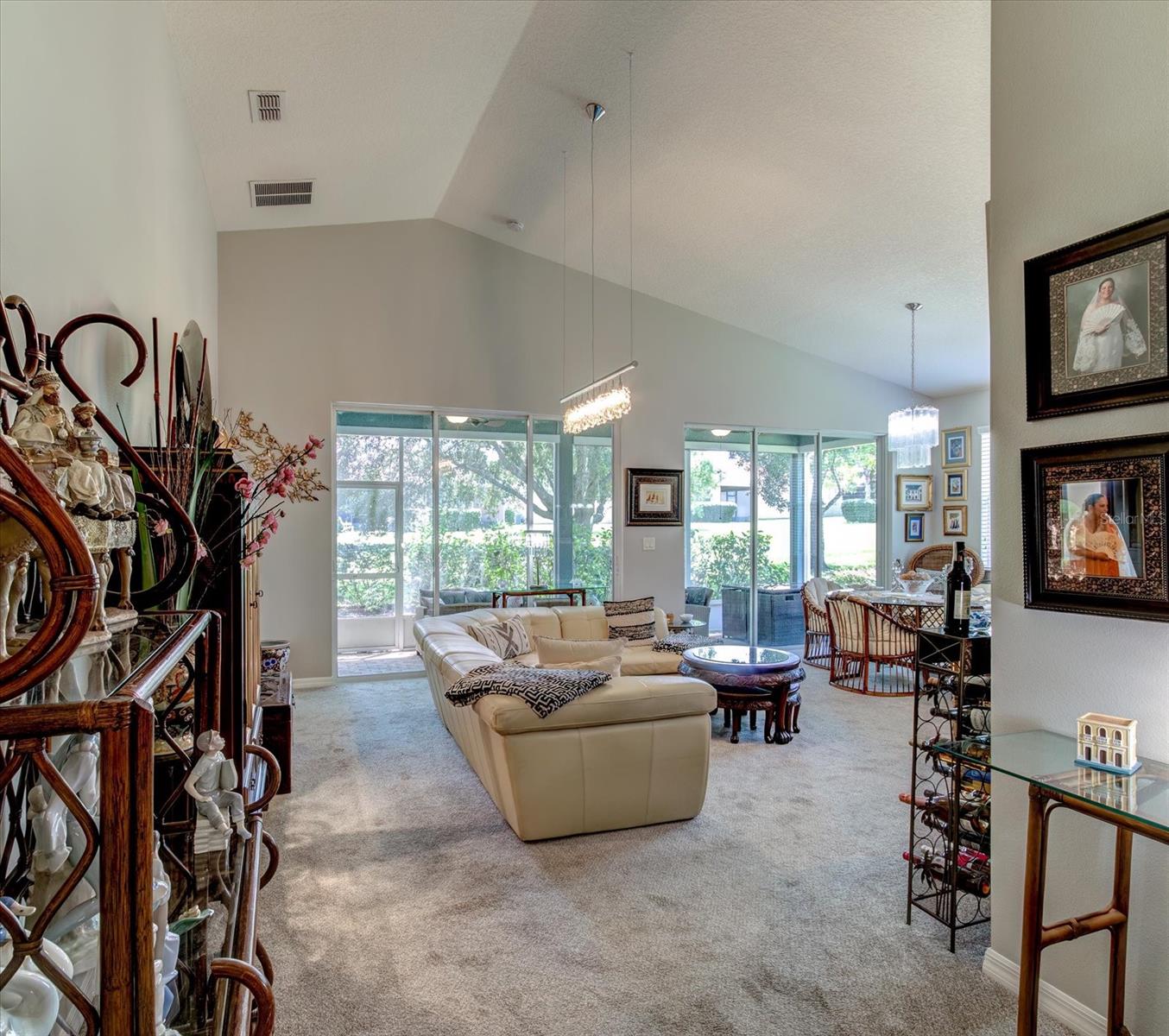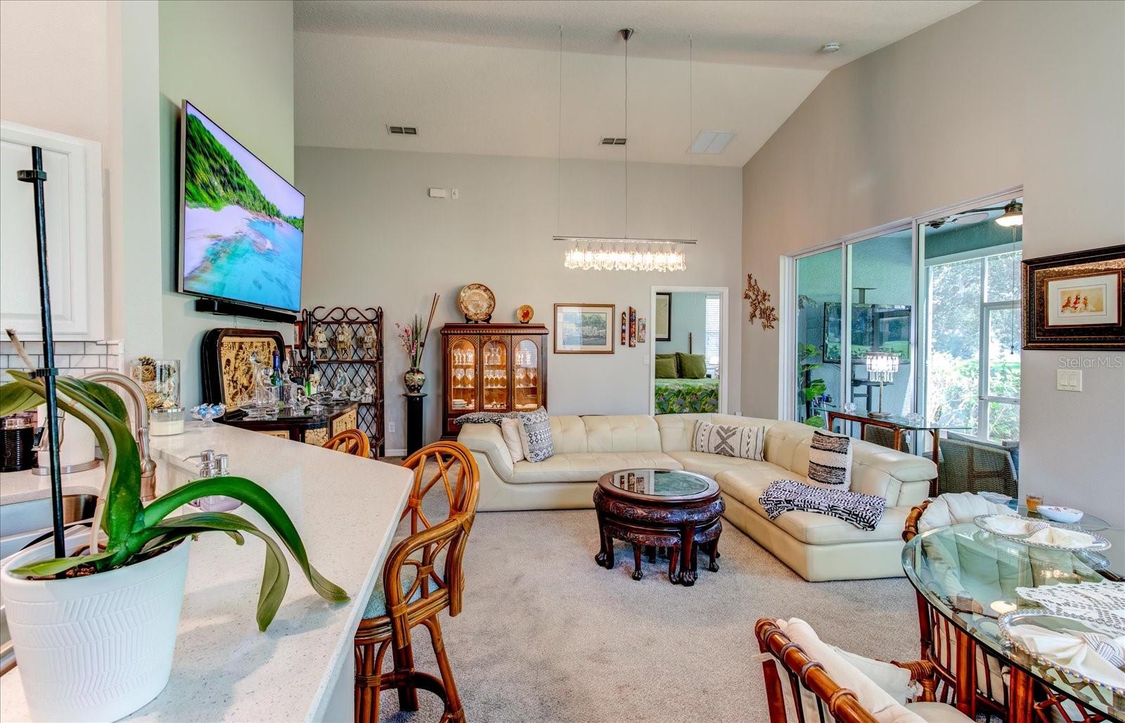 (Central Florida) Exceptional Home in a Premier 55+ Trilogy Cascades of Groveland Community with FIVE STAR AMENITIES You will fall in love with this lovely contemporary three-bedroom/den, two-bathroom residence nestled on a generously sized lot, that boasts a lush backyard green belt and ultimate privacy from your neighbors. Located on a cul-de-sac street also adds additional privacy from the rest of the world. As you step into the inviting foyer, you will appreciate the open design of the OPEN FLOOR PLAN which lends itself to a feeling of a much larger home. The view of the lovely PARK LIKE SETTING captures your attention and makes you think about the days you could spend just relaxing on your screen enclosed patio. Enjoy the ambiance of the birds chirping and the lush, landscaped greenbelt. The open design features a split floor plan, with the second and third bedrooms located at the front, conveniently situated near a bathroom for additional privacy. One of these bedrooms can easily be transformed into a home office or den, offering versatility to suit your needs. The interior showcases a neutral palette, enhancing its appeal for every potential interior design that the buyer may wish to embrace. The upgraded kitchen is a true highlight, featuring brand NEW KITCHEN AID APPLIANCES, exquisite QUARTZ countertops, a stylish backsplash, and beautifully painted cabinetry that adds a designer touch. Plus, the kitchen is not only aesthetically pleasing but also highly functional, offering an eat-in area ideal for casual dining or planning your day's activities. The spacious living room seamlessly connects to the dining area, creating an inviting space for entertaining family and friends. Dual triple sliders lead from these living spaces to the lanai, extending your entertaining area outdoors with ELECTRICAL REMOTE-CONTROL SHADES add to the luxury and appeal for this home. Owner’s retreat is perfect for king size bed set and has a lovely view of the lovely, landscaped backyard. The inviting master bathroom features His/Her vanities with granite countertops, separate garden tub, and a separate enclosed water closet. Equipped with natural gas and the new air conditioner (2022) harmonizes comfort with modern convenience. The two-car garage includes overhead storage, ready to accommodate your vehicles and more. Community Amenities The HOA fees cover a range of amenities, including lawn and shrub maintenance, basic cable, internet with a landline, home security monitoring, streetlights, and access to the clubhouse amenities. AMENITIES FOR EVERYONE: Trilogy Cascades of Groveland is a beautiful, guard-gated community strategically centered around the magnificent 57000 square foot Magnolia House clubhouse where you can enjoy wonderful live entertainment and parties with your friends. Residents enjoy a wealth of amenities, including a full-service restaurant and bar, two gyms, indoor and outdoor pools, spas, a dog park, tennis, pickleball, bocce ball, and scenic walking trails. Additional features include a demonstration kitchen, massage room, dance studio, poker lounge, golf simulator and billiards. There is an activity for everyone one to enjoy. Come live the lifestyle you have always dreamed about!