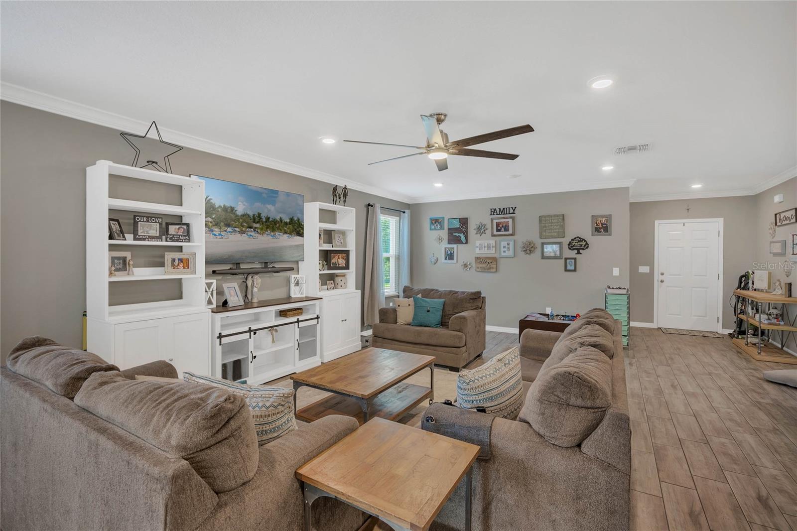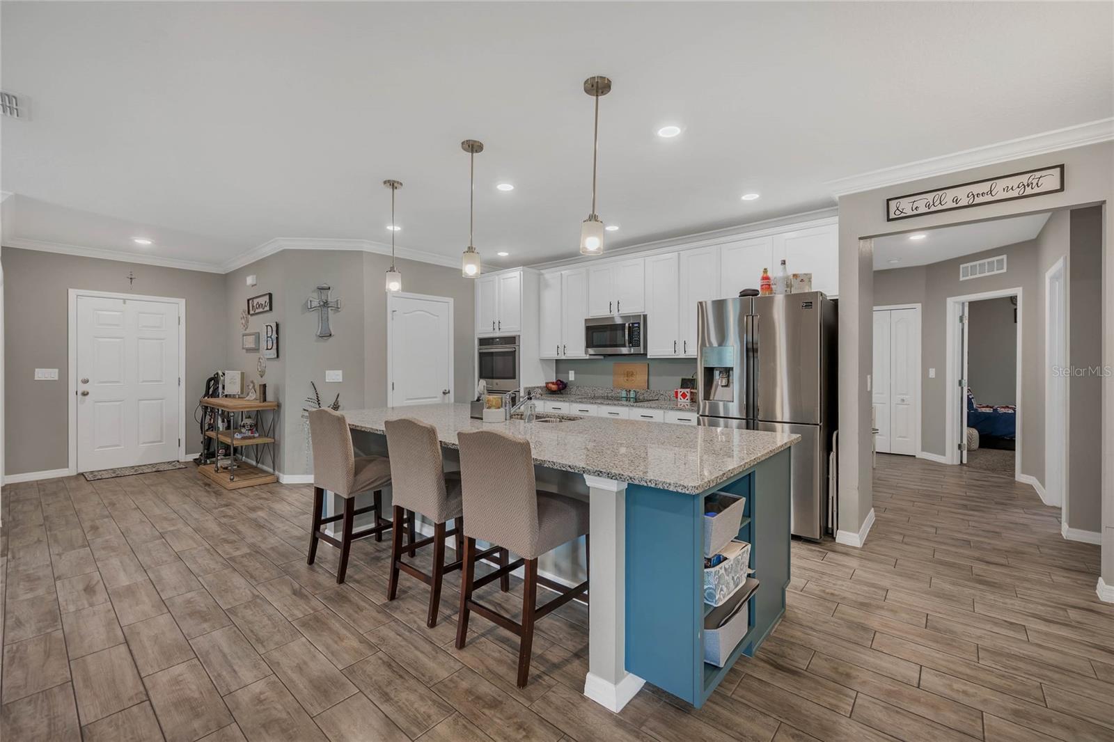 Welcome to this beautiful 3 bedroom, 2 bathroom home located in the growing City of Groveland. It’s easy to see that this home has been lightly lived in and loved. Just minutes from Publix, South Lake High school, Downtown Clermont and the new sports complex! For your piece-of-mind the homeowners are providing a 1 year home warranty with your new home. When you enter the home you are greeted by a bright, open floor concept. The office is situated to the right of the entry way with beautiful glass french doors. This space could be used for any number of things such as a play area, or 4th bedroom. The home features tile flooring throughout the main living spaces and laundry room. Your kitchen is outfit with stainless steel appliances and the grand island has shelving and sitting for your family, or guests. The 3 car garage has plenty of space and multiple storage options. Over-head ceiling storage and attic flooring will help to keep things tidied up! You're going to love your screened, covered patio...perfect for these beautiful Florida evenings and entertaining. You don’t want to miss out on this wonderful home…call and schedule your showing today!