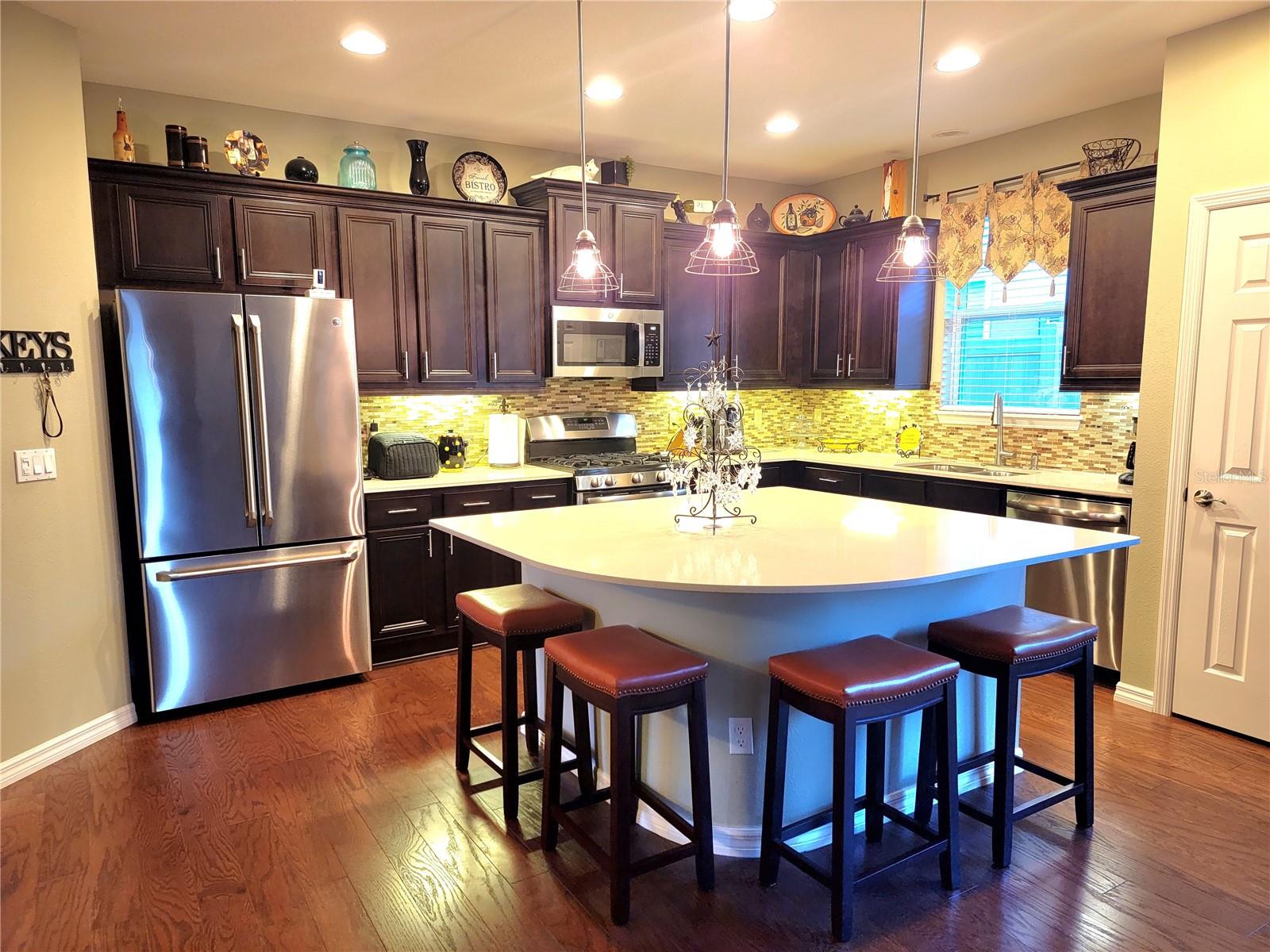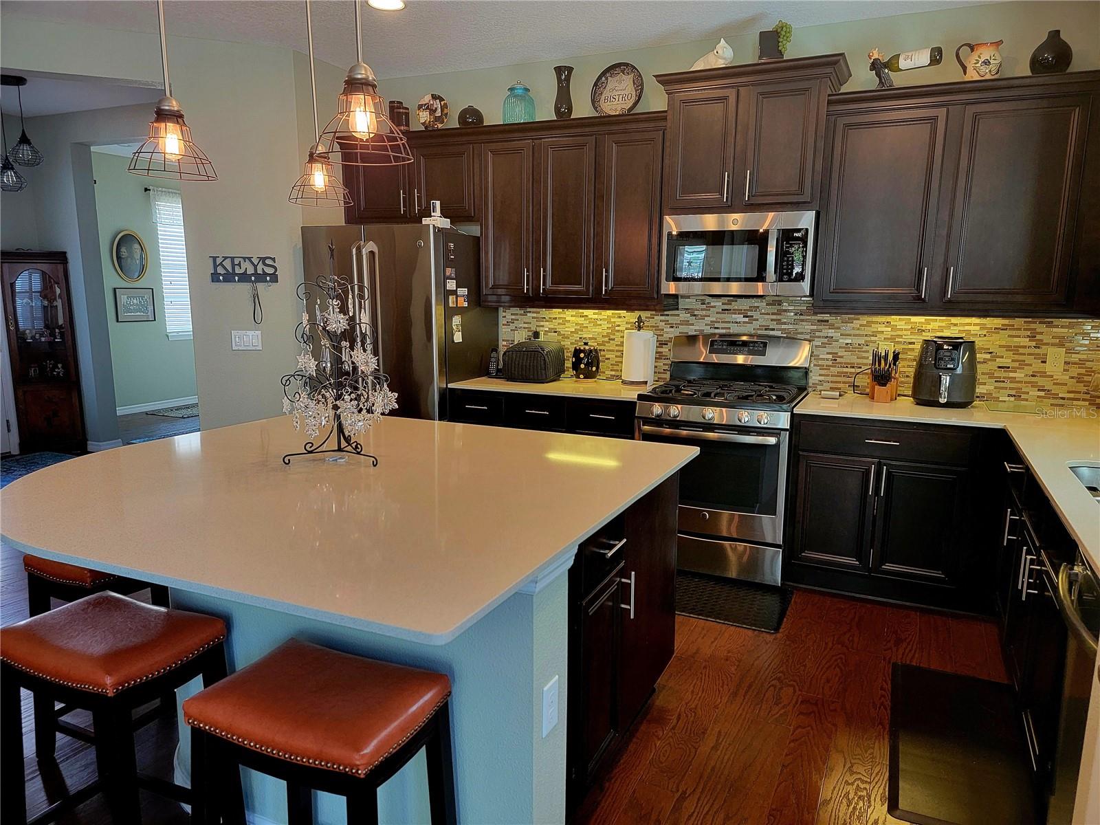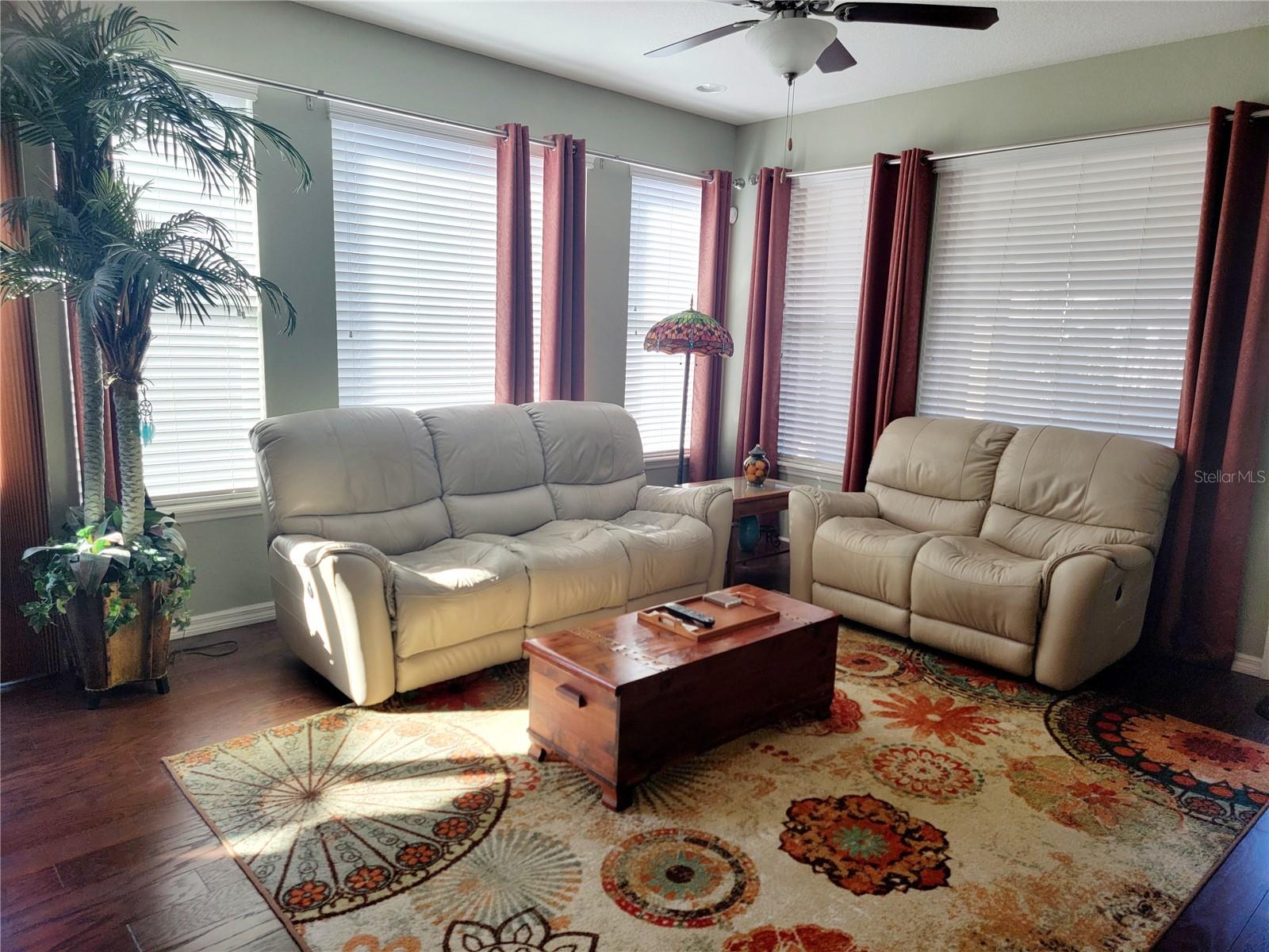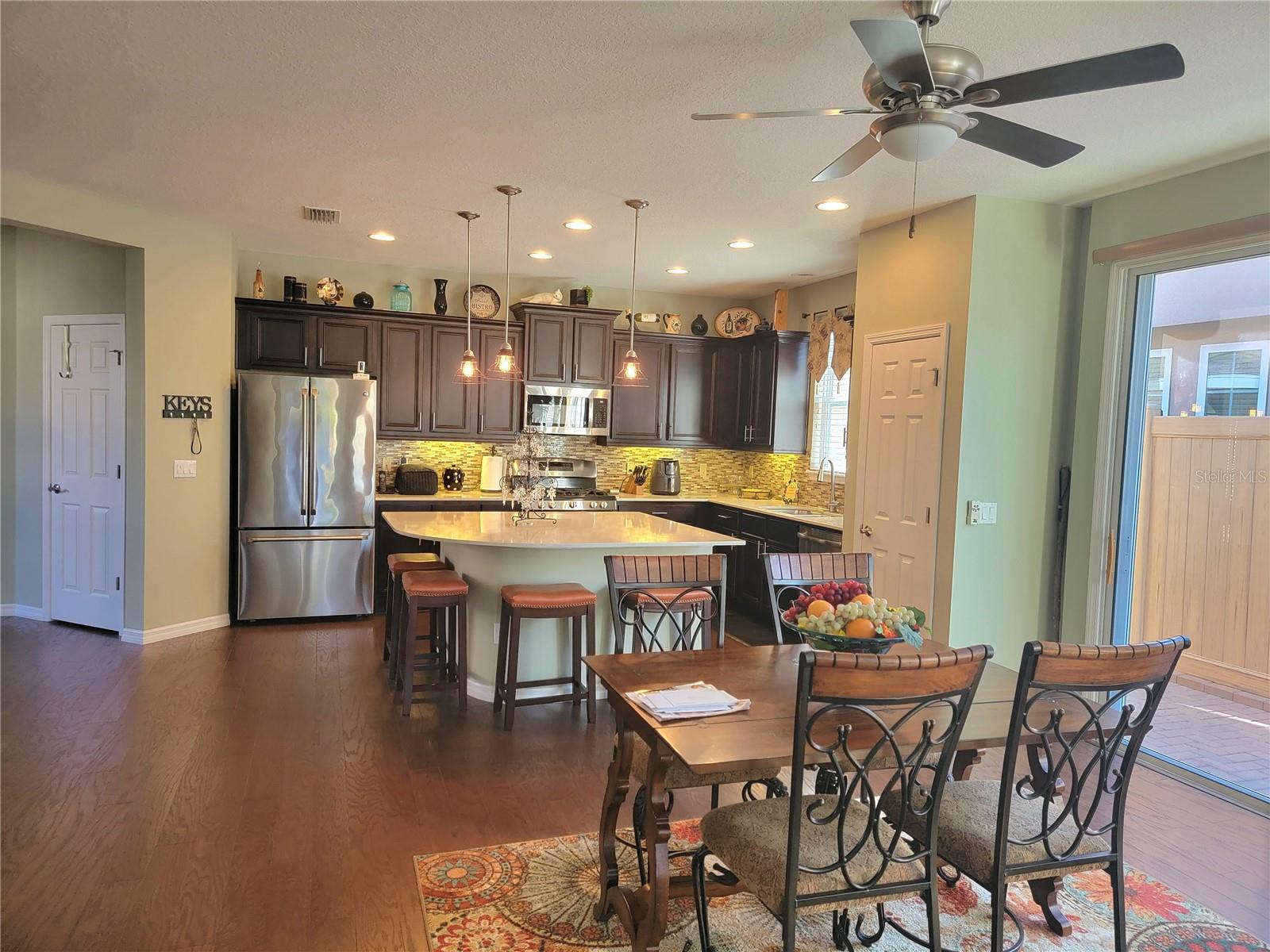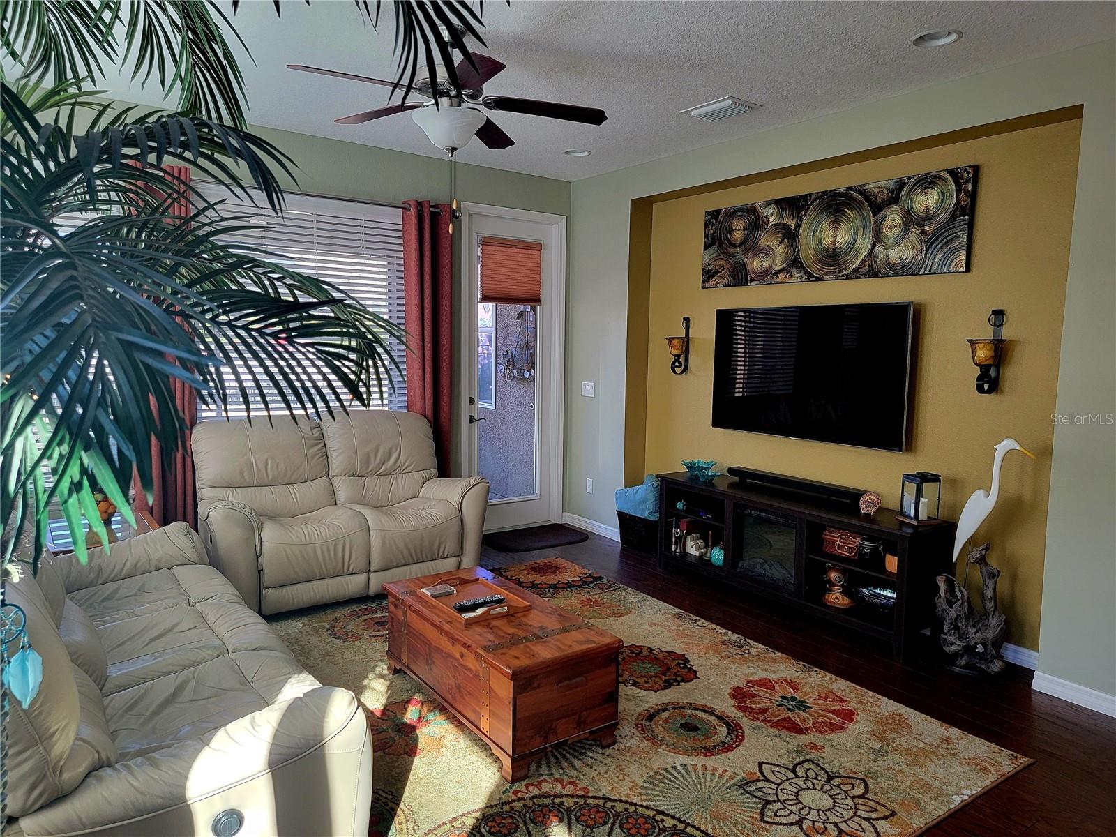 Welcome to resort living in Trilogy of Orlando! This Villa is perfect for care-free living full time, or for those who want to Winter in Florida. This two bedroom, two bath home and a den, is the perfect size for just that. Plus, you have a great outdoor space with screened lanai and wrap around side private courtyard as well. Loaded with upgrades including solar, wood floors, tankless water heater, upgraded kitchen cabinets with under counter lighting, stainless steel appliances, new microwave, and 5 burner gas range with griddle. And, if you don't feel like cooking in that fabulous kitchen, you can enjoy a meal Wednesday-Sunday at the Grille Restaurant & Bar, located in the 57,000 square foot state-of-the-art Clubhouse. Amenities include an Athletic Club with top-of-the-line equipment, resort-style indoor/outdoor pool, heated spa, ladies & men's locker rooms with lockers, showers, etc., pickleball and tennis courts, bocce ball, billiard room, poker room, craft room, and so much more. There is always some type of entertainment, concerts, and fun entertainment planned for the community. You will feel like you are always on vacation!! Come live the good life at this tropical oasis!