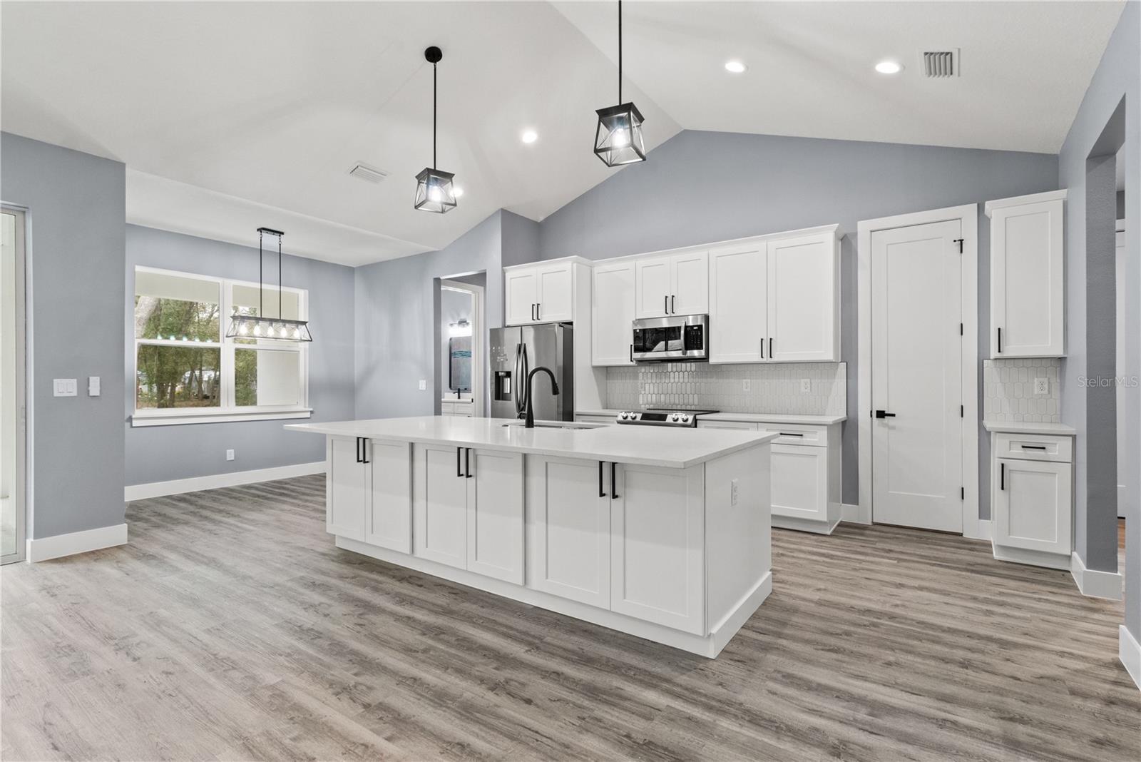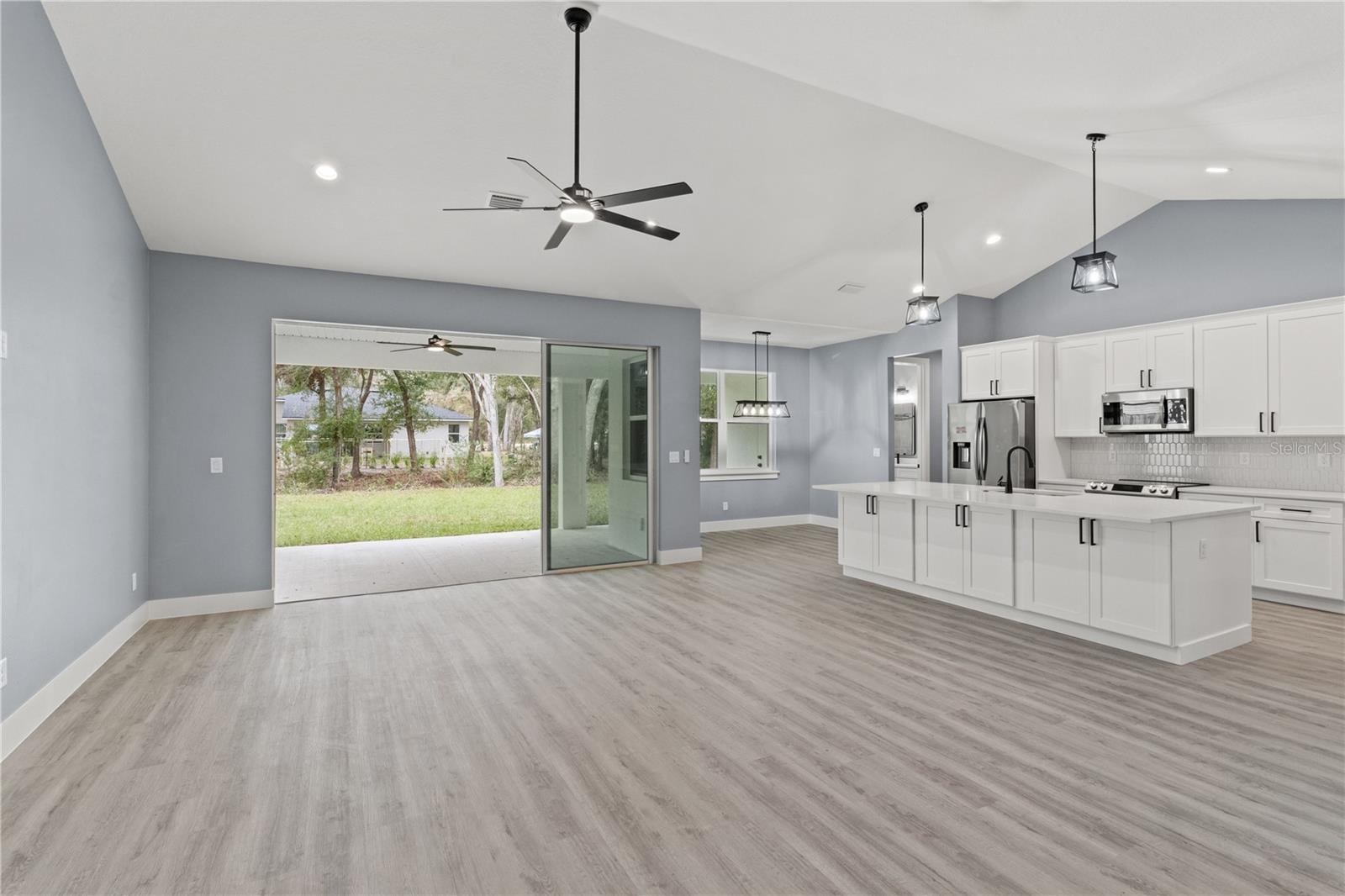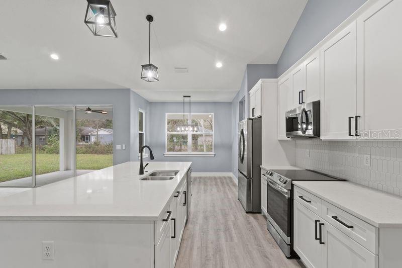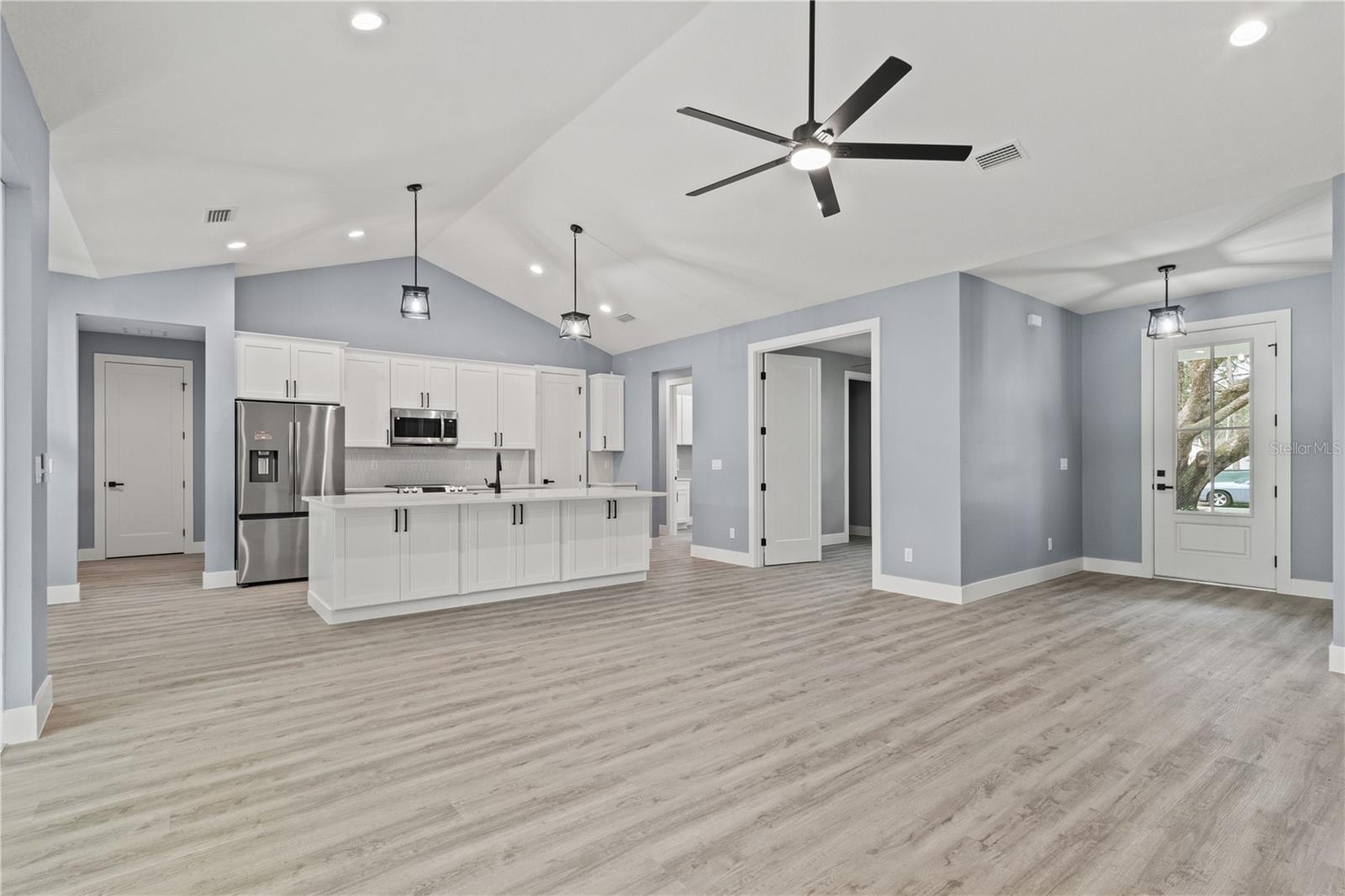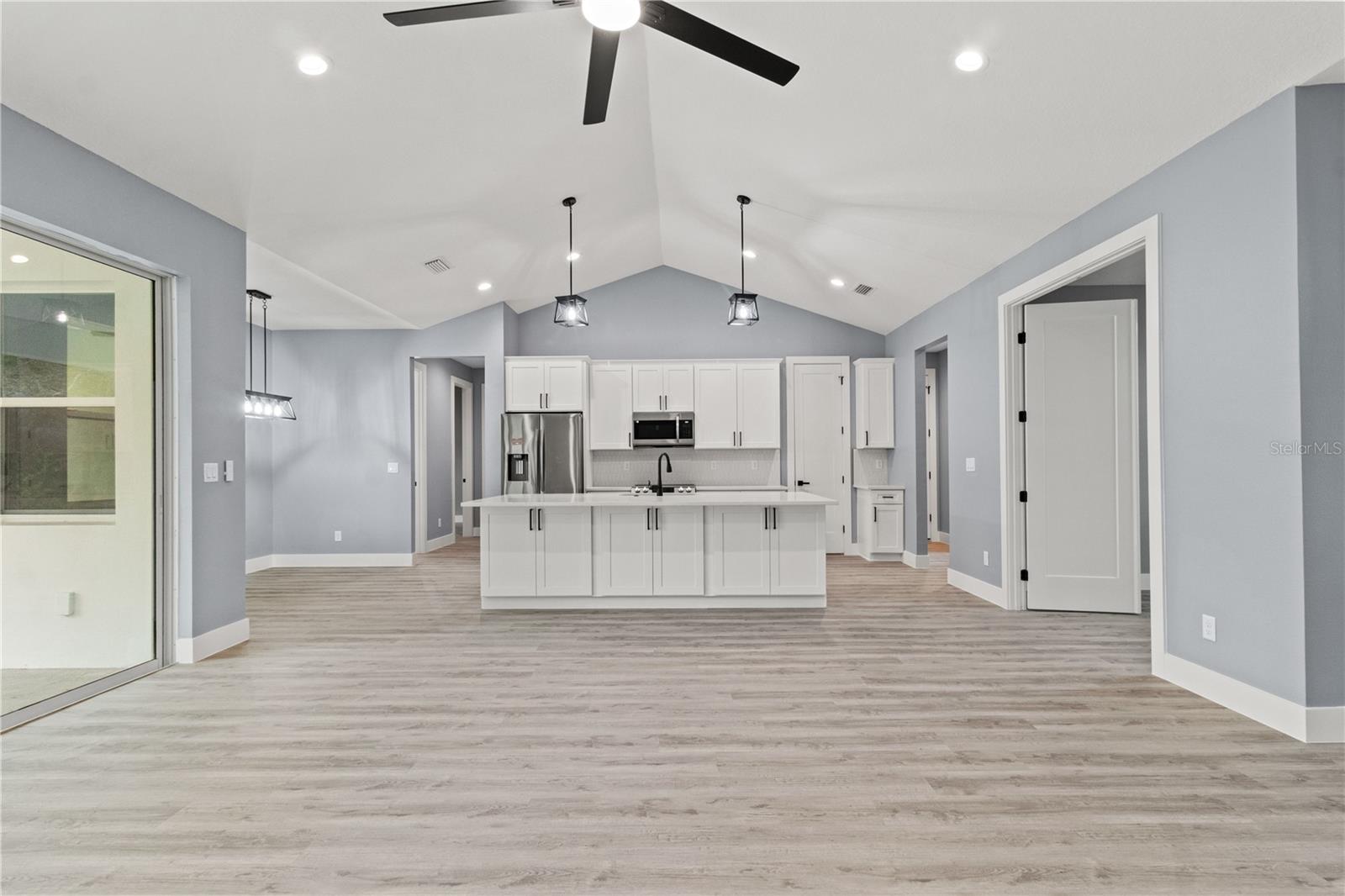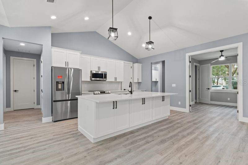 This 4 Bedroom 2 Bathroom modern farmhouse sits on a freshwater canal that leads to Lake Emma! No Flood zone here! Boasting ample natural light, an open floor plan and a location you won't want to miss, this one is a must see! The living room is attached to the bright kitchen, where you will find stunning countertops and abundant storage in the cabinets and the walk-in pantry. Off the kitchen is the dining area, and just down the hall are bedrooms 2 and 3 as well as the 2nd bathroom. Bathroom 2 has dual vanities and access to the rear porch. Bedroom 4 is off the living area and would also be a great office with its own walk-in closet. The primary bedroom is located off the living room and on its own side of the home. The primary bathroom has an oversized tub, large walk-in shower (with no step!), dual vanity, and a large walk-in closet. Coming in from the garage you find the laundry room with its own set of cabinets and a sink. This property is one you will not want to miss out on.