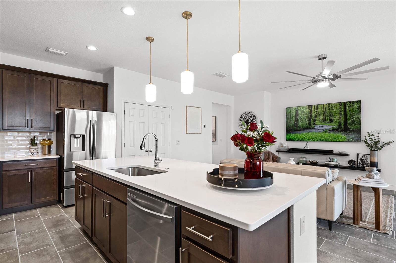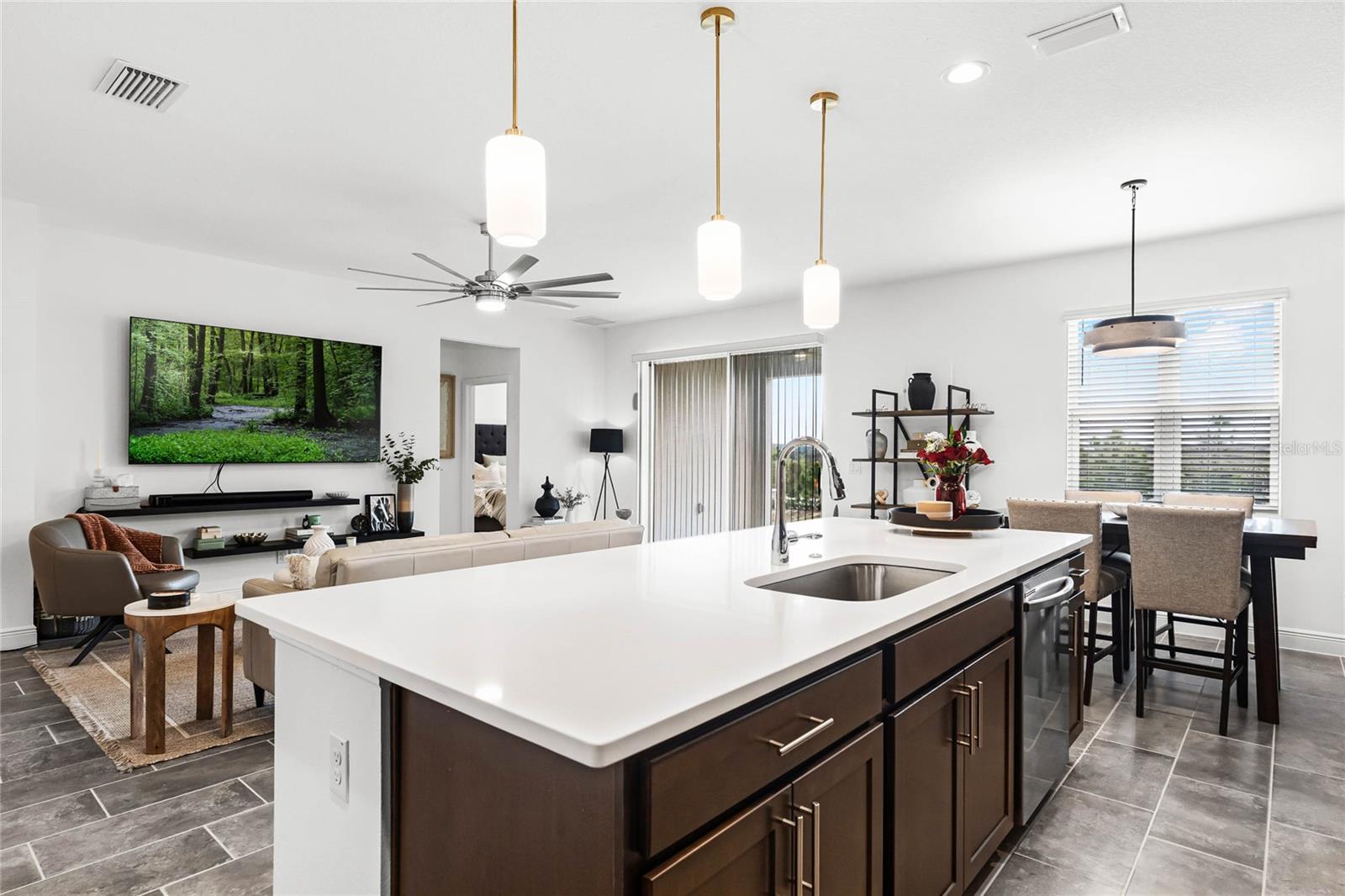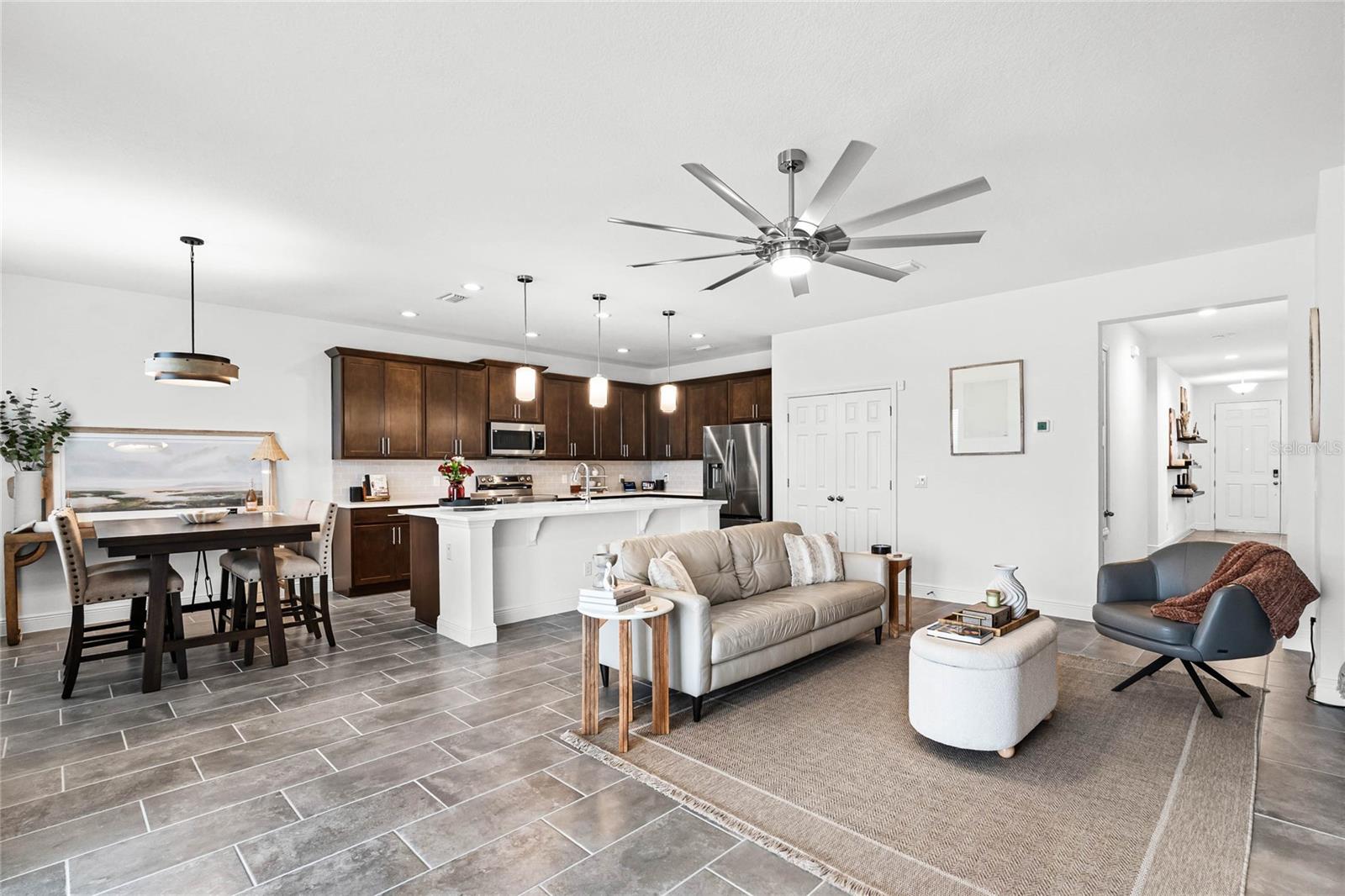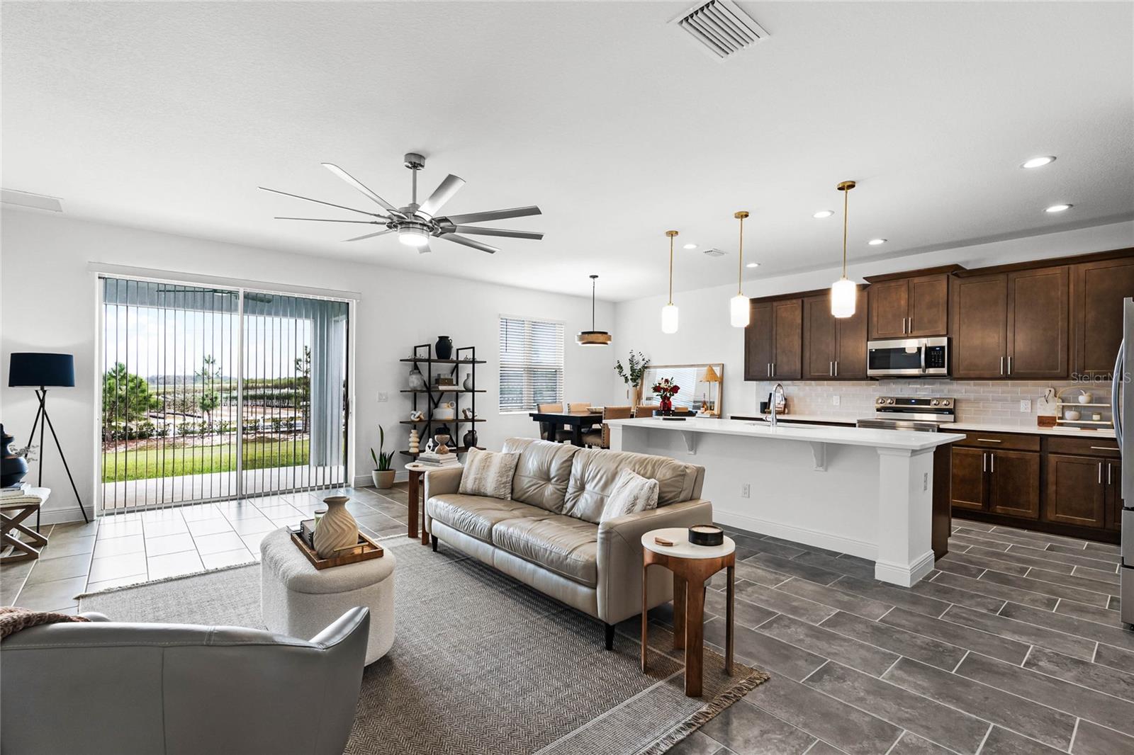 Experience the epitome of luxury living in Groveland's esteemed Trinity Lakes community! Discover a stunning 4-bedroom, 2-bathroom haven, meticulously crafted in 2024, boasting 2,103 sq. ft. of refined elegance. As you step inside, you'll be greeted by an airy open floor plan, adorned with soaring ceilings, exquisite tile flooring, and an abundance of natural light. Key Features include: • Spacious Living Area: Seamlessly blending the family room and gourmet kitchen, perfect for entertaining or relaxation. • Modern Kitchen: Equipped with sleek stainless steel appliances, quartz countertops, expansive island, and sophisticated dark cabinetry, a culinary haven awaits. • Primary Suite: Retreat to a serene oasis, complete with a spacious walk-in closet and lavish en-suite bathroom. • Outdoor Oasis: Unwind on a covered patio, overlooking a lush green backyard, perfect for alfresco dining or basking in the Florida sunshine. • 3-Car Garage: Ample space for vehicles, storage, or a home workshop. Community Amenities: Nestled within the coveted Trinity Lakes community, residents enjoy access to exceptional resort-style amenities, including a sparkling pool, fitness center, walking trails, and recreational areas. Conveniently located near major highways, this home offers effortless access to shopping, dining, and entertainment options, as well as breathtaking natural surroundings. Make 7193 Dilly Lake Avenue your dream haven—schedule a private tour today! (This home is listed UNDER appraised value).
