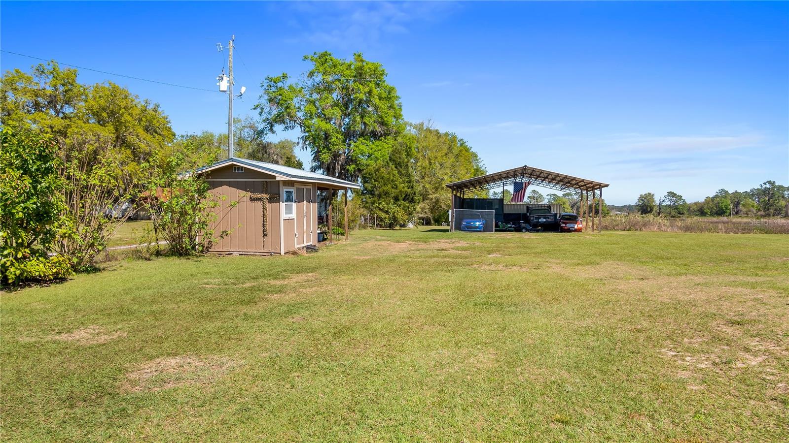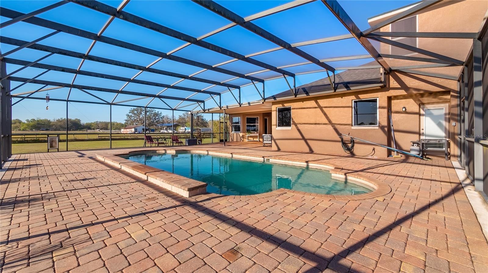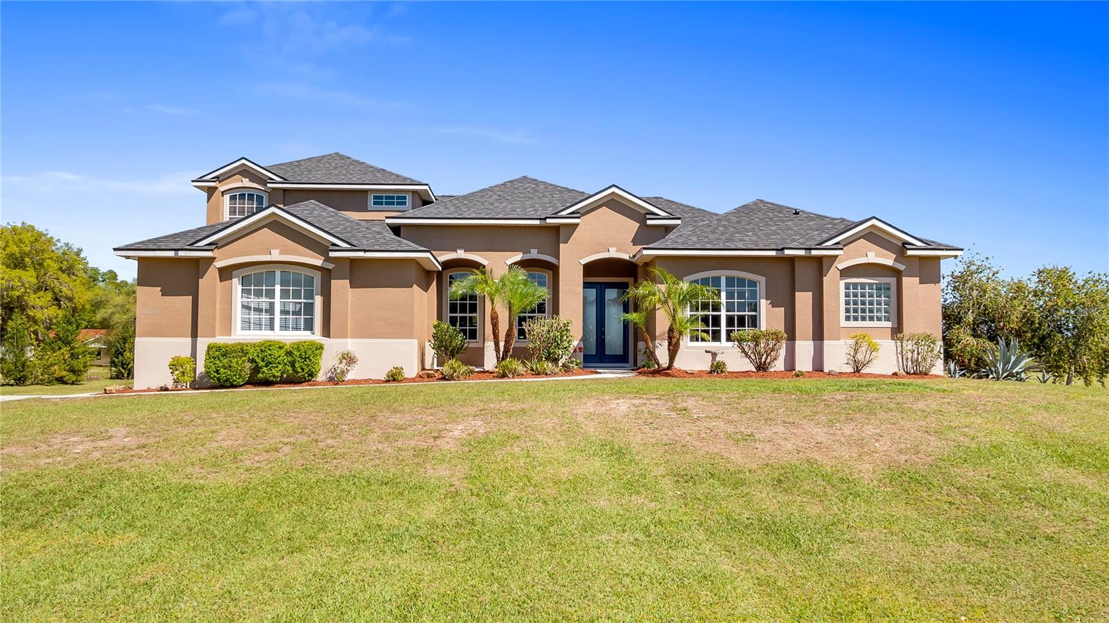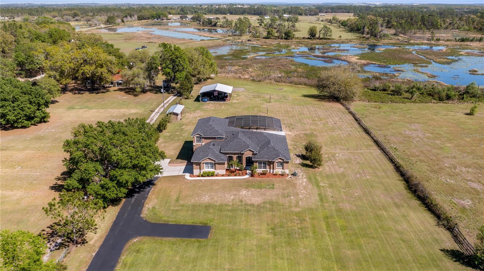 Welcome to your dream home, a stunning five-bedroom, four-bath property on five acres of beautiful land. This exceptional home offers comfort and luxury, with a fantastic floor plan that blends formal and family living spaces. The home provides a peaceful retreat while being close to all amenities you need. Upon entering, you'll be immediately impressed by the spacious layout. The main level features four large bedrooms, each with ample walk-in closet space and natural light. The oversized primary suite is a sanctuary, complete with a generous walk-in closet and a luxurious en-suite bath. For added convenience, the main level also includes two additional full baths, providing ultimate comfort for family members and guests alike. Upstairs, a huge loft offers plenty of room for a home office, entertainment area or additional living space. There is also a private bedroom and a full bath upstairs, ideal for guests or those seeking a bit more privacy. This home is equipped with modern features and upgrades, including a fiber modem installed with speeds of up to 1 gig, ensuring you’ll have fast and reliable internet for work, streaming or gaming. The air-conditioning units have recently been health-checked by Renaldi’s, ensuring the cooling system runs efficiently year-round and another air conditioner installed in garage! The garage has been recently updated with a fresh epoxy floor, providing a clean, durable surface. The roof, well pump and water heater have also been replaced, giving you peace of mind that all the major systems in the home are up to date. For those who love outdoor living, this property has it all. A 36x36x12-foot pole barn with separate 200-amp service and water offers endless possibilities for hobbies, storage or workspace. Whether you're a car enthusiast, a DIYer, or simply need extra space for your toys, this barn has you covered. Enjoy your mornings in the beautiful lanai, which provides an eastern view where you can watch stunning sunrises. On occasion, you may even be treated to the sight of a rocket launch! The lanai also offers a peaceful view of the no-bank lake, adding to the serene atmosphere of this private estate. Wildlife lovers will feel at home here, as the property is a sanctuary for numerous species of birds, including hawks, owls, cardinals, eagles, falcons, and sand cranes. It’s a nature lover’s paradise. For those who enjoy outdoor recreation, the property features an 18,000-gallon saltwater sports pool with water features and lights, all powered by a variable-speed Pentair pool pump. Whether you're swimming laps, relaxing, or hosting friends, this pool is the spot to unwind. The yard is a gardener's dream, with fertile soil that allows for year-round vegetable gardening. The garden area is ready to produce a bountiful harvest, allowing you to enjoy fresh, homegrown produce throughout the year. Additionally, a shed with air conditioning provides a comfortable space for your gardening tools and equipment. This 5-acre parcel includes 3.5 acres of dry, usable land, with no flood insurance required. With no HOA, you have the freedom to make the property your own. The lighted, gated and freshly sealed paved driveway leads to the home and ensures privacy and security. This stunning property offers the balance of seclusion, modern amenities and natural beauty, a one-of-a-kind place to call home. Don’t miss the opportunity to own this incredible estate and see it today!