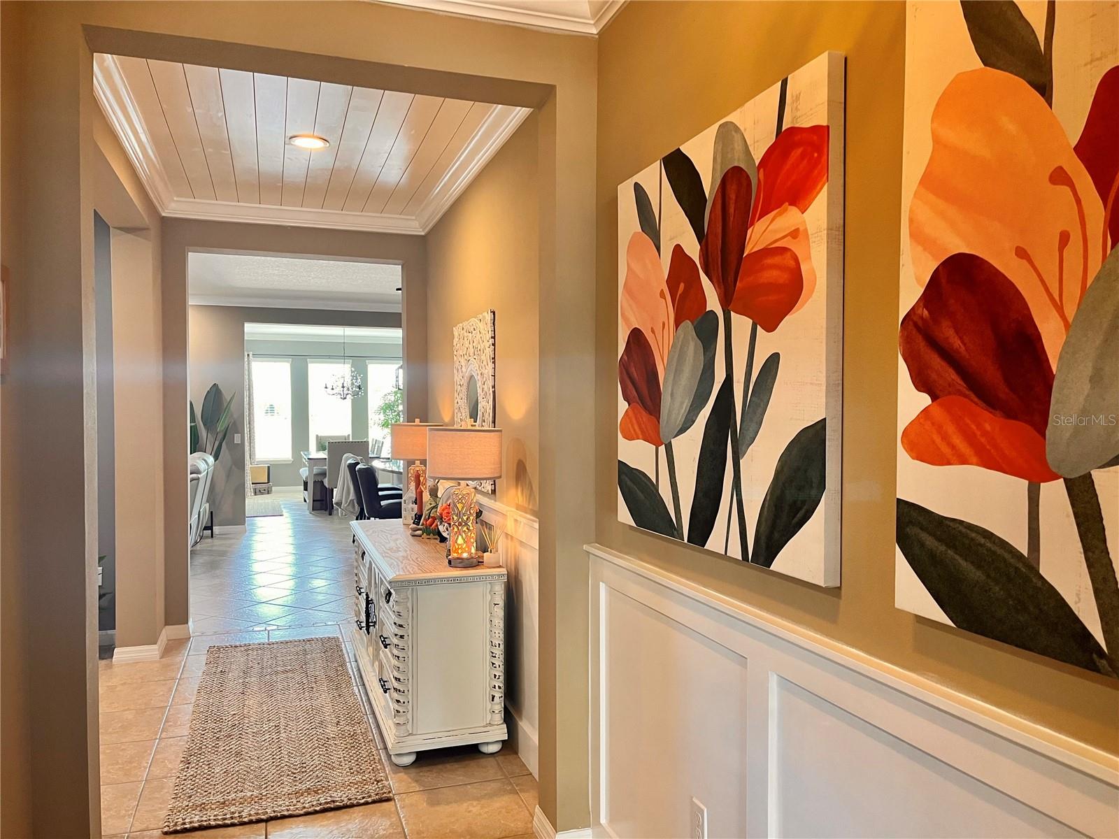 This beautifully maintained, energy-efficient home is situated on a premium lot with no rear neighbors, offering privacy and serene conservation views. Thoughtfully updated and move-in ready, the home features a new roof installed in 2024, owner owned solar panels, and a water softener for added comfort and efficiency. Inside, the open-concept layout is enhanced by designer details throughout, including custom built-ins, elegant crown molding, and stylish shiplap accents that add warmth and character. The modern kitchen is a true centerpiece, showcasing quartz countertops, matching appliances, under-cabinet lighting, crown-molded cabinetry, decorative hardware, pot and pan drawers, and a designer shiplap backsplash, along with a complimentary center island for additional seating and prep-space. The oversized utility/ flex room just off the kitchen provides exceptional versatility- perfect for a home office, hobby space, or exercise room. The spacious living and dining areas flow seamlessly through triple sliding doors to the enclosed lanai, which was upgraded in 2025 with a mini-split system allowing for year-round comfort. Step outside to discover an extensive brick-paved outdoor area, ideal for entertaining, grilling, or simply enjoying Florida living with sweeping views of nature and conservation land. The primary suite is filled with natural light and easily accommodates oversized furniture. The ensuite bath features dual-sink vanities, a glass-enclosed tiled shower with bench seating, and a separate water closet. A private guest bedroom is thoughtfully positioned away from the primary suite and offers a built-in bookcase and easy access to a full bath with walk-in shower. An additional den/study provides flexibility for guests or quiet relaxation. Located in the highly desirable Trilogy Cascades of Groveland, a guard- gated 55+ community, residents enjoy resort-style amenities including a full-service restaurant and bar, two fitness centers, indoor and outdoor pools, spas, walking trails, dog park, tennis, pickleball, bocce and more. With over 50 clubs, live entertainment, demonstrations, and social activities, this community is designed for an active and engaging lifestyle. HOA fees include lawn, and shrub maintenance, basic cable, internet with landline, home security monitoring, streetlights, and maintenance of the guard-gated entrance and clubhouse amenities.