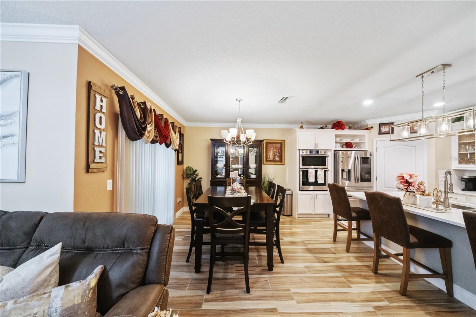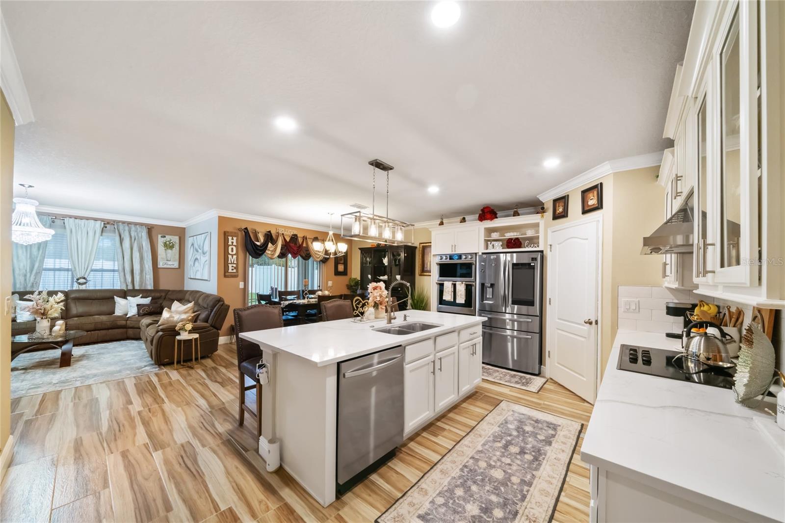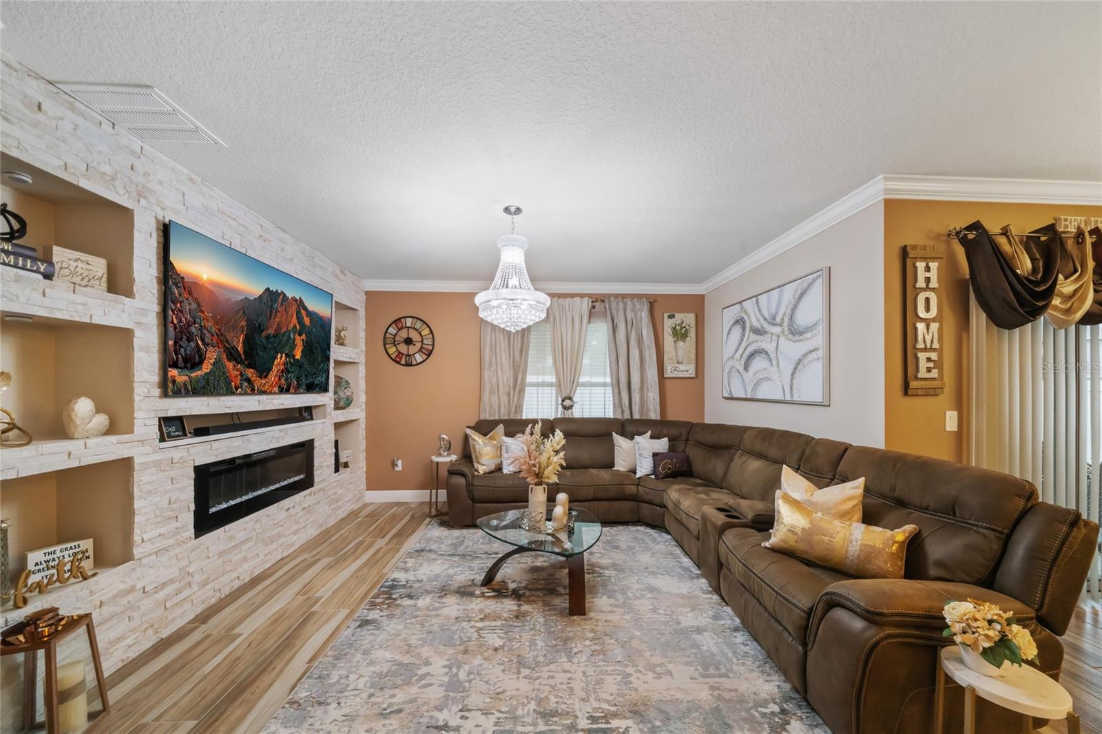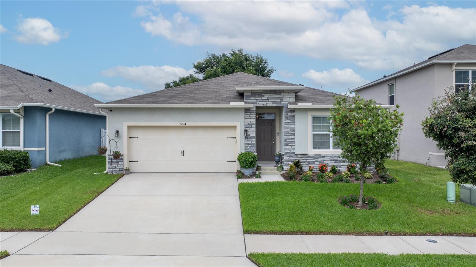 Experience modern living in this 2020, beautifully designed home in a prime Groveland location. The award-winning Cali floor plan welcomes you with a warm entry foyer leading to a cozy living area, perfect for relaxation and gatherings. Welcome to this stunning home in Groveland, FL, where luxury and modern upgrades await. The exterior features a charming stacked stone front, lush landscaping, and gutters for optimal drainage. Step inside to discover elegant ceramic tile flooring, exquisite crown molding, and custom baseboards throughout. The gourmet kitchen is a chef's dream, boasting quartz countertops, a stylish backsplash, gourmet cabinets, a range, and an upgraded dishwasher. The cozy living area features a striking stone accent wall, while the laundry room offers additional convenience with built-in cupboards. The master suite includes a luxurious standing tub and a sliding glass door leading to the screened-in lanai, perfect for enjoying the serene backyard with irrigation. Additional features include a water softener ( PAID OFF ), and solar panels. Note: The refrigerator and chandelier will be removed, and the oven will be switched out. Don’t miss the opportunity to make this exquisite property your new home!