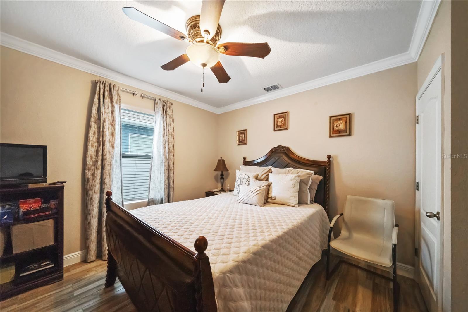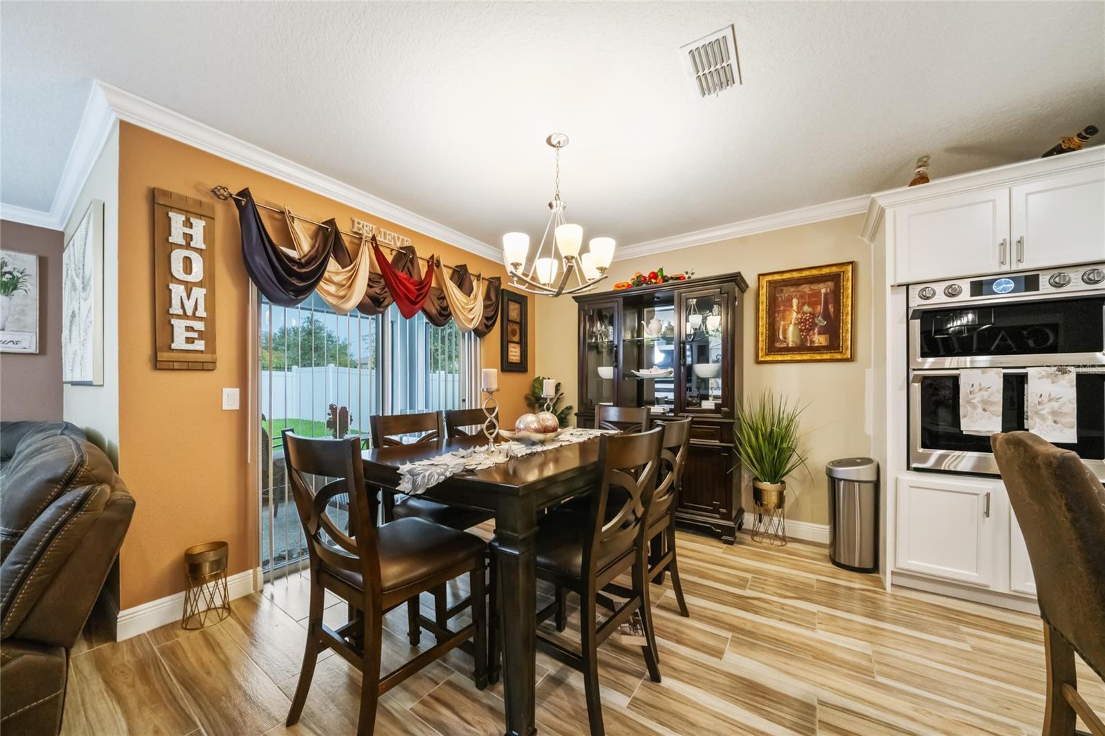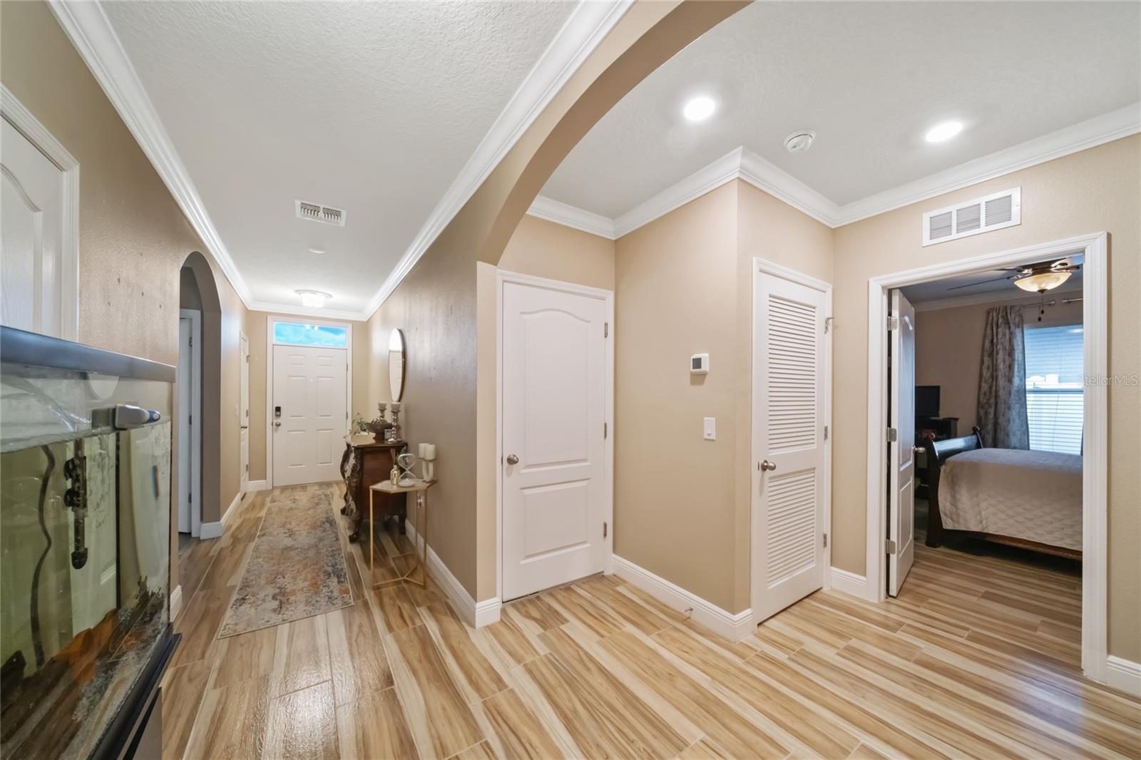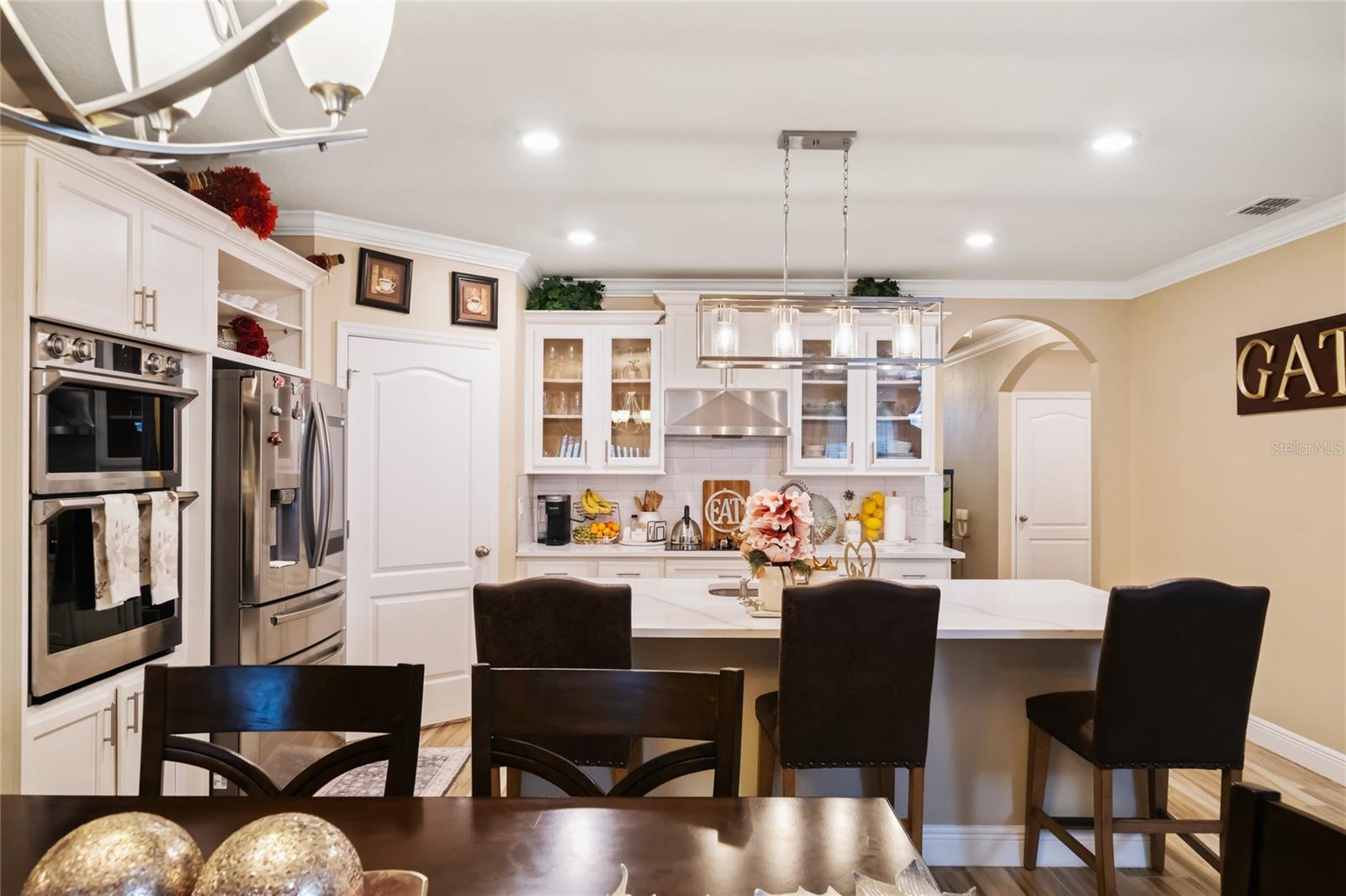 Experience modern living in this 2020, beautifully designed home in a prime Groveland location. The award-winning Cali floor plan welcomes you with a warm entry foyer leading to a cozy living area, perfect for relaxation and gatherings. Welcome to this stunning home in Groveland, FL, where luxury and modern upgrades await. The exterior features a charming stacked stone front, lush landscaping, and gutters for optimal drainage. Step inside to discover elegant ceramic tile flooring, exquisite crown molding, and custom baseboards throughout. The gourmet kitchen is a chef's dream, boasting quartz countertops, a stylish backsplash, gourmet cabinets, a range, and an upgraded dishwasher. The cozy living area features a striking stone accent wall, while the laundry room offers additional convenience with built-in cupboards. The master suite includes a luxurious standing tub and a sliding glass door leading to the screened-in lanai, perfect for enjoying the serene backyard with irrigation. Additional features include a water softener ( PAID OFF ), and solar panels. Note: The refrigerator and chandelier will be removed, and the oven will be switched out. Don’t miss the opportunity to make this exquisite property your new home!