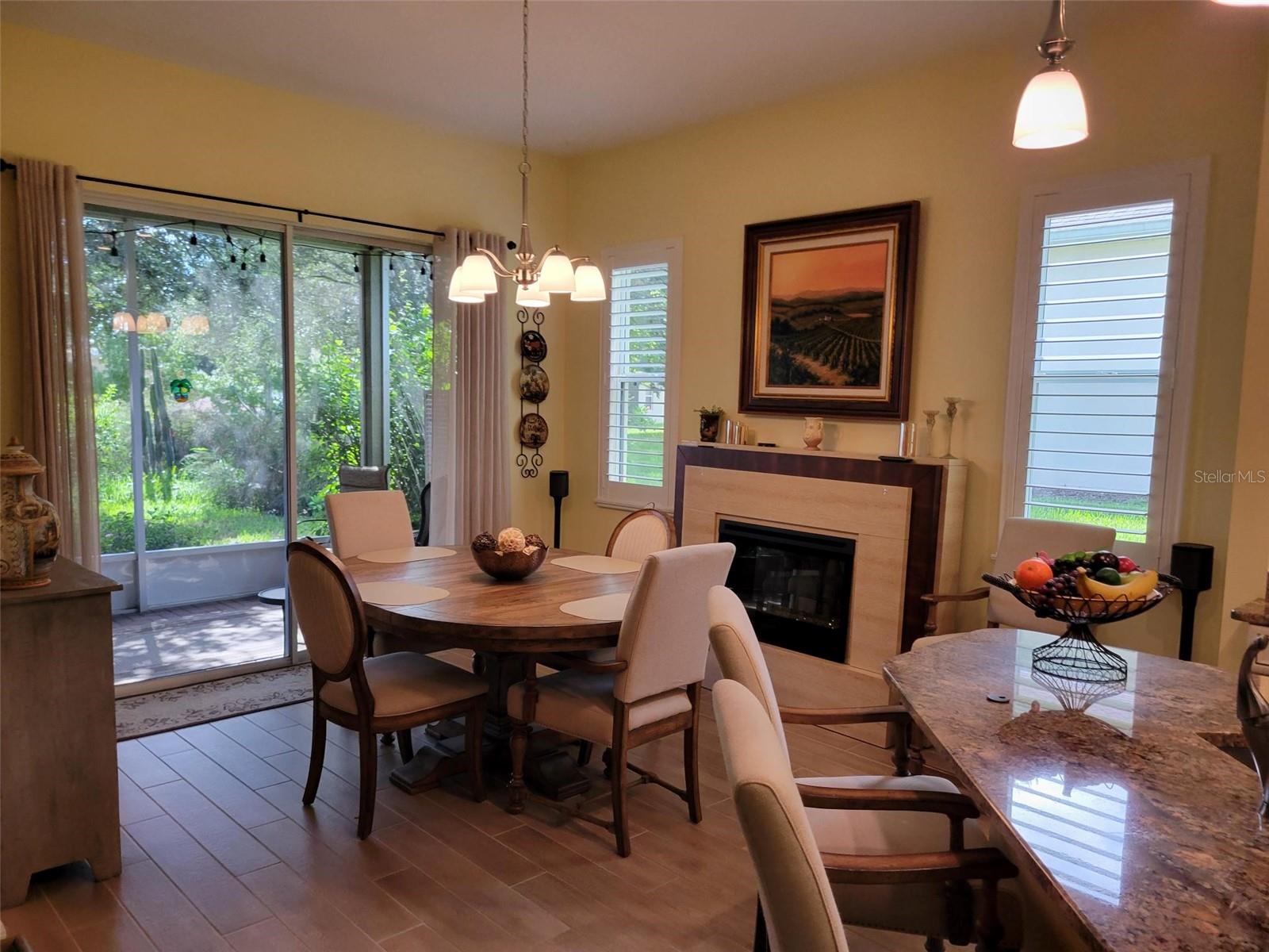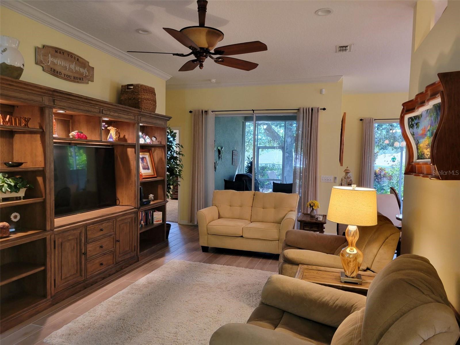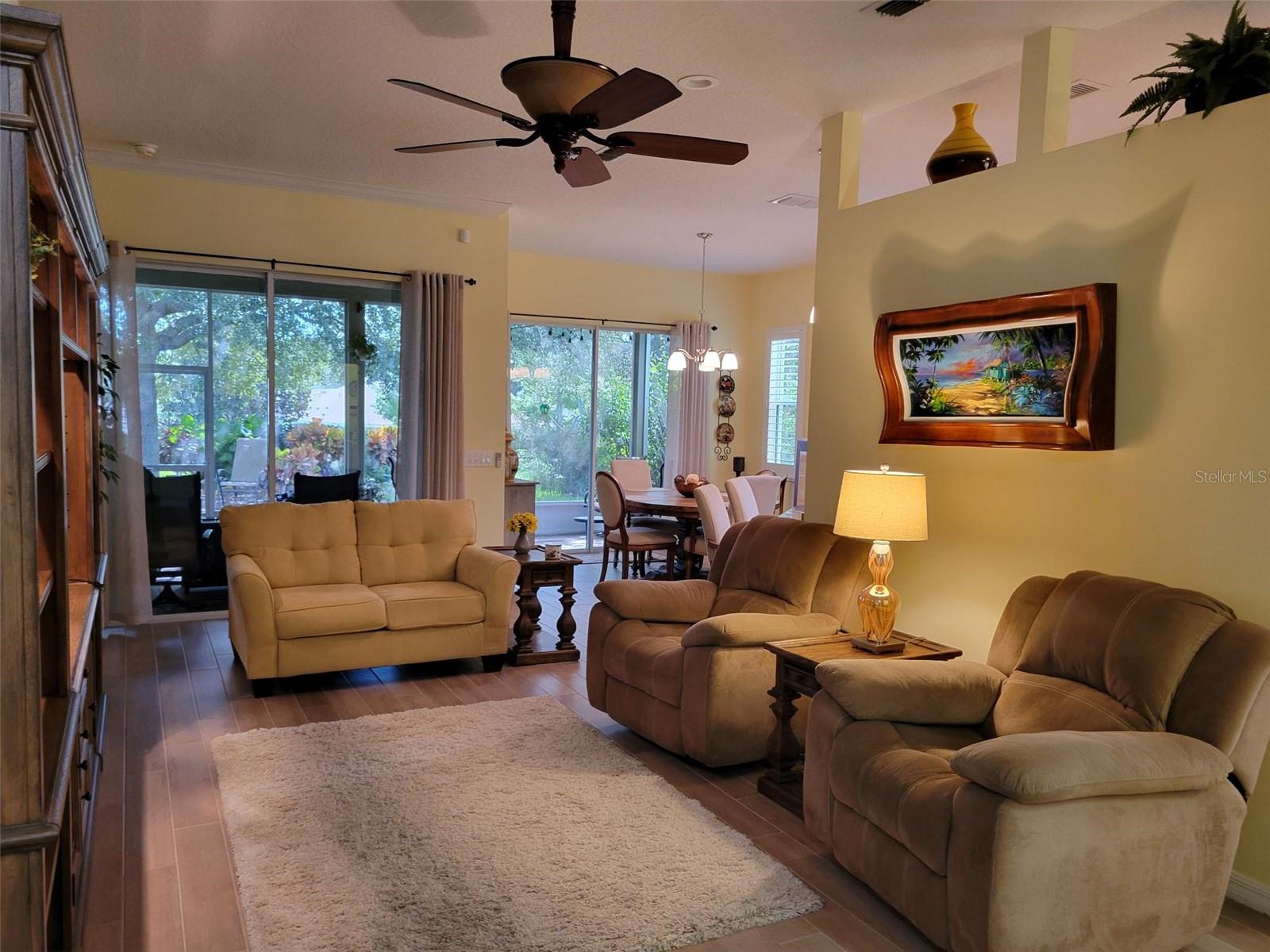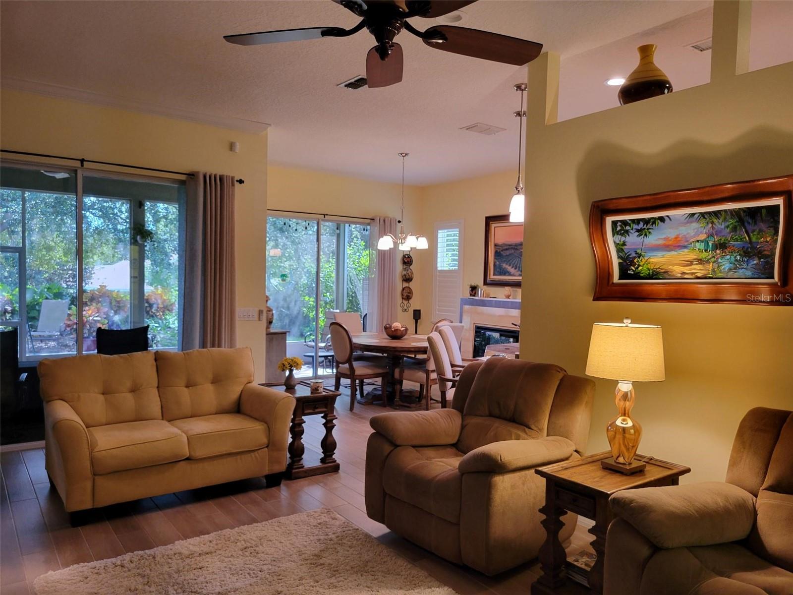 Welcome to this lovely Charlotte floorplan with 2 bedrooms/ 2 baths plus den home in the 55+ guard gated Trilogy Orlando (Cascades of Groveland) community. This awesome home is enhanced with plantation shutters throughout and porcelain plank wood look tile in the living areas. The home has been handicapped modified with widened doorways for ease of access. Doors are widened in the master bedroom & bathroom, guest bath and from the garage and laundry room. The master shower is fully handicap accessible (walk in or roll in). It is equipped with a dual shower system, grab bars, custom tile and tub. There is a custom built-in murphy bed system in the 2nd bedroom. The den/office room offers flexible space with doors for privacy. The kitchen is completely remodeled with granite countertops, wood cabinets, natural gas stove and included appliances. There is also a second desk area/office off the kitchen that also can serve as a bar area. This highly desirable floorplan features a front porch with screened entry to the front door. The foyer leads to the living room with views of the lanai and private backyard. The formal dining room is perfect for special occasions with the ambiance of the electric fireplace and overlooks the backyard through a second set of sliding glass doors. The screened lanai offers year-round enjoyment with a garden view. Enjoy the fact that the location is a short walk to the 57,000 square foot state of the art Magnolia House clubhouse which features a full-service restaurant and bar, fitness center, indoor and outdoor pools, spas, demonstration kitchen, massage room, dance studio, poker lounge, a golf simulator, billiards, countless planned activities, 50 active member-led clubs and more. Outdoor recreational amenities include a dog park, tennis, pickleball, basketball and bocce ball and walking trails. The community life is vibrant, with fitness classes such as Aqua Fit and Zumba, various arts and crafts opportunities, numerous social clubs and regular themed parties and group excursions. The dining scene within the community is geared towards health-conscious individuals and also provides casual spots for socializing. The community is in close proximity to area dining, shopping and medical facilities in Clermont or Leesburg and easy access to the Florida Turnpike. HOA dues include Spectrum Cable & high-speed internet, land line phone, security system and lawn care. Call now to schedule your tour!