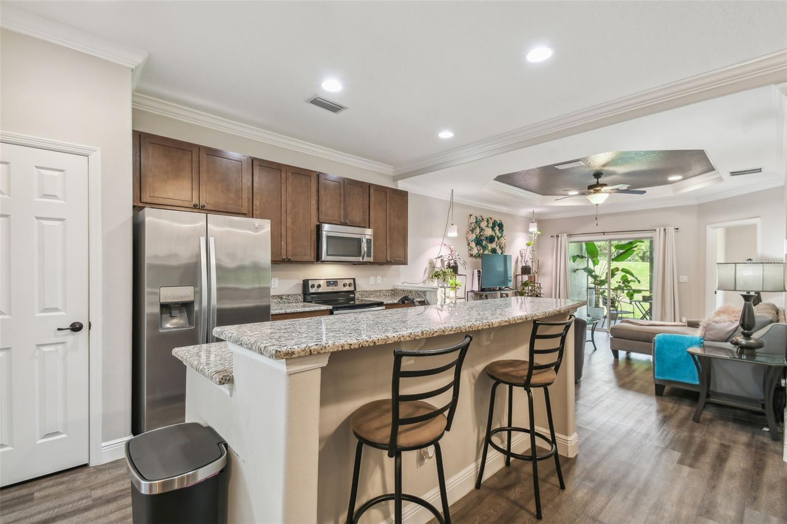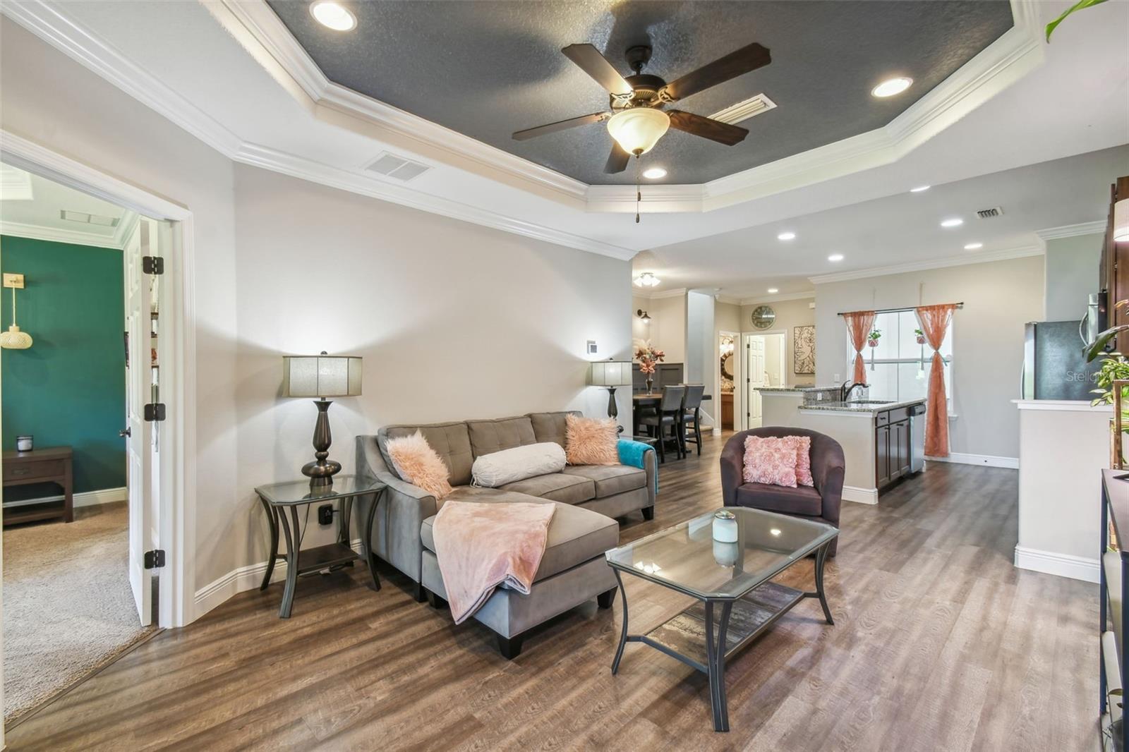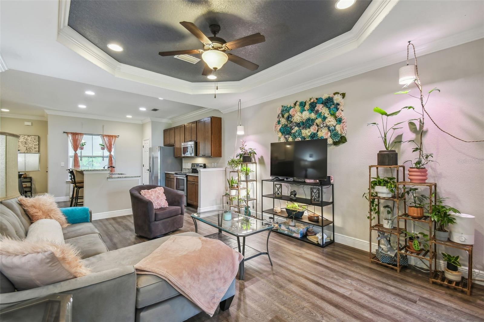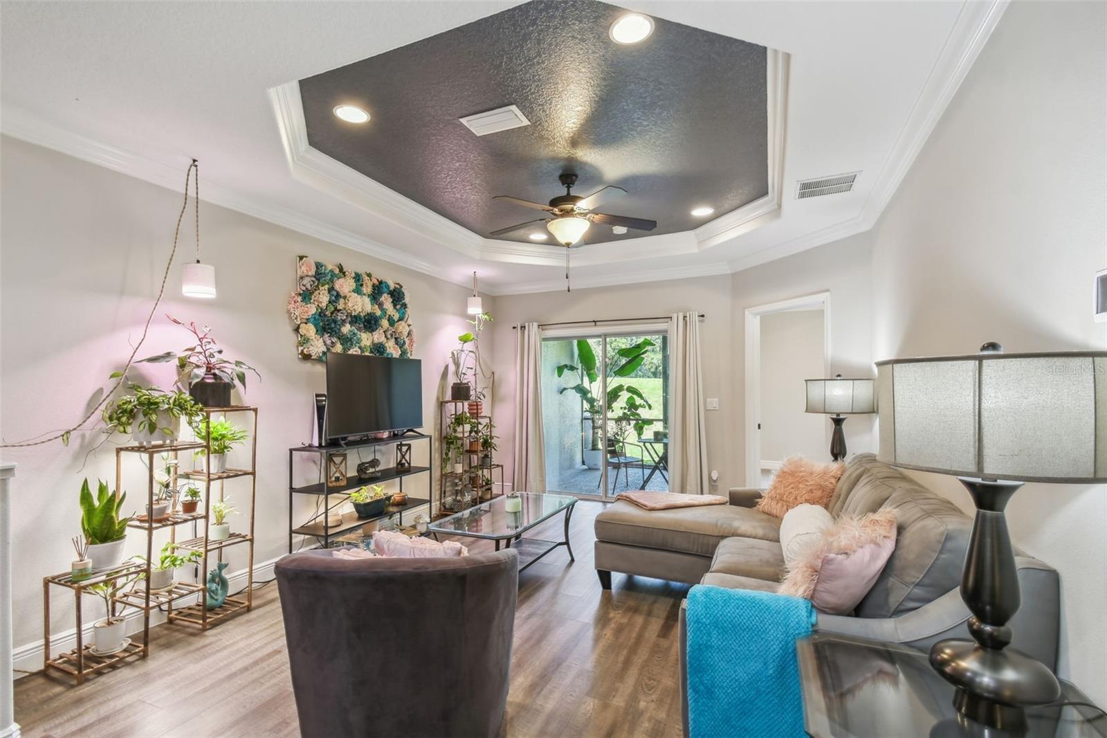 HUGE PRICE IMPROVEMENT!!! UNDER MARKET VALUE! Stunning 3 bedroom, 2 bath, 2 car garage townhome in Groveland - just minutes to downtown Clermont! This home shows like a model!! From the moment you pull up to this spacious 2 story home, you'll appreciate the extra parking lot across the street as well as the large cul de sac from added privacy at the end of this street. Walking up to the front door, you'll just love the covered courtyard beyond the gate, perfect for quiet mornings to enjoy your coffee and a good book! Right as you enter inside you're greeted with beautiful luxury vinyl floors, high ceilings and elegant crown molding throughout the main living areas downstairs. The kitchen boars of a large island with breakfast bar, perfect for entertaining! The warm tone cabinets go perfectly with the granite countertops and stainless steel appliances. The large window to the courtyard brings in lots of natural light. Across is the dining room with beautiful wood accents and extra lighting. There's even a hidden storage nook under the stairs if you look closely! The guest bath is perfectly decorated with modern finishes. The living room features a beautiful tray ceiling with added recessed lights, giving the room a very grand and elegant feel. The primary suite is just off the back of the home, featuring a tray ceiling with recessed lights and a double window overlooking the golf course that brings in tons of natural light. The ensuite bath features dual vanities with granite counters and upgraded accents on the mirror. The oversized tile shower with a bench is gorgeous with the glass enclosure and bronze fixtures. The enclosed water closet and large walk in closet help complete the room. Upstairs, you're greeted with high ceilings and a bright and airy loft that overlooks the golf course. There are two large secondary bedrooms with great sized closets. The shared hall bathroom features a beautiful tiled tub/shower and window. The vanity is also upgraded with granite counters and modern finishes. If you enjoy outdoor space, you can also enjoy cool evenings in the fully screened in lanai in the bath. You've got private views in the back with no rear neighbors! The best part is this townhome couldn't be more centrally located. Here you're just minutes from the Clermont border, with downtown Clermont just 5 minutes away! You'll be only 4 minutes away from the soon to be revitalized downtown Groveland!! It's truly one of the best spots to be in town! Call today for your own private tour!