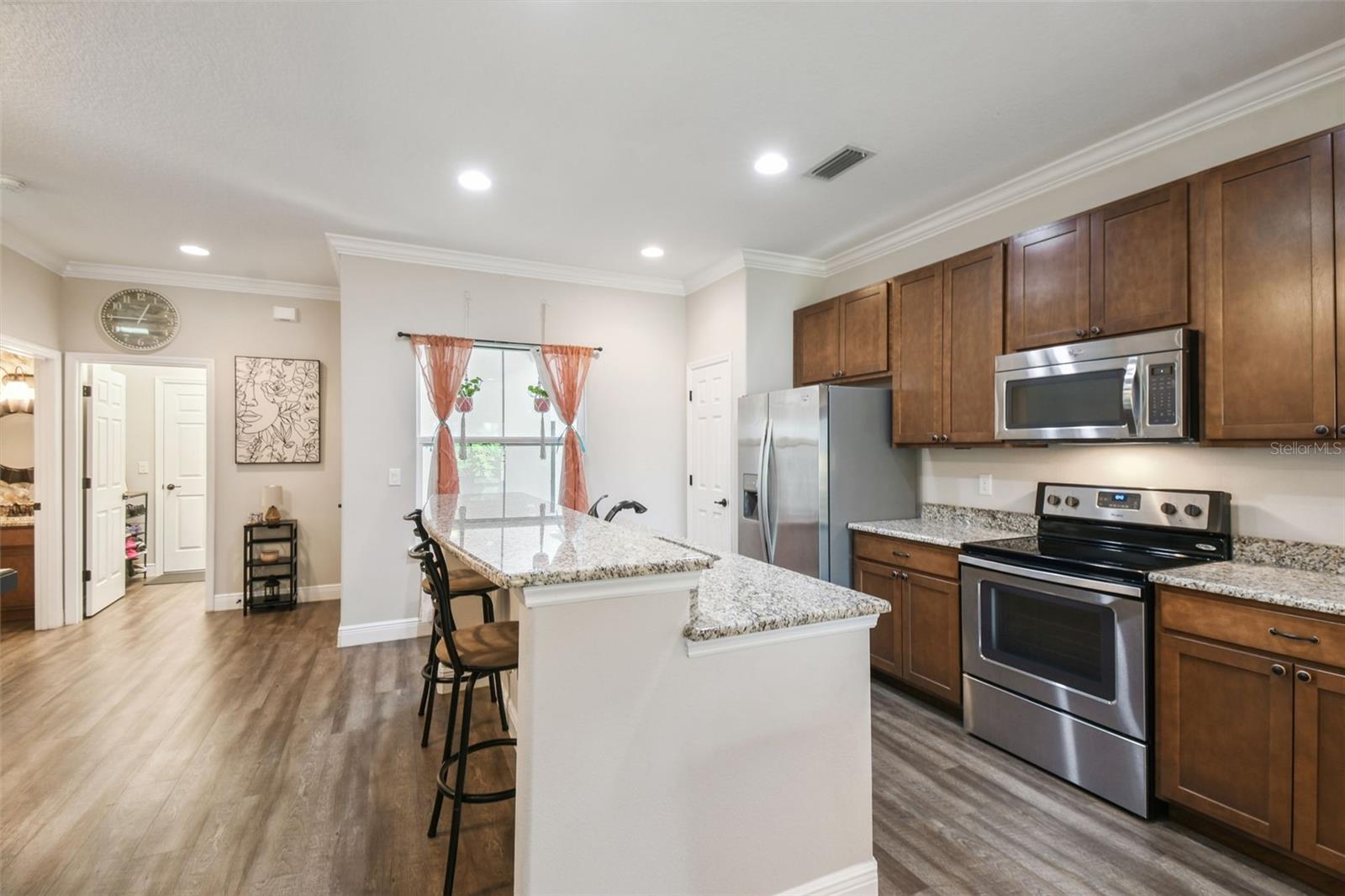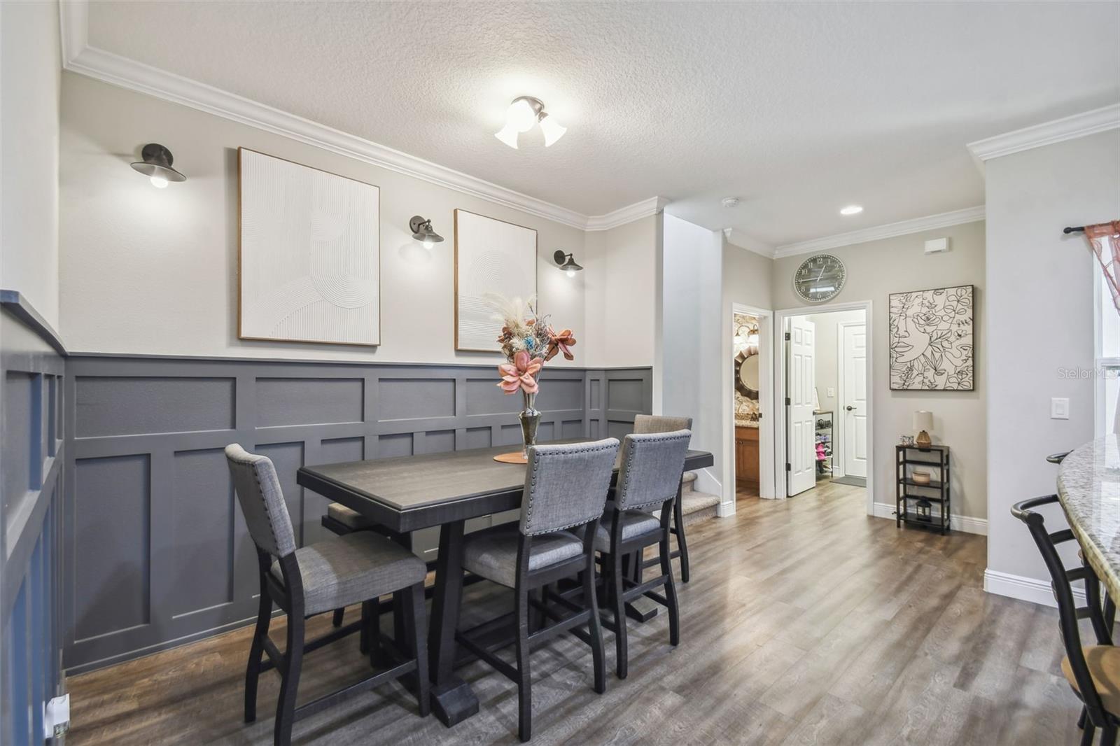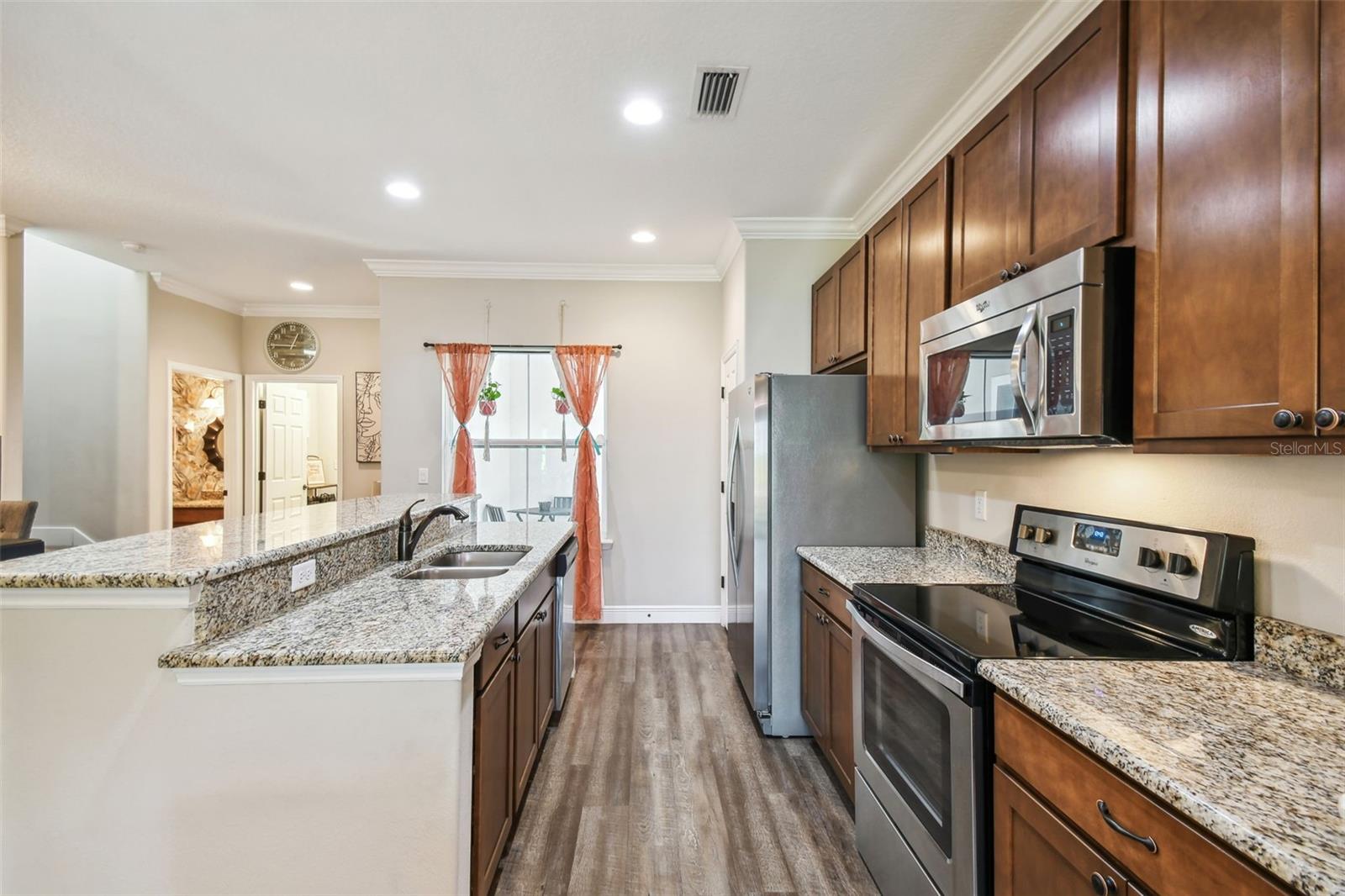 HUGE PRICE IMPROVEMENT!!! UNDER MARKET VALUE! Stunning 3 bedroom, 2 bath, 2 car garage townhome in Groveland - just minutes to downtown Clermont! This home shows like a model!! From the moment you pull up to this spacious 2 story home, you'll appreciate the extra parking lot across the street as well as the large cul de sac from added privacy at the end of this street. Walking up to the front door, you'll just love the covered courtyard beyond the gate, perfect for quiet mornings to enjoy your coffee and a good book! Right as you enter inside you're greeted with beautiful luxury vinyl floors, high ceilings and elegant crown molding throughout the main living areas downstairs. The kitchen boars of a large island with breakfast bar, perfect for entertaining! The warm tone cabinets go perfectly with the granite countertops and stainless steel appliances. The large window to the courtyard brings in lots of natural light. Across is the dining room with beautiful wood accents and extra lighting. There's even a hidden storage nook under the stairs if you look closely! The guest bath is perfectly decorated with modern finishes. The living room features a beautiful tray ceiling with added recessed lights, giving the room a very grand and elegant feel. The primary suite is just off the back of the home, featuring a tray ceiling with recessed lights and a double window overlooking the golf course that brings in tons of natural light. The ensuite bath features dual vanities with granite counters and upgraded accents on the mirror. The oversized tile shower with a bench is gorgeous with the glass enclosure and bronze fixtures. The enclosed water closet and large walk in closet help complete the room. Upstairs, you're greeted with high ceilings and a bright and airy loft that overlooks the golf course. There are two large secondary bedrooms with great sized closets. The shared hall bathroom features a beautiful tiled tub/shower and window. The vanity is also upgraded with granite counters and modern finishes. If you enjoy outdoor space, you can also enjoy cool evenings in the fully screened in lanai in the bath. You've got private views in the back with no rear neighbors! The best part is this townhome couldn't be more centrally located. Here you're just minutes from the Clermont border, with downtown Clermont just 5 minutes away! You'll be only 4 minutes away from the soon to be revitalized downtown Groveland!! It's truly one of the best spots to be in town! Call today for your own private tour!
