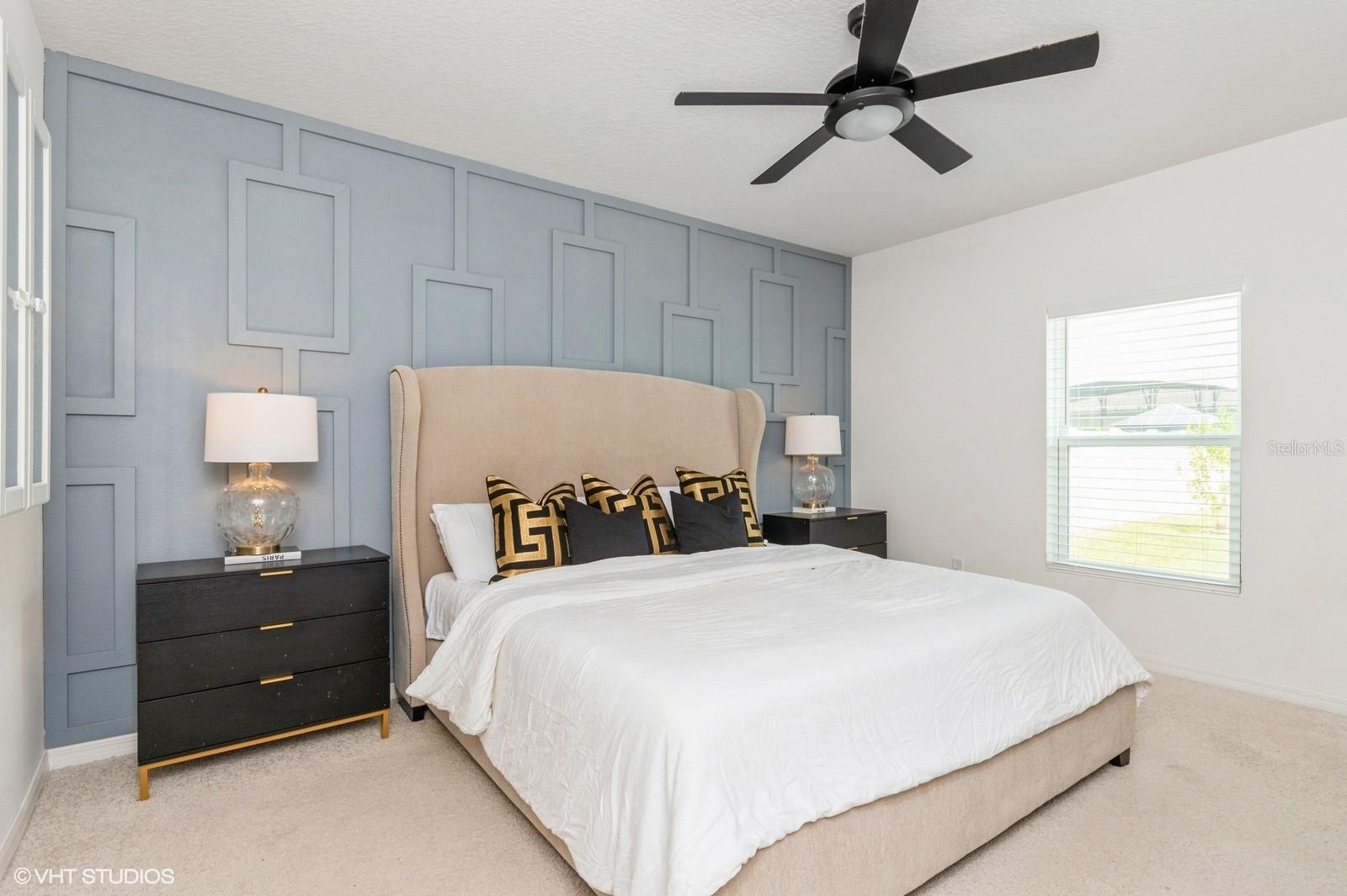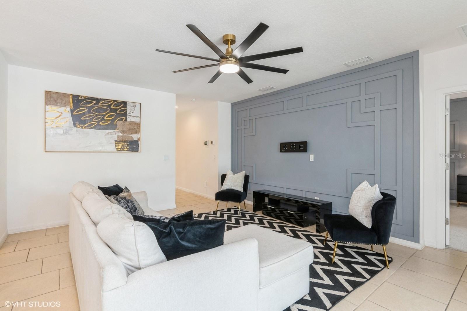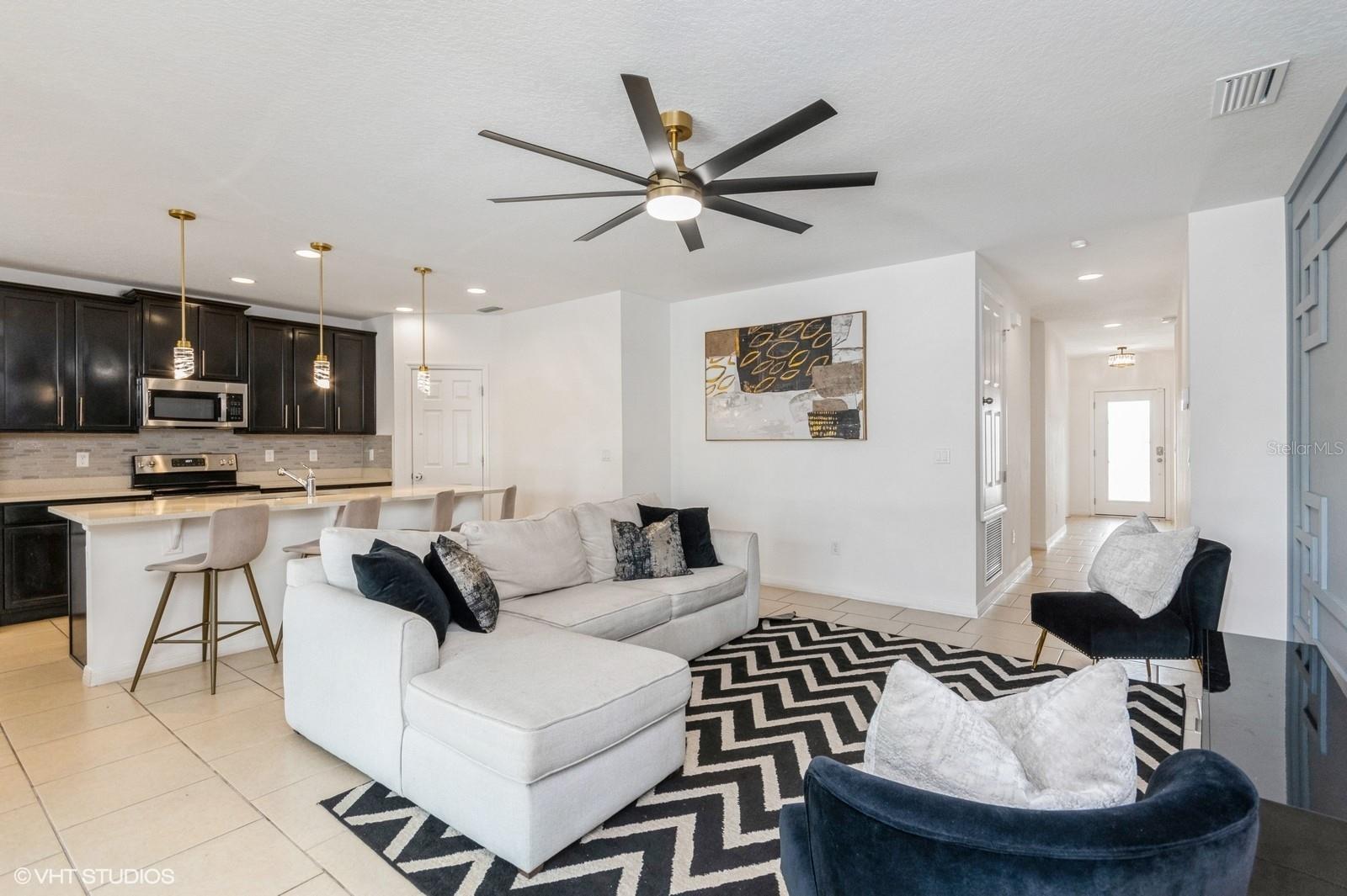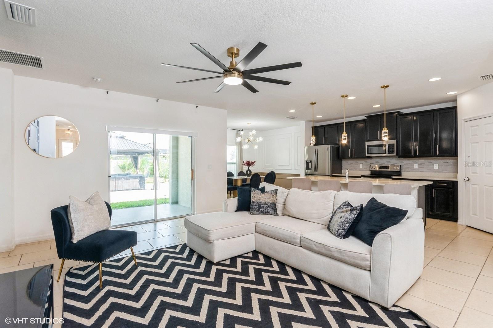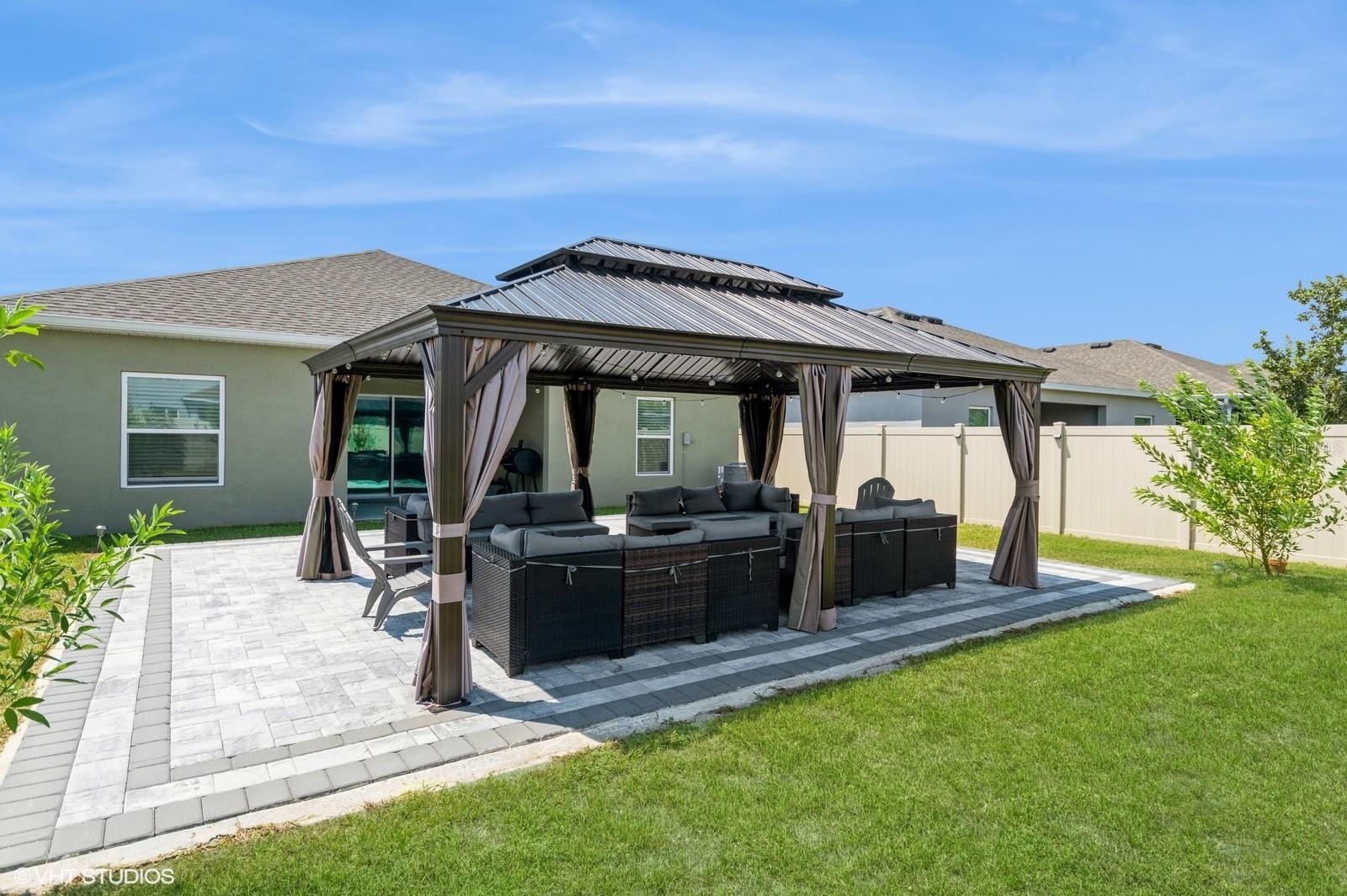 SELLER MOTIVATED! PRICE IMPROVEMENT!! Own your own piece of paradise with this gorgeous 4 Bedroom 2 Bath home with a lot of beautiful upgrades! Tons of curb appeal from the moment you pull into the paver driveway! Right as you walk inside you'll love the luxury tile floors and modern black and gray tones throughout the main living areas. All four bedrooms are equipped with high quality ceiling fans. The master bedroom is tucked away and very spacious. Once you enter the great room you'll get that wow factor!! The home boasts beautiful 3D wood panel art throughout the living room, dining room, and two of the bedrooms! The kitchen features 42" cabinets with champagne gold hardware and crown molding, a beautiful modern subway tile backsplash, granite counters, upgraded lighting, and a deep stainless steel sink. The kitchen island overlooks the great room with space for seating up to four. You'll really appreciate the double sized pantry! The dining table is perfectly located off the kitchen with a window for natural light. Towards the back is the primary retreat with a spacious bedroom and ensuite bath! The bathroom features granite counters and lots of cabinet space. The large frameless shower features a rain shower head and decorative listello. Plus a full window for lots of natural light! The walk in closet is massive too! Plenty of room to share! The interior laundry room is right across from the garage and has lots of space for cabinets and extra storage. Enjoy your privacy in the fully fenced in back yard where you can entertain and enjoy cool summer nights under the pergola with friends and family. This community has incredible amenities including a community pool & clubhouse, two playgrounds, three parks & picnic areas, and lots of walking trails to enjoy scenic walks around the community! LOW HOA, and NO CDD! Schedule your private showing today! This one won’t last!