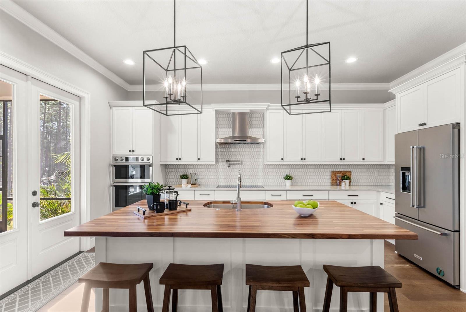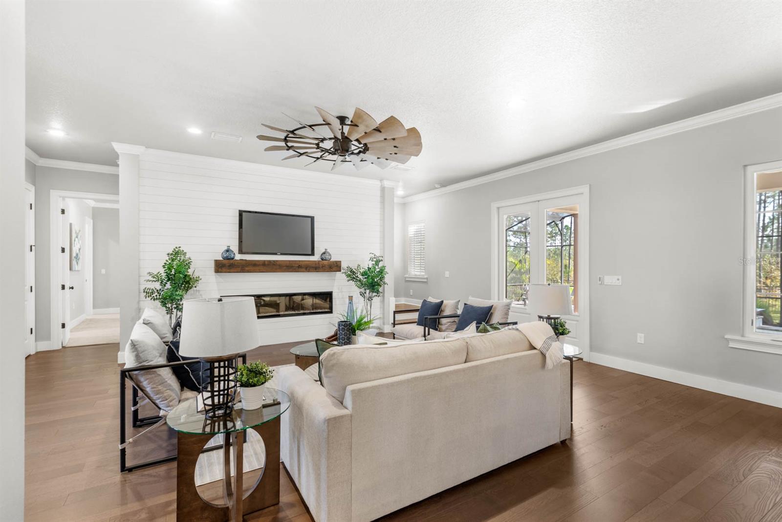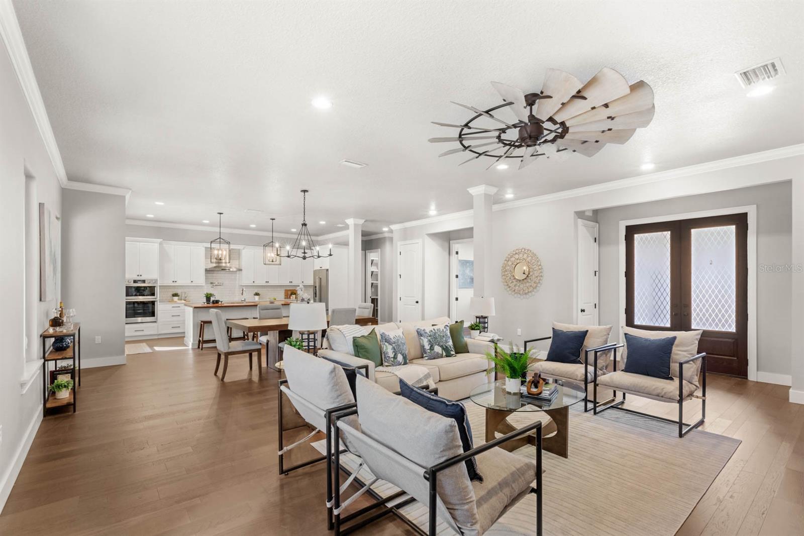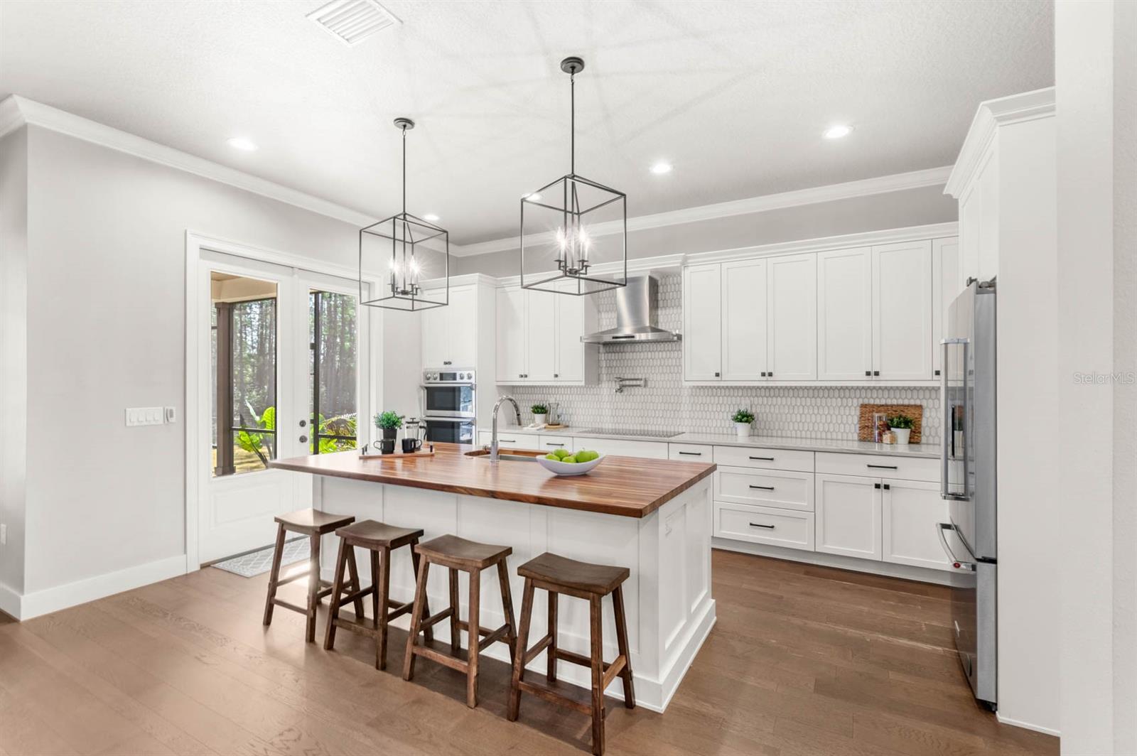 Welcome to 506 Yellow Submarine Court, a stunning 4-bedroom, 3.5-bathroom home with a 3-car garage, located on a cul-de-sac in the gated community of Blue Spring Reserve. Nestled on over two acres, this former model home was designed by J&J Custom Home Builders with premier design elements and an incredible outdoor space, making it the perfect home for both relaxing and entertaining. The entryway boasts an oversized paver driveway, professional landscaping, a Spanish tile roof, and decorative tile accents flanking the wooden double front doors. Upon entering, you’re welcomed by soaring 10-foot ceilings and French doors that offer a picturesque view of the pool area. The open-concept floor plan is highlighted by a built-in fireplace, wood flooring, and crown molding. The chef’s kitchen is equipped with high-end appliances, custom cabinetry, a pot filler, and a large butcher block island, which overlooks the dedicated dining and living areas—perfect for both cooking and entertaining. The first floor includes the primary suite, a dedicated office, and a laundry room for convenience. The primary bedroom features an expansive walk-in closet with custom built-ins and a luxurious en-suite bathroom complete with dual sinks, a soaking tub, and a frameless glass shower. On the second floor, you’ll find a spacious loft—ideal as an additional living space or workout zone—along with three additional bedrooms and two full bathrooms. One of the bedrooms features an en-suite bathroom, making it a perfect junior suite. Prepare to be stunned by the outdoor space! Two sets of French doors—located off the kitchen and living room—offer breathtaking views of the expansive outdoor area, enclosed under a two-story screen. The backyard features a large lanai, oversized paver patio, and a heated saltwater pool with a 10-person spa. The pool area is further enhanced by fountain features, intricate tile work, and custom lighting. Beyond the pool, the fenced homesite backs up to protected conservation land, ensuring permanent privacy with no future construction. This home includes double-pane windows, spray foam insulation, and two 15-SEER HVAC units, enhancing comfort and efficiency. Blue Spring Reserve is in a prime location in Groveland, just one mile from the Turnpike. You’ll enjoy easy access to Downtown Clermont and Downtown Winter Garden, along with a quick commute to Orlando, MCO Airport, and Disney. Don’t miss this rare opportunity to own a custom home on two acres with an incredible pool! Call today to schedule your showing.