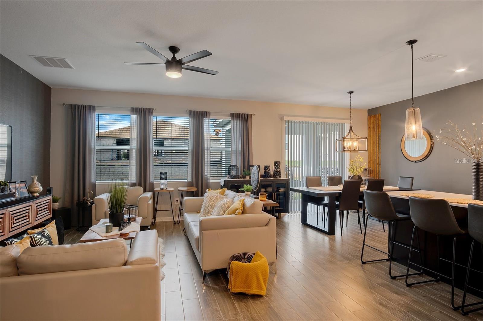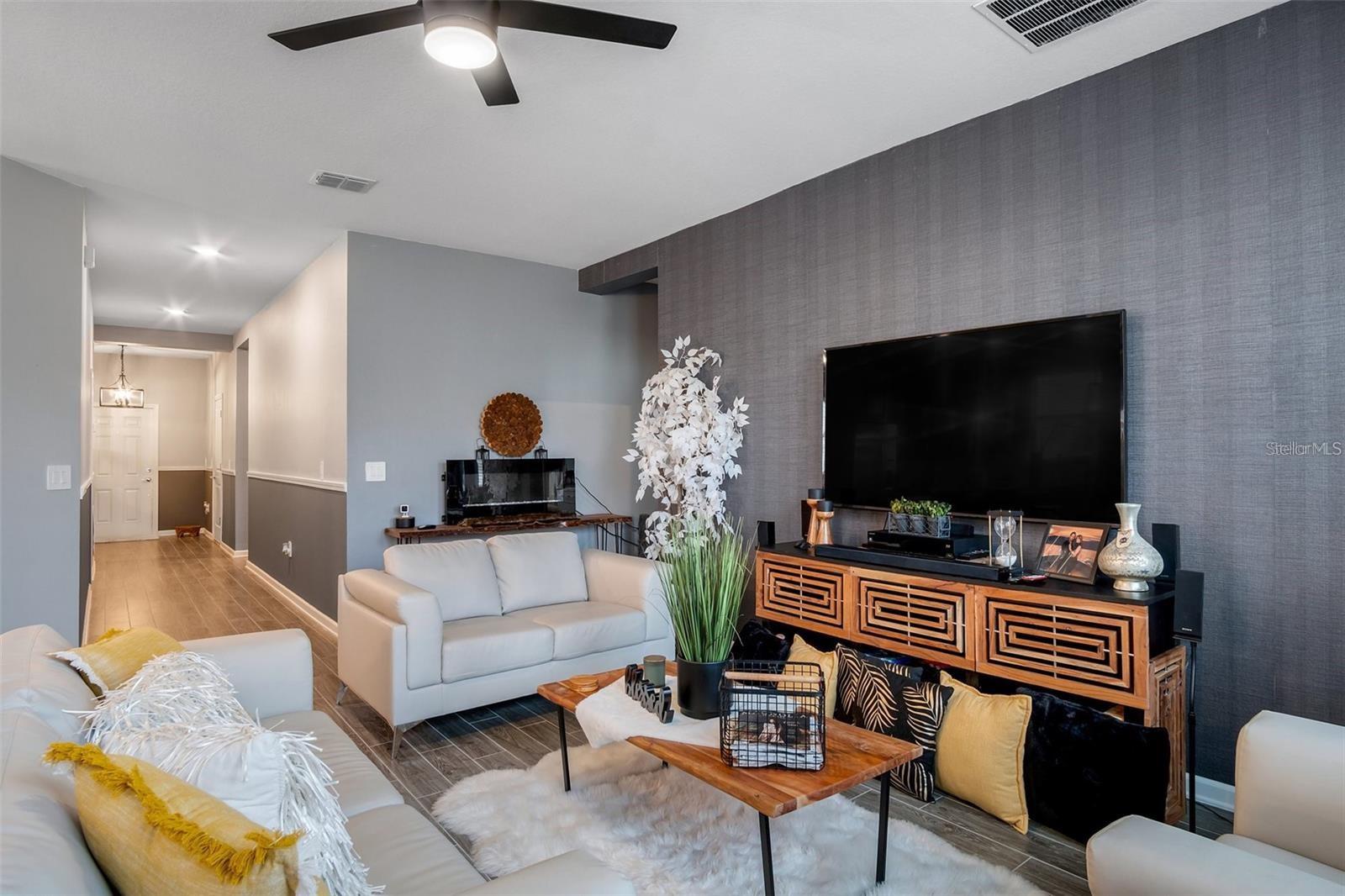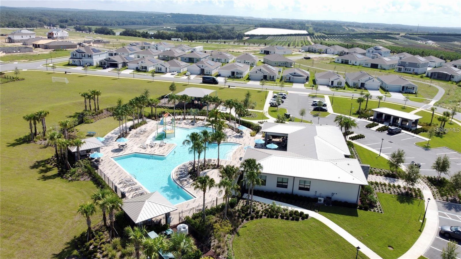 This stunning 4-bedroom, 2-bathroom home is located in the desirable Trinity Lakes neighborhood! Featuring a modern design with high ceilings and an open floor plan, this recently built home is equipped with solar panels for energy efficiency. The spacious kitchen is a standout with its dark espresso cabinetry, elegant quartz countertops, and bright, inviting atmosphere. Tile flooring flows seamlessly through the main living areas. Enjoy a variety of community amenities, such as a resort-style pool, splash pad, playground, fitness center, and clubhouse!