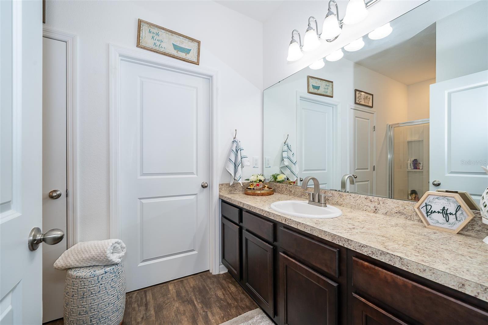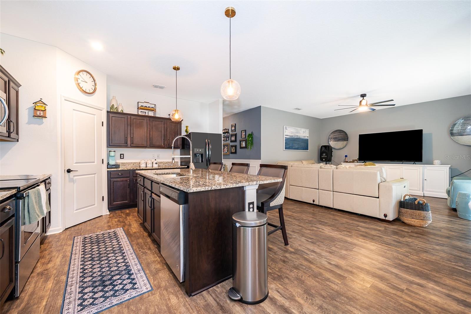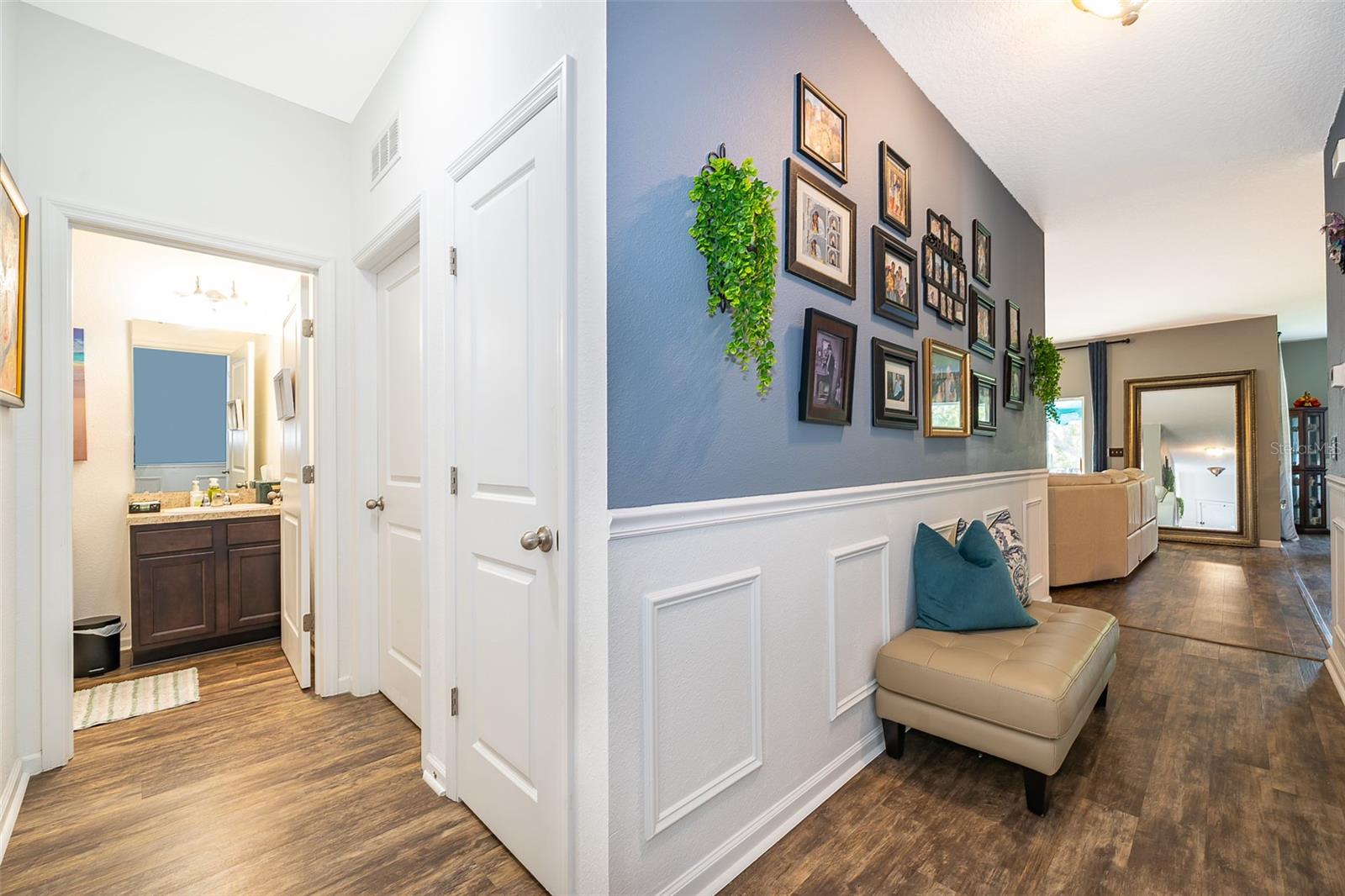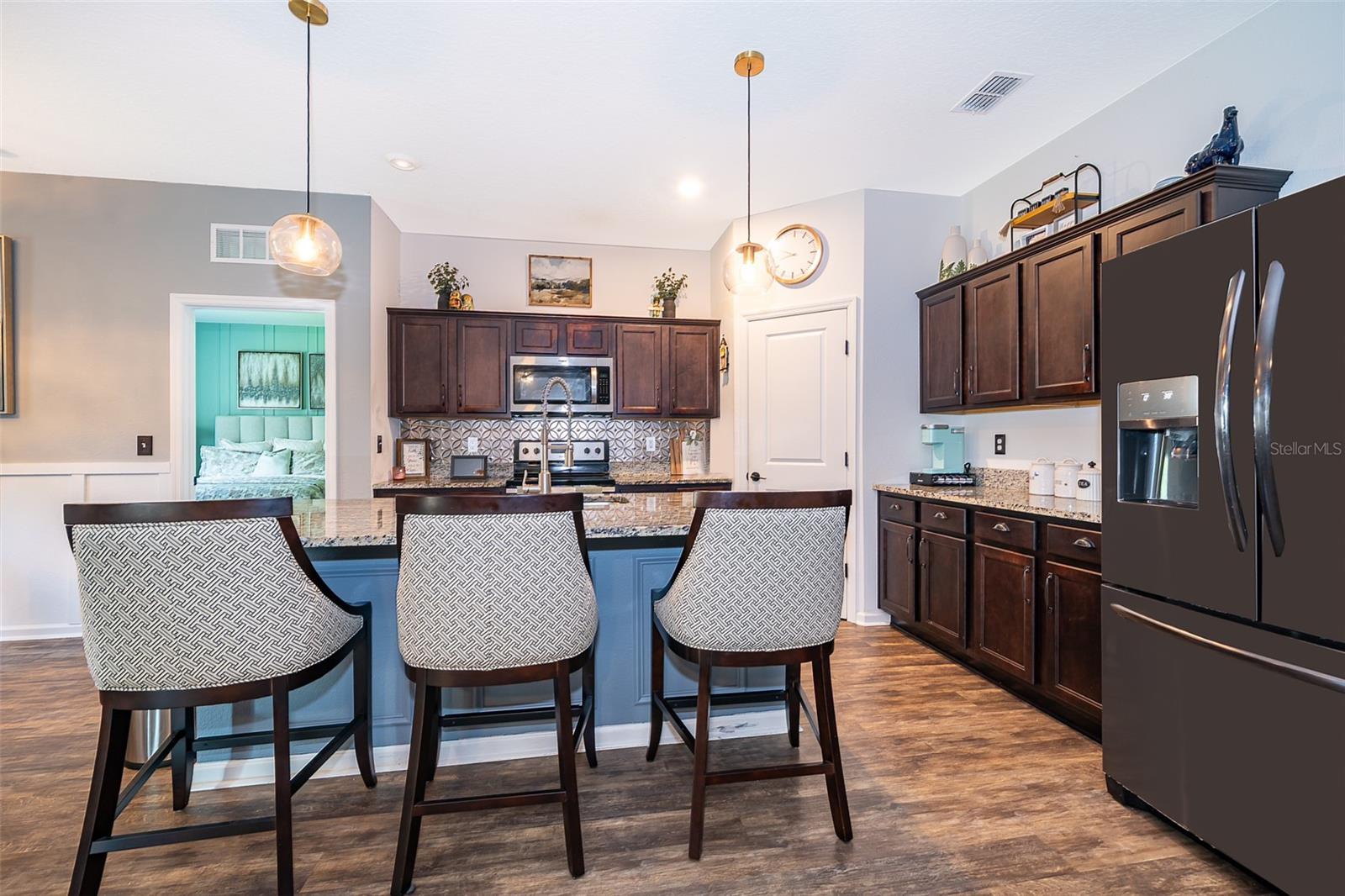 SELLER IS MOTIVATED! TAKE A LOOK at this Beautifully UPGRADED HOME in the private neighborhood of Cherry Lake Landing. NO CDD and LOW HOA! As soon as you glance at the house, you'll notice an inviting screened-in Front Porch. As you walk through the front door, you'll notice the Wainscoting on the walls and Luxury Vinyl Plank flooring. The Living Room, Dining Room and Kitchen are all open and the Kitchen comes equipped with Stainless Steel Frigidaire Fridge, Whirlpool Stove, Dishwasher and Microwave. Also new Pendant Lights over the large extended Island, Crystal Chandelier in the Dining Room, Coffee Bar, and lots of Cabinets! The Primary Bedroom features it's own En-Suite with Shower, Separate Walk-In Closet, and wainscoting on the bedroom walls. The AC is Brand NEW. The Garage can store 2 cars and has cabinets for storage. The Back Yard is Cozy and Inviting with it's Screen-Enclosed Back-Porch that features a relaxing view of nature. The back porch has brand new pavers and gutters were added on the house. Invite the whole family over and hang out in your back porch playing games and socializing. The back yard features a Fire Pit and the yard is fully fenced with vinyl fencing down the sides and rod-iron fence at the very back of the yard so you can see the creek. The neighborhood has a playground and a nature walking path. This property is centrally located near the Turnpike, close to downtown Clermont, Mascotte, Tavares, and only 30 minutes to Disney. You don't want to miss out on making this house your home!