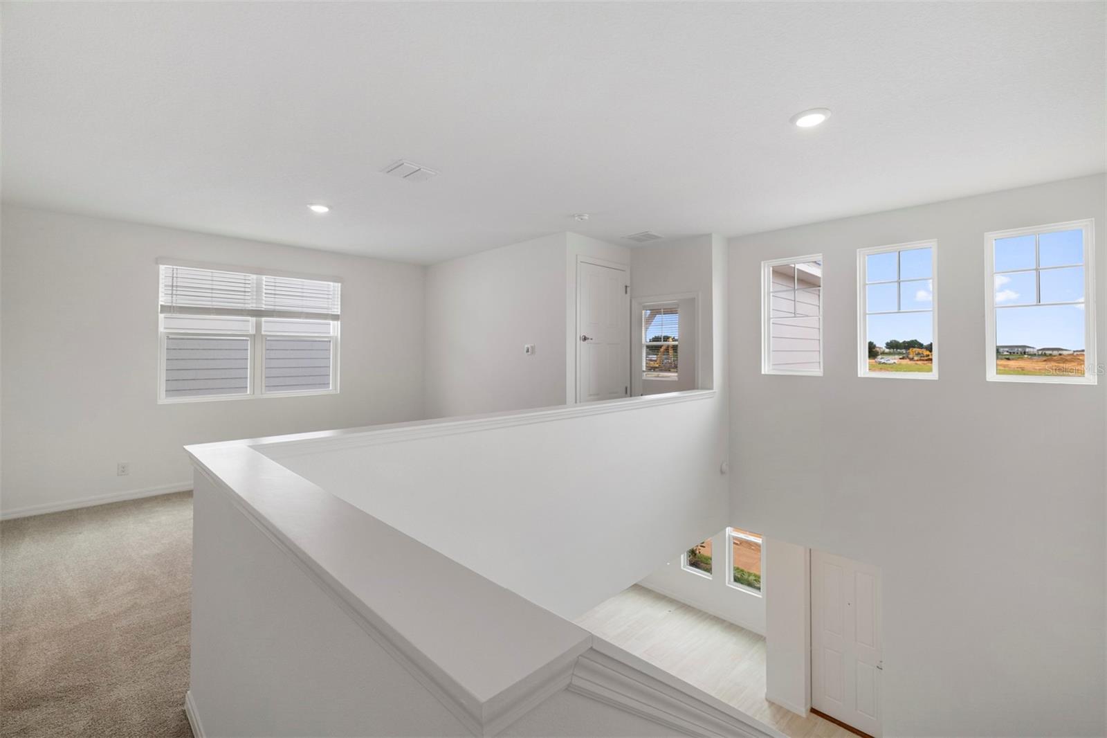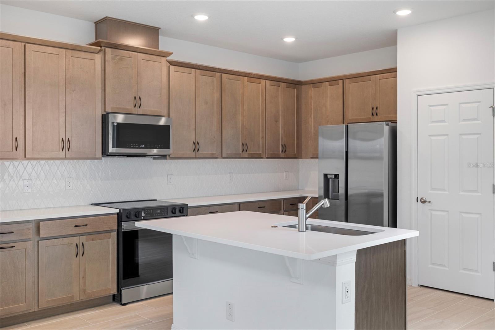 Welcome to the Skye plan — a beautifully designed 3 Bedroom, 2.5 Bath home featuring 9'4" ceilings on the first floor, durable tile flooring in the 1st floor main living areas, and a versatile second-floor Loft, perfect for work or relaxation. The open-concept kitchen is a standout, showcasing 42" cabinets with crown molding, quartz countertops, a stylish tile backsplash, stainless steel appliances, and a center island - great for additional prep space. The kitchen flows seamlessly into the living and dining areas and overlooks the private patio, ideal for outdoor enjoyment. Upstairs, the spacious Primary Bedroom offers a walk-in closet and a luxurious ensuite bath with dual sinks in adult-height vanity, quartz countertops, and shower with upgraded wall tile surround. Future Community amenities include beautiful Pool overlooking Lake Lucy, Cabana, walking trails, and 2 Playgrounds, with future shopping and retail within the Community. Cypress Bluff offers quick access to the Florida Turnpike, and conveniently located just minutes from downtown Groveland and Clermont.