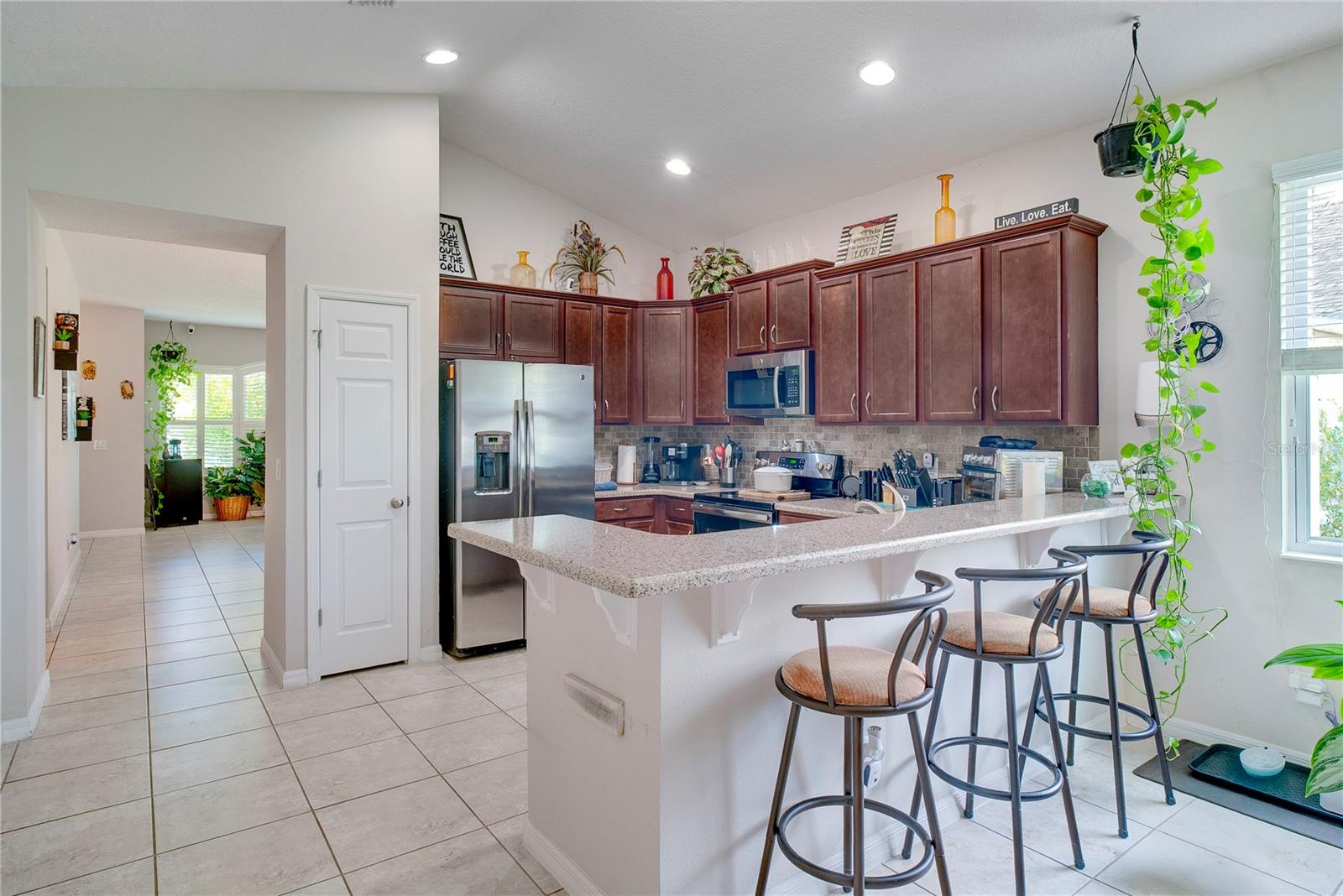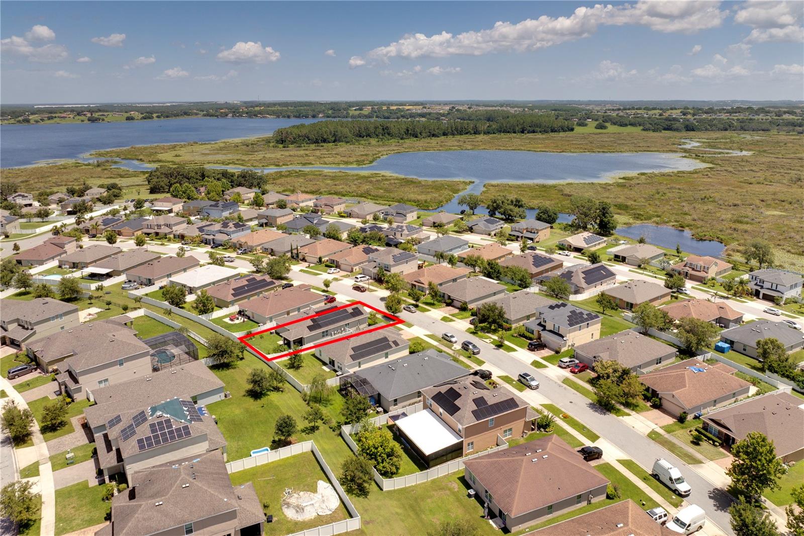 Welcome to a truly move-in ready four-bedroom, two-bathroom home located in the highly desirable Eagle Pointe community in Groveland. Built just nine years ago and offering nearly 2,000 square feet of living space, this home is an excellent option for first-time homebuyers looking for a modern, well-maintained property without the stress of major updates or repairs. One of the standout features of this home is its focus on efficiency and ease of ownership. The full-home solar panel system with battery backup helps keep monthly utility costs low while providing added peace of mind during outages. Additional upgrades such as a whole-house water filtration system and a security system make everyday living more comfortable and secure from day one. Inside, the open-concept layout creates a welcoming and functional space that is easy to furnish and ideal for everyday living. Tile flooring throughout the main living areas is both stylish and practical, offering durability and easy maintenance for busy schedules, pets, or future family needs. The kitchen, dining, and living areas flow naturally together, making the home feel open and connected whether you’re hosting friends or enjoying a quiet night in. Step outside to a screened-in patio and fully fenced backyard, providing a private outdoor space perfect for pets, weekend barbecues, gardening, or simply relaxing with a cup of coffee. The exterior of the home is designed for low maintenance, with window shutters, rain gutters, and landscaping that is easy to care for, helping keep ownership simple and affordable. For those who enjoy an active lifestyle, the Eagle Pointe community offers direct access to the South Lake Trail, which connects to the West Orange Trail, providing miles of scenic paths. The location also offers convenient access to Downtown Clermont, where you’ll find local restaurants, shopping, and community events, allowing you to enjoy the benefits of city amenities while still coming home to a quiet, suburban neighborhood. Whether you’re buying your very first home, relocating from out of state, or looking for a property that is easy to manage and ready to enjoy right away, this home checks all the right boxes. Thoughtfully upgraded, energy efficient, and designed for comfortable everyday living, this Eagle Pointe home is a smart and confidence-building first step into homeownership.