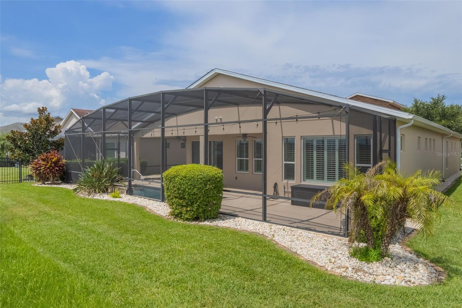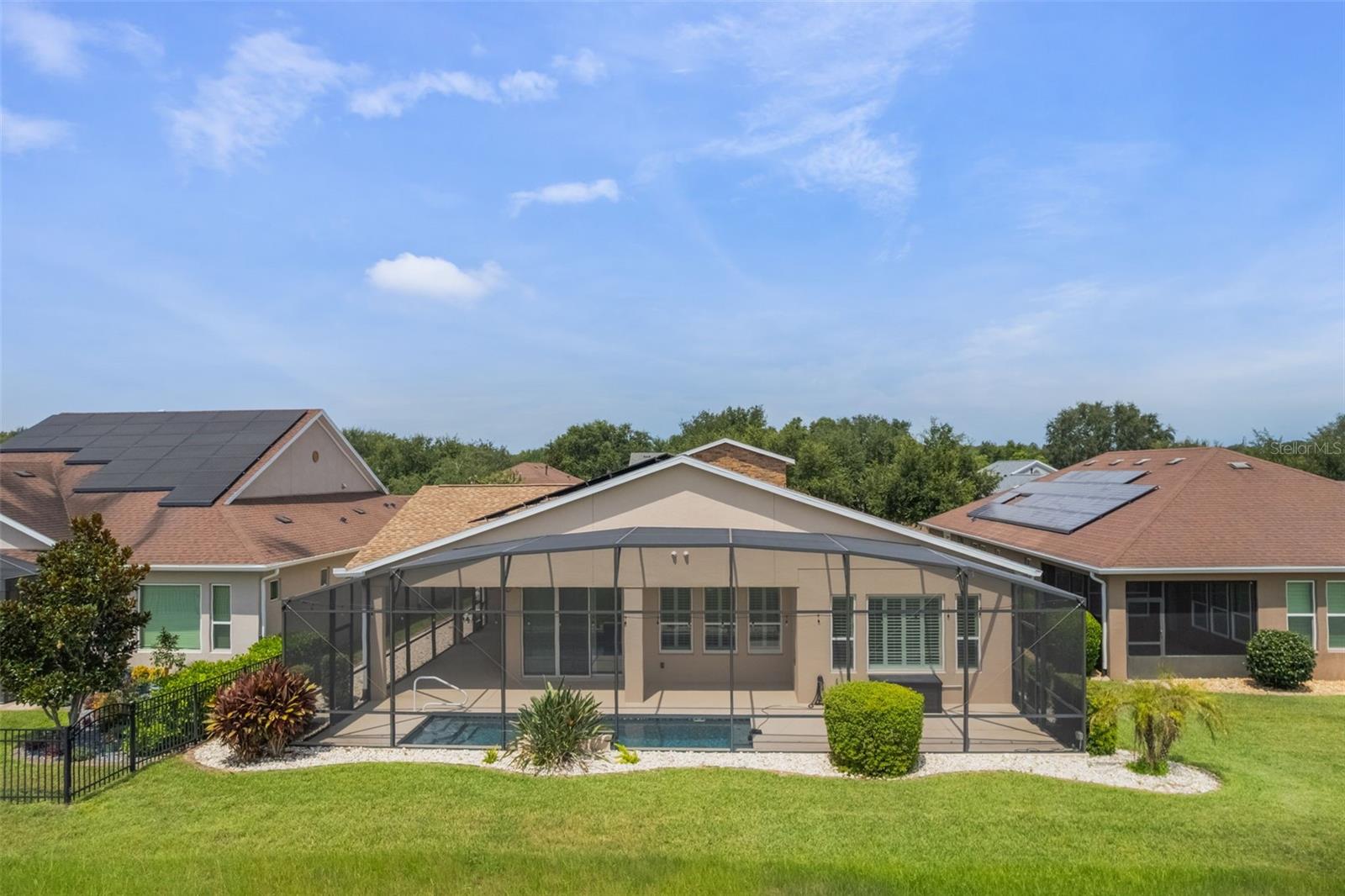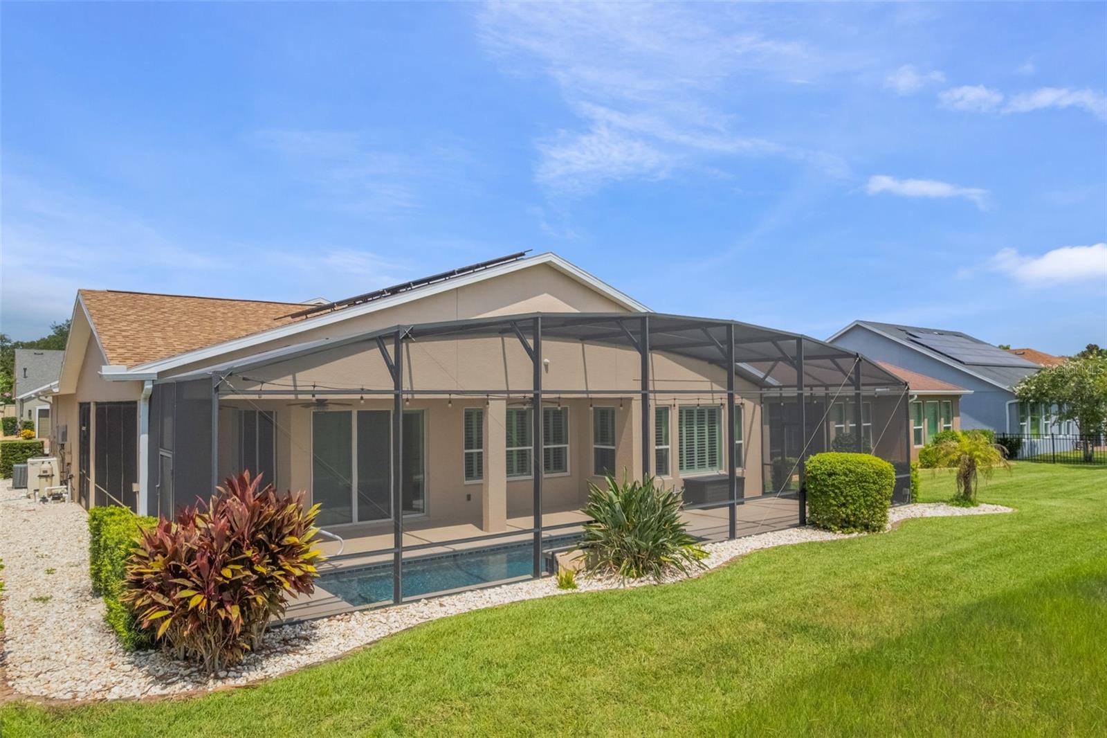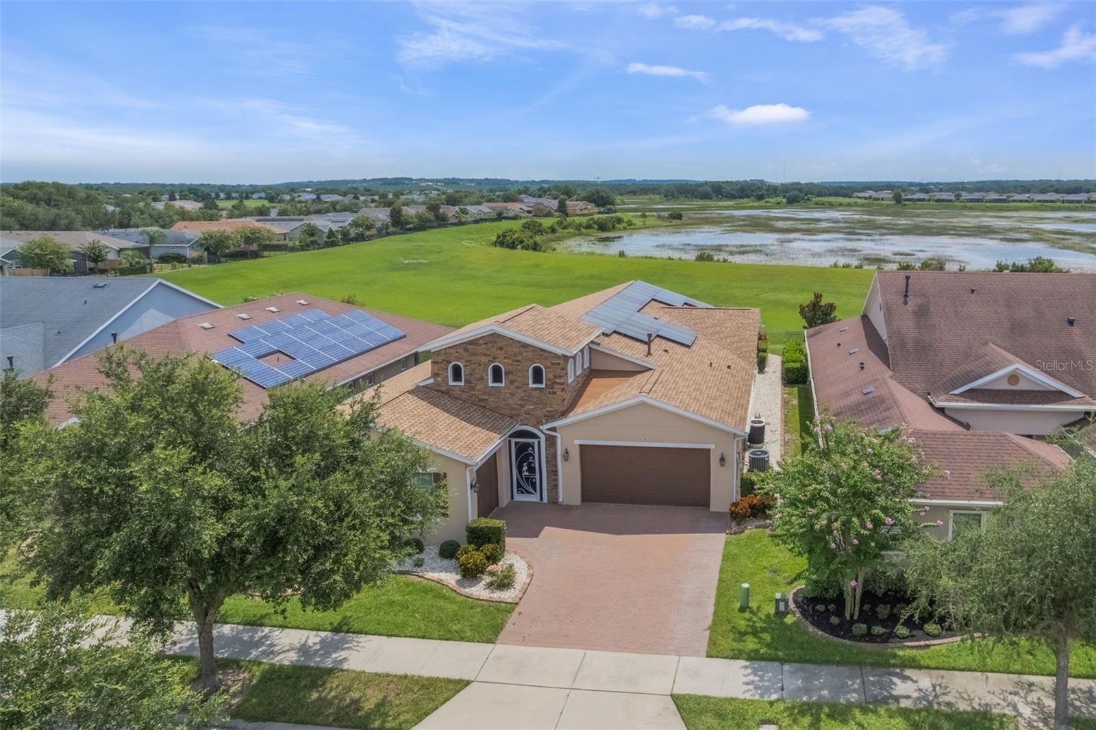 Luxurious Living in Trilogy’s Premier 55+ Community! Welcome to resort-style living at its finest! Located in the highly sought-after Trilogy community, this exquisite home offers the perfect blend of elegance, comfort, and privacy. Nestled on a premium lot with no rear neighbors and tranquil views of Schoolhouse Lake, this residence is designed for both relaxation and entertaining. Step inside to find tile flooring throughout, plantation shutters, and an expansive open layout. The chef’s kitchen is a showstopper—featuring top-of-the-line GE Monogram stainless steel appliances, a 6-burner gas stove, wine fridge, granite countertops, a large entertaining island, pendant lighting, custom exhaust hood, and upgraded cabinetry. The screen-enclosed heated pool and wraparound lanai offer seamless indoor-outdoor living with peaceful lake views—perfect for enjoying Florida sunrises in total privacy. This home boasts 2 spacious bedrooms plus a versatile den/craft room, 2.5 baths, and a 3-car garage. Bedroom 2 has its own private bath. The luxurious primary suite features serene lake views, a spa-like bath with dual vanities, garden tub, walk-in shower, and a walk-in closet. Additional upgrades include wine fridge in kitchen, whole house solar panels for energy efficiency, new roof in 2024 and exterior paint in 2023, tankless water heater, indoor laundry room with built-in desk area and storage cabinets, Radiant barrier insulation in the attic, 10-camera exterior surveillance system. Enjoy the unmatched lifestyle Trilogy offers with "Magnolia House" - The 57,000+ sq ft clubhouse, fitness center, resort pool, tennis, pickleball, restaurant, social clubs, and more—all just steps from your front door. Don’t miss this rare opportunity to own one of the finest homes in Trilogy!