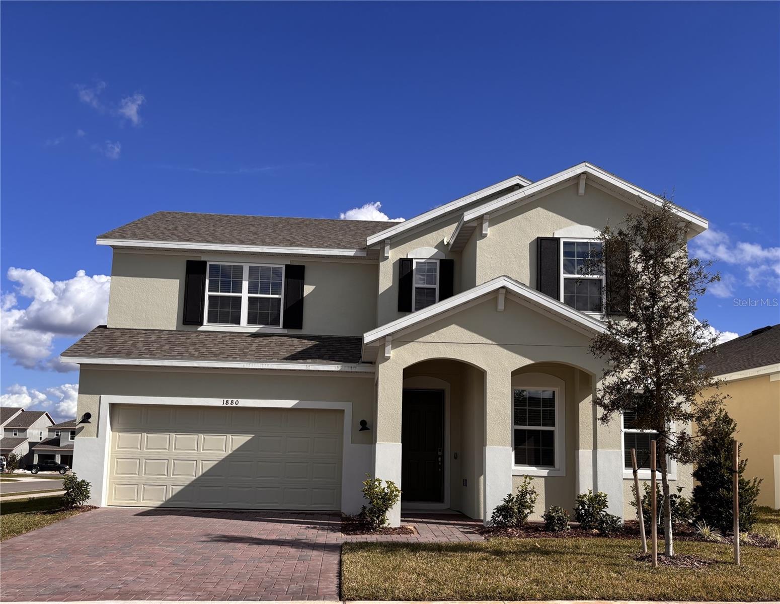 Step into comfort and style with the beautifully designed Newcastle plan, situated on a desirable corner homesite, and offering 4 spacious bedrooms, 2.5 baths, and a versatile front Living Room perfect for a home office or Den. With soaring 9'4" ceilings on 1st floor and an open-concept layout, this home is ideal for entertaining, featuring a modern kitchen with 42" cabinets, quartz countertops, stainless steel appliances, and an oversized pantry closet. The café area overlooks a covered lanai, creating a seamless flow for indoor-outdoor living. Thoughtful upgrades include stylish tile flooring in the 1st floor main living areas, and window blinds and elegant 5 1/4" baseboards are included throughout. The luxurious Primary ensuite bath boasts a walk-in closet, double sinks with adult-height vanity, and walk-in shower with wall tile surround and glass enclosure. Curb appeal shines with attractive landscaping and brick paver driveway and lead walk—this home is a must-see! Trinity Lakes offers exceptional community amenities including Resort style Pool, Splash Pad, Clubhouse, Fitness Center, Fishing pier, dog park, and multiple Playgrounds. Close to Schools, shopping and restaurants and conveniently located near major thoroughfares.