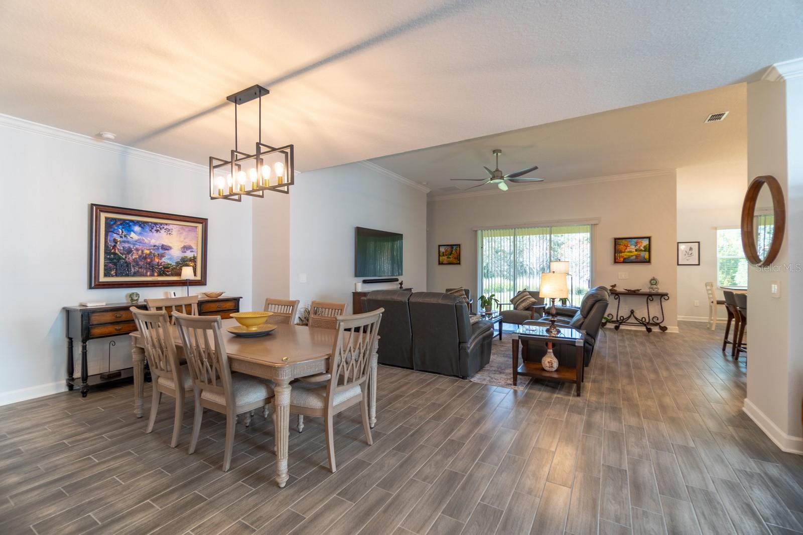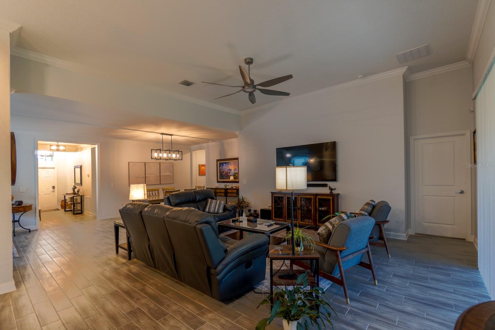 One or more photo(s) has been virtually staged. Unique Opportunity to acquire STUNNING SINGLE STORY 4 bedroom, 3 bathroom, 3 car garage home in Groveland and SELLER will consider giving $10,000 towards buyers closing costs or RATE BUY DOWN with full price offer! The Community of Trinity Lakes is set in beautiful rolling countryside offering the chance to really live amongst "the groves and lakes". Groveland is just 20 minutes from the ever popular Clermont and new and interesting venues like the expanded Crooked Can Brewery in Minneola which is due to open in Summer 2026! (Turnpike exit 278) This area is part of the fastest growth area in Central Florida with new venues and restaurants! THIS HOME SITS ON A PREMUIM LOT AND IS NOT OVERLOOKED BY REAR FACING NEIGHBORS! The original owner has spared NO EXPENSE designing the interior to the highest of standards. The list of highlights this home enjoys is VERY impressive and includes; Vaulted ceilings giving the home a distinct elegance! Bespoke Laundry room with CUSTOM CABINETRY! Samsung front loader washer and dryer included in the sale. CROWN MOLDING in all living areas! THE ENTRY WAY HAS BEEN REDESIGNED AND HAS A CUSTOM WOOD CEILING in the entrance hallway and entry porch. There are QUARTZ Stone counters in the kitchen and all 3 bathrooms! KITCHEN AND BATHROOM CABINETS WITH SOFT CLOSE DRAWERS AND CUPBOARDS, plus lower cupboard slideouts, vented microwave, UNDER CABINET LIGHTING AND STAINLESS STEEL APPLIANCES. The windows and sliding patio doors have also been tinted to conserve your power bills. The house has "leased" solar panels and the cost of $70 passes to the next owner. But this also means that monthly electric bills are extremely low. (Up to $130 in the summer) The Master Bathroom has Dual sinks in the Master bathroom. TWO large master bedroom walk in closets and an enormous glass master shower. Surround sound speakers installed INCLUDING INSIDE THE GARAGE! Ceiling fans in all bedrooms, family room and on the lanai. Additionally gutters and security floodlights and cameras have been installed. The LARGE garage space is perfect for a workshop and has additional power outlets including 220V and overhead storage. Outside there is an external hookup for generator and automatic mains water supply cut off sensor. The home has SMART LIGHT SWITCHES THROUGHOUT! The overall impression gives you an air of "SOPHISTICATION"! This home has to be viewed "in person" to truly appreciate it! This ELEGANT home really is "MOVE IN READY"! MAKE IT YOURS TODAY!
