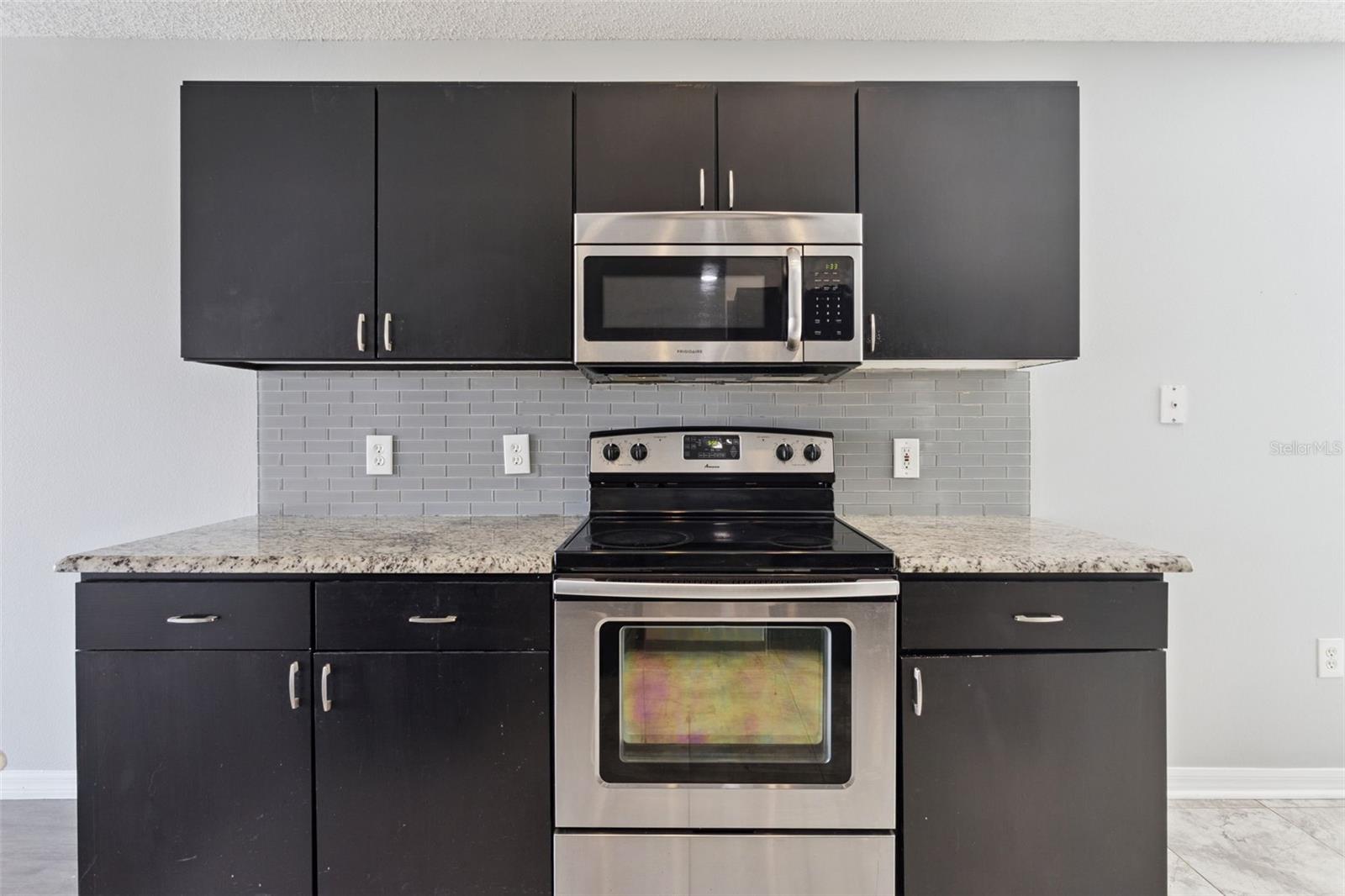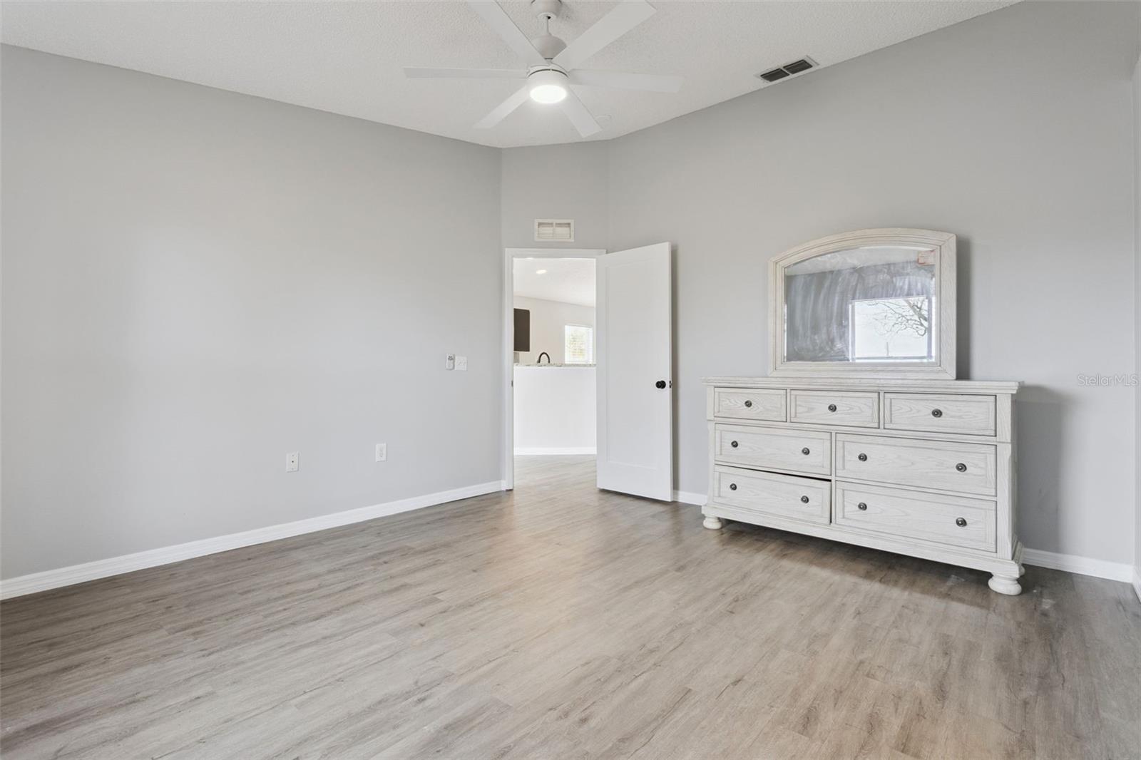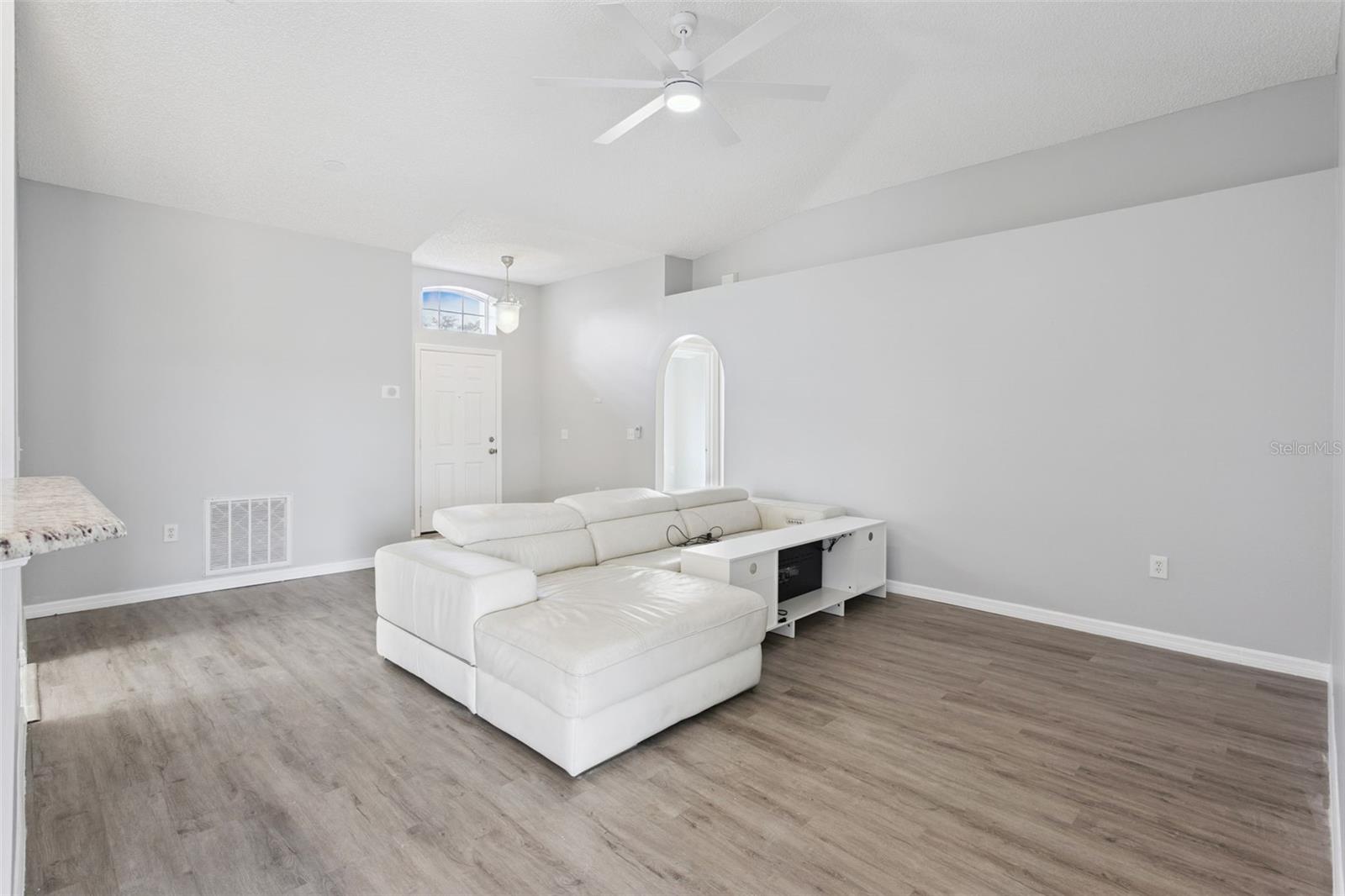 Great home in between downtown Groveland and downtown Clermont. Three bedrooms and two full baths. Easy to clean home with no carpeting. Kitchen has updated granite countertops with custom glass backsplash. Stainless steel appliances with newer upgraded refrigerator. Ceramic tile in kitchen and baths. Pretty wood-look flooring throughout all living areas. High ceilings in living, dining and primary bedroom give you a nice airy and spacious feeling. The primary bath has a large soaking tub and an upgraded walk-in tile shower and walk-in closet. The two additional bedrooms are separated by the full bath with tub and shower combination. Inside laundry and attached two-car garage. No rear neighbors. The location is excellent with Publix, Walgreens, Dunkins, Wendys, McDonalds, KFC and Mama Rita's Italian Eatery, among other things, all within three minutes. Close to South Lake bike trail and all the events in downtown Clermont. This home has a lot to offer at a great price. Roof and water heater are both 2017. Come and view this wonderful and affordable home today.