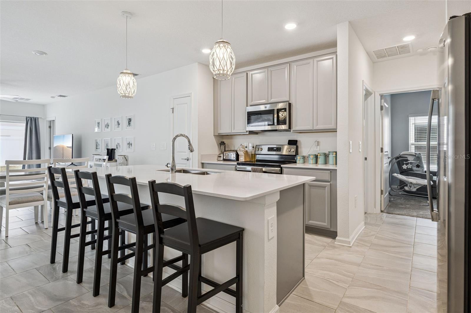 This stunning home is Groveland is waiting for you! Located in the sought-after community of Trinity Lakes, this gorgeous 3-bedroom, 2-bath home offers 1,432 square feet of thoughtfully designed living space that feels both inviting and functional. A spacious driveway and manicured front lawn create a warm welcome before you even step inside. The foyer opens to an expansive hallway that leads you into the heart of the home, an open-concept living, dining, and kitchen area designed for connection! Whether you’re hosting friends or enjoying a quiet night in, this layout ensures you never miss a moment with your loved ones. The kitchen features an oversized island with breakfast bar seating, stainless steel appliances, modern finishes, and abundant storage, so meal prep feels like a breeze. Overlooking the dining and living areas, this kitchen is a space where conversations flow as easily as the floor plan. Tucked at the back of the home for optimal privacy, the primary suite serves as a peaceful retreat. It includes a spacious walk-in closet and a beautifully appointed en suite bath with a large shower stall, rain shower head, and dual sink vanity that makes mornings effortless. The additional bedrooms are generously sized with ample natural light and storage, ensuring every one in the family feels right at home. Step outside to a fully fenced backyard that offers peace of mind and plenty of room for little ones or pets to roam freely. It’s the perfect backdrop for weekend relaxation, summer BBQ or outdoor play in the warm Florida sun. Life in Trinity Lakes extends well beyond your front door. Residents enjoy access to a beautifully appointed community center with a large furnished indoor gathering space, a sparkling resort-style pool with a kid-friendly splash zone, a fitness center, playground, and stunning walking trails that wind throughout the neighborhood. Surrounded by picturesque lakes and parks, the area makes it easy to embrace Florida’s natural beauty while remaining close to major highways, excellent shopping and dining, and great schools. This home offers the perfect blend of comfort, community, and convenience, all in one exceptional location. Don't miss out on the opportunity to call this home your own, schedule a private showing TODAY!!!