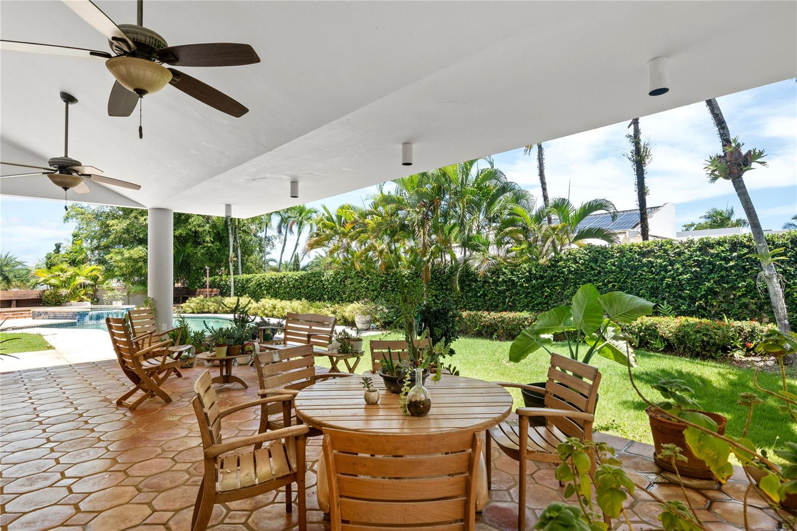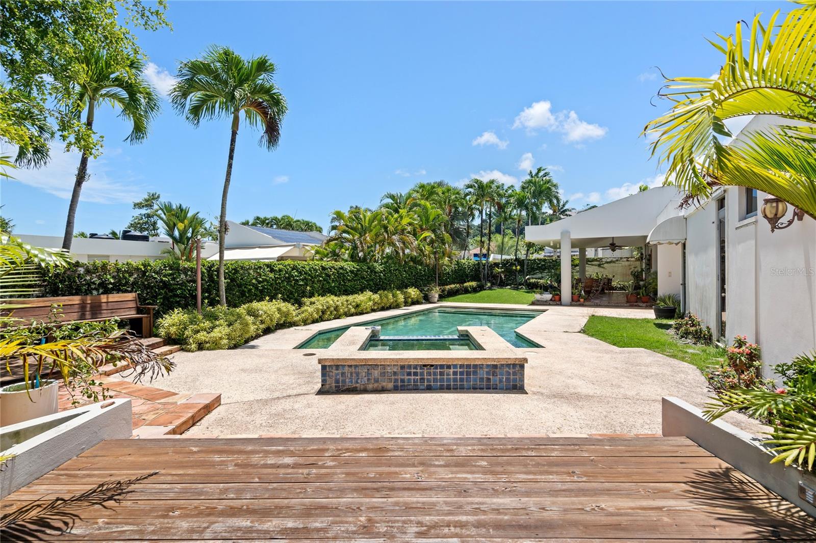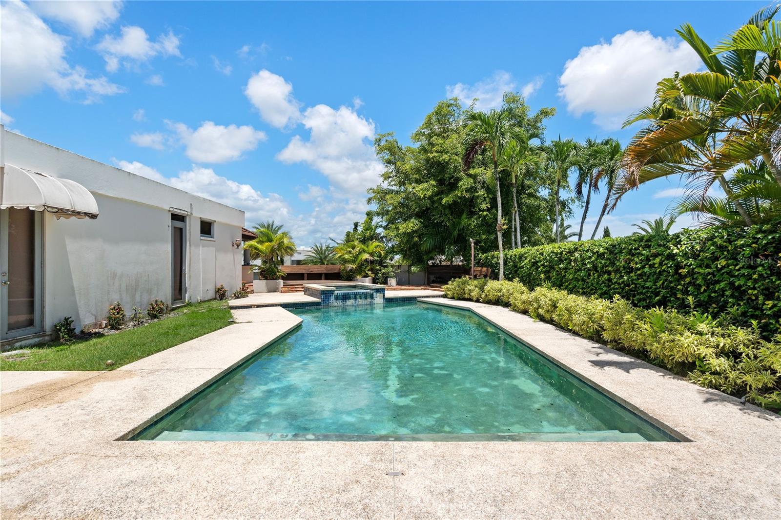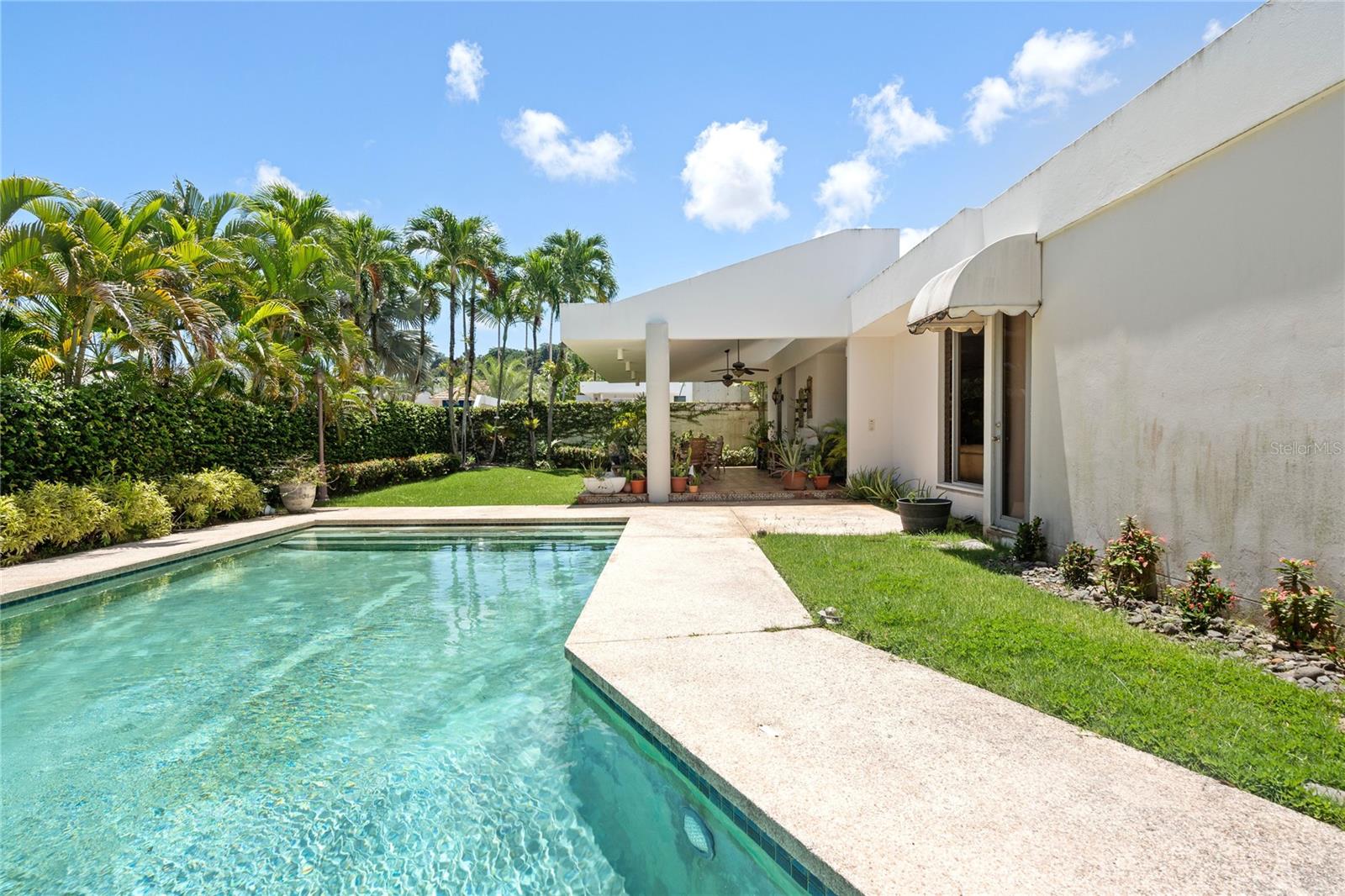 This glamorous property is located in a gated community in Guaynabo, La Villa de Torrimar. Modern tropical home with an open layout design. This property is a MODEL 1, built on a 1,079 sq mt lot and has 4,500 square feet of construction area. The residence features high ceilings, glass windows that provide natural light, and glass doors that open to a tropical terrace, a gazebo and a stunning swimming pool area. Spectacular landscaped garden filled with lush vegetation. Perfect home for entertaining family and friends. Remodeled kitchen with granite countertops and top of the line appliances. This home offers 5 bedrooms, 4 full bathrooms and a powder room. Luxurious Master bedroom overlooking the pool with an en-suite bathroom and walking closet. Three spacious bedrooms and one additional room ideal for office, playroom or guest room with an ensuite bathroom. Laundry room and a garage for two cars. For your convenience this home also offers : 27k Diesel Generator with a capacity of 250 gallons0, 3 inverters a/c units, 3 split a/c units. Exclusively for La Villa de Torrimar residents enjoyment: 24/7 security, fitness room, activity room, beach tennis courts, basketball, tennis courts, volleyball courts and playground area. Conveniently located close to private schools, shopping centers and other places of interest.