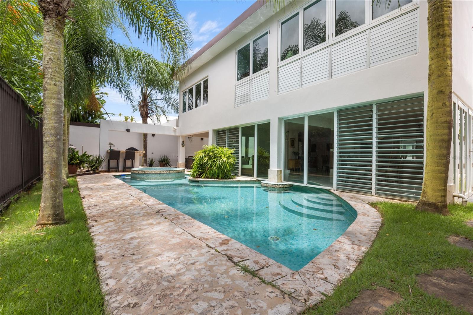 Welcome home to a tranquil retreat in the respected neighborhood of Palma Real in Guaynabo. This two-level residence seamlessly blends comfort and high living. Enjoy 3,877 sq ft of meticulously designed living space on a generous 506.42 sq m lot. The extended living area offers an open and comfortable space. The home features 4 spacious bedrooms, 4 full bathrooms and 2 half bathrooms. There are two master suites; all bedrooms has ensuite bathrooms ensuring comfort and privacy for all. Also, has a family and a bonus room that provides additional space for either entertainment or working/study area. The kitchen ample counter space, and plenty of cabinetry, perfect for culinary enthusiasts and everyday cooking. An attractive terrace and swimming pool provide the perfect setting for relaxation and entertaining. This property offers significant privacy, as there are no neighbors at the back of the house. Equipped with solar panels and a water tank, this home offers energy efficiency and sustainability. Palma Real offers full-time security and great amenities such as a gym and swimming pool, among others. A covered garage provides secure parking for your vehicles. This exquisite property is more than just a house; it's a place of peace and joy, ready to welcome you home.
