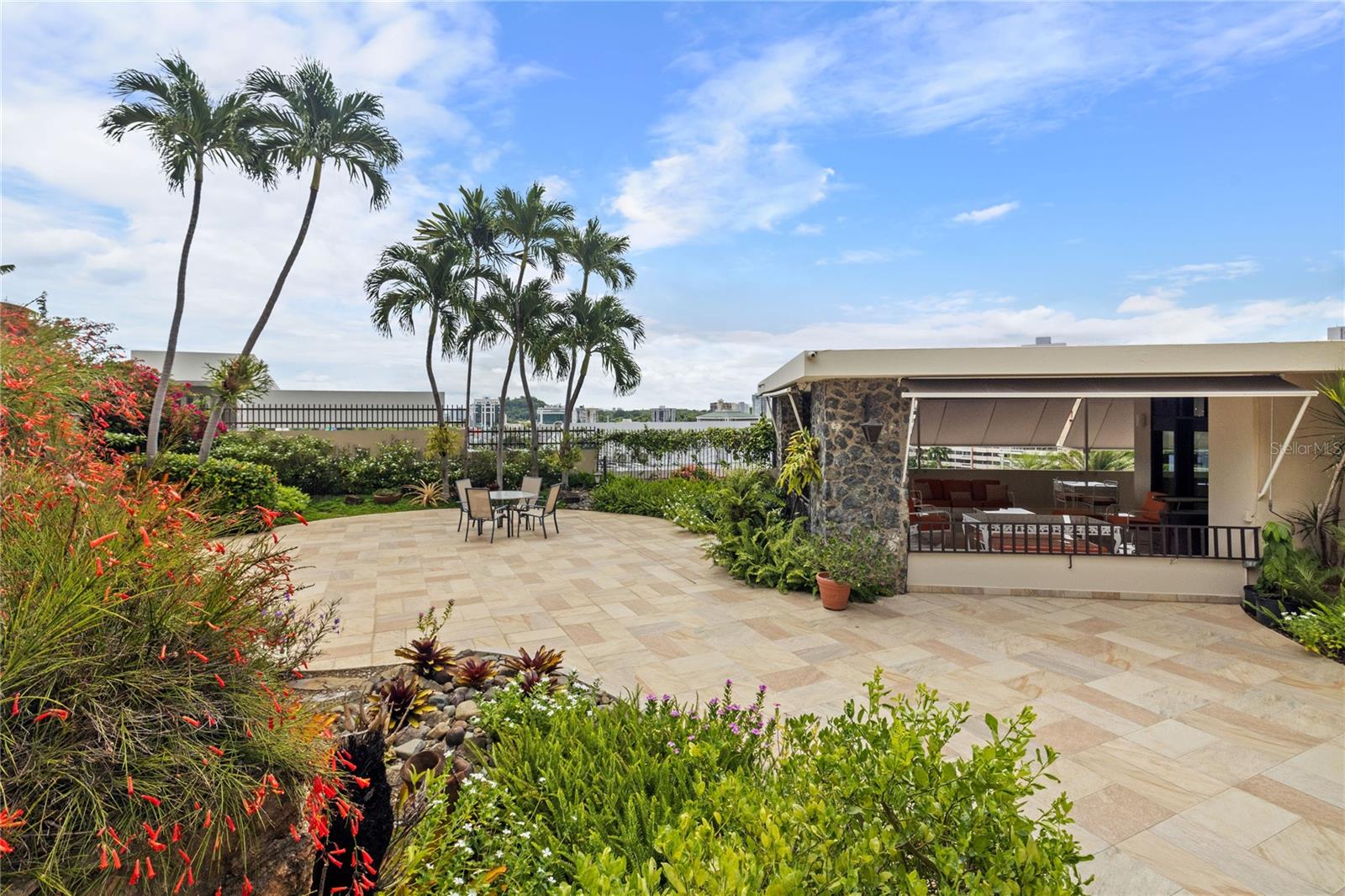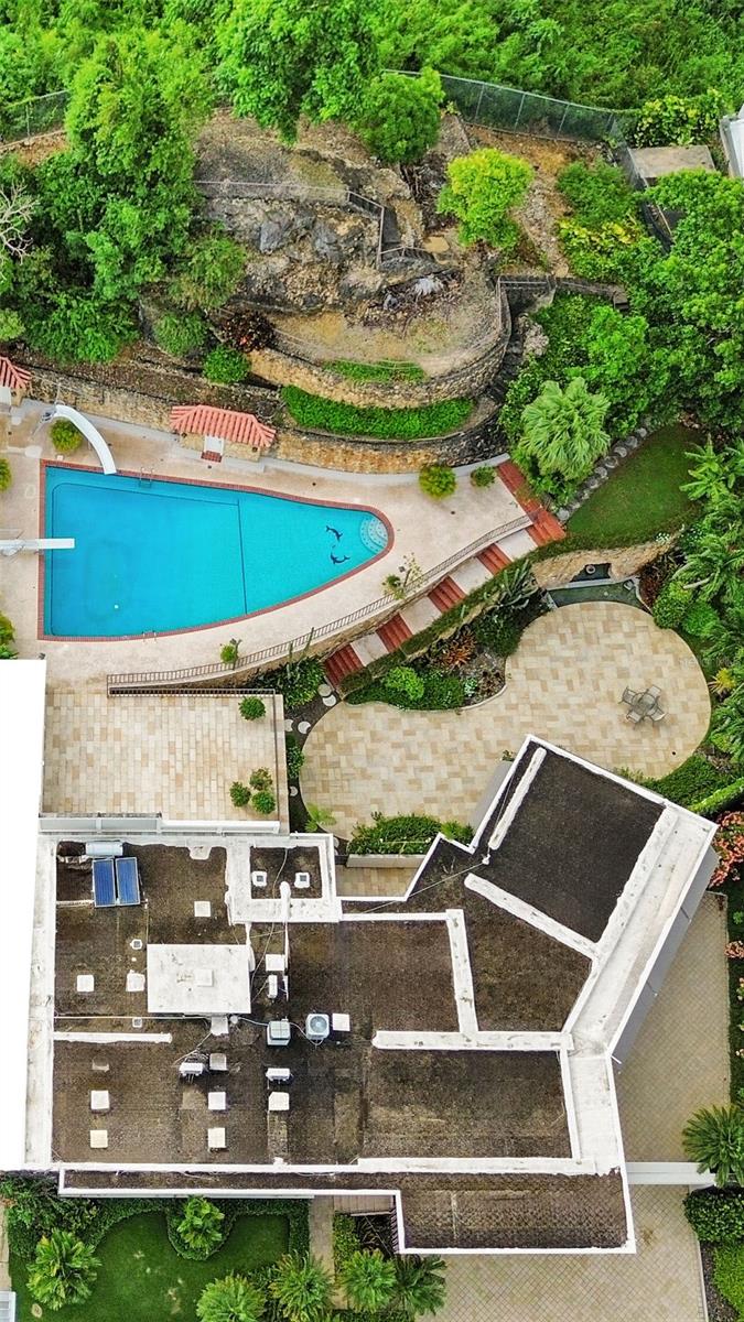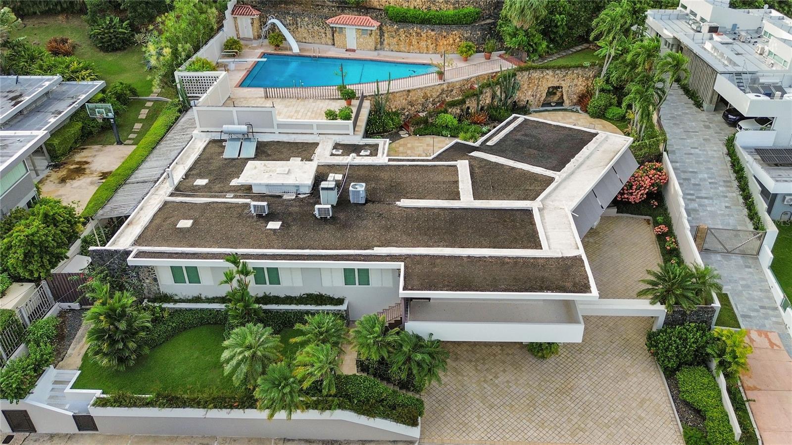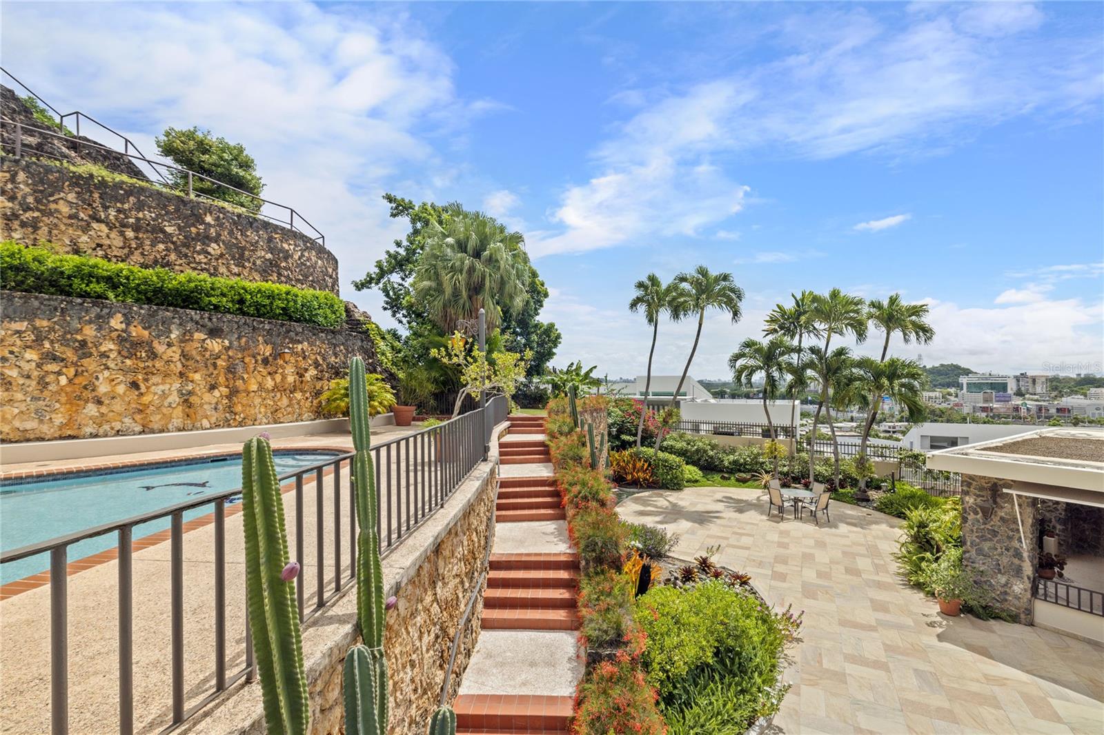 Experience serenity in this elegant home, perched on a small hill in Villa Caparra, Guaynabo, offering stunning city views of Guaynabo and San Juan. Enjoy the privacy of this residence and the refreshing breeze from the trade winds. Located in a gated and secure community with easy access through multiple entry points, this house is an ideal retreat. The property features a beautiful terrace overlooking a patio with a stone-covered wall, where all stones have been reclaimed from the original construction. The garden includes a charming fountain, several fruit trees, and a swimming pool area complete with a full bathroom. Inside, the home boasts pristine terrazzo floors with bronze inlays, high ceilings, and large windows that bathe the space in natural light. The spacious kitchen offers a view of the patio and is accompanied by a separate laundry room and maid’s quarters. Among the seven bedrooms and six bathrooms, a separate level includes a bedroom that could serve as a guest room, plus an office. The house encompasses 3,991 square feet of living space and sits on 1,993 square meters of land. Full back up 30 kilos generator, water tank, solar water heater and much more completes this classic and special house.