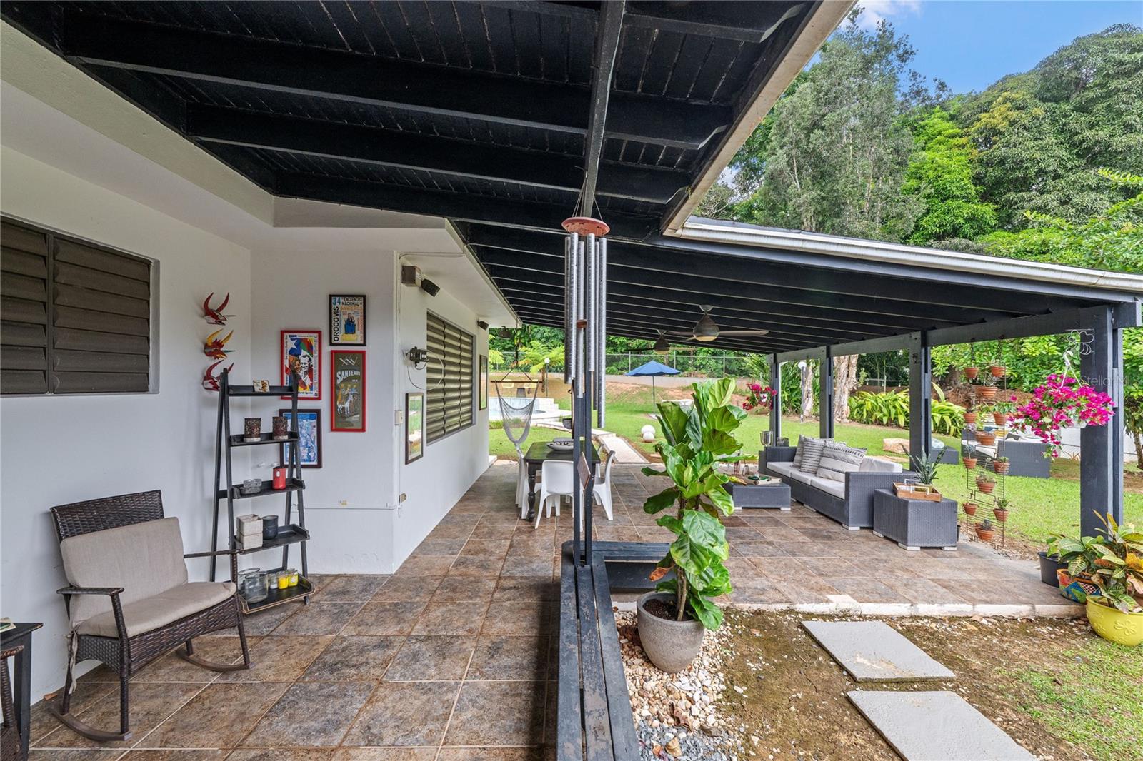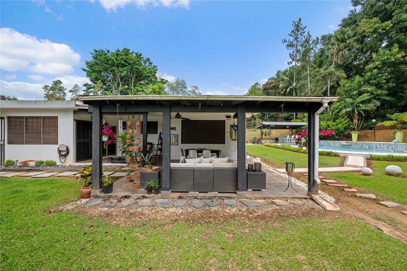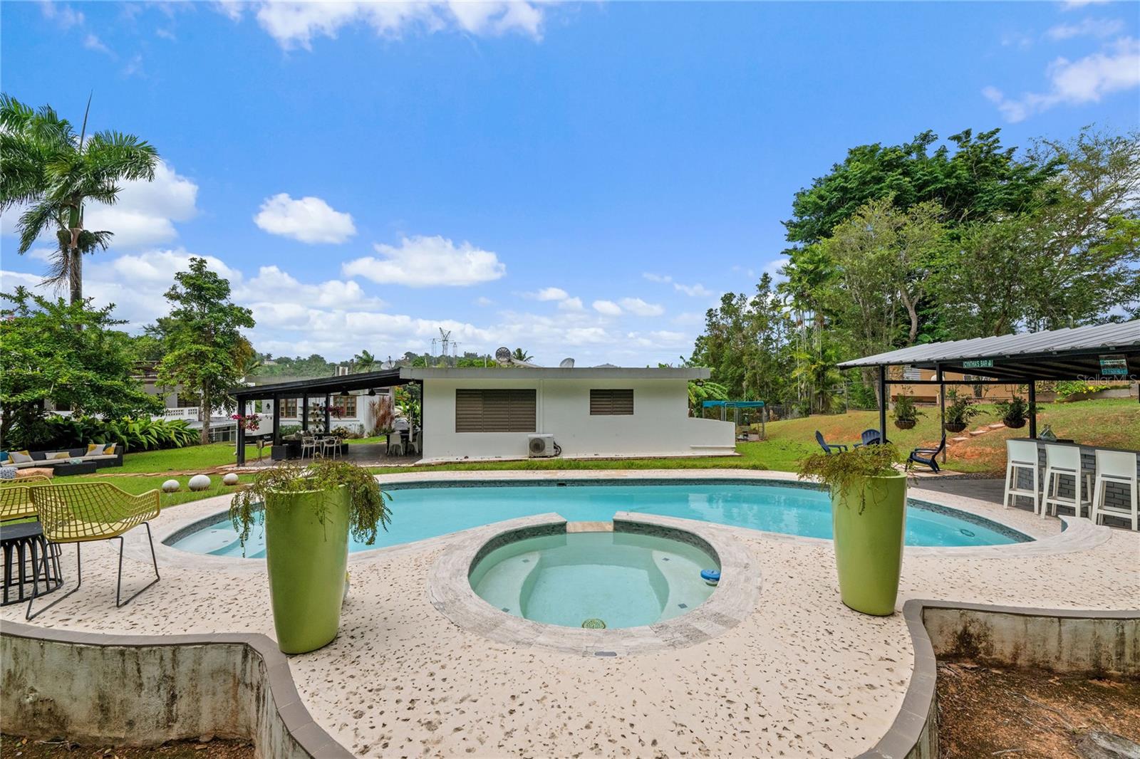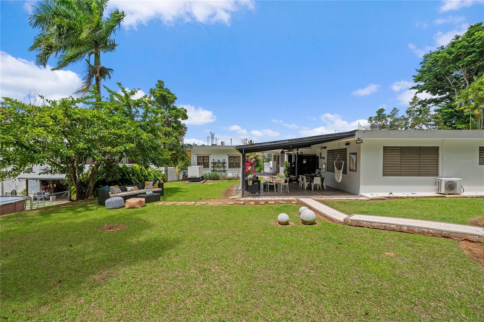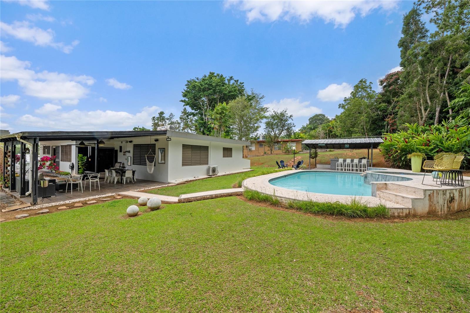 Discover the perfect blend of city convenience and tranquil countryside living in this beautiful one-story home in Lomas del Sol, Guaynabo. This property offers the best of both worlds—easy access to urban life while being surrounded by nature, lush vegetation, and fresh breezes. Situated on an expansive 2,182 m² lot, this contemporary residence boasts 1,864sq ft. The property features impressive outdoor oasis great for entertaining. The interior showcases an open-concept layout, including a living room, dining area, an inviting family room, and kitchen with top-of-the-line appliances. The house spans three bedrooms with two bathrooms, and a powder room, additionally two flex rooms currently used as an office and storage room, convertible to a private apartment. Enjoy resort-style amenities including a Salt Water Pool with an Inverter Motor, an outdoor bar with BBQ area, and a fire-pit or lechónera. Designed for comfort and sustainability, the property is fully equipped with a 12k Generator, 23 Solar Panels, 2 Tesla batteries, and a Solar Water Heater. This home invites you to live a lifestyle that seamlessly combines nature, comfort, and convenience. Don’t miss this rare opportunity, call today to schedule your private showing!
