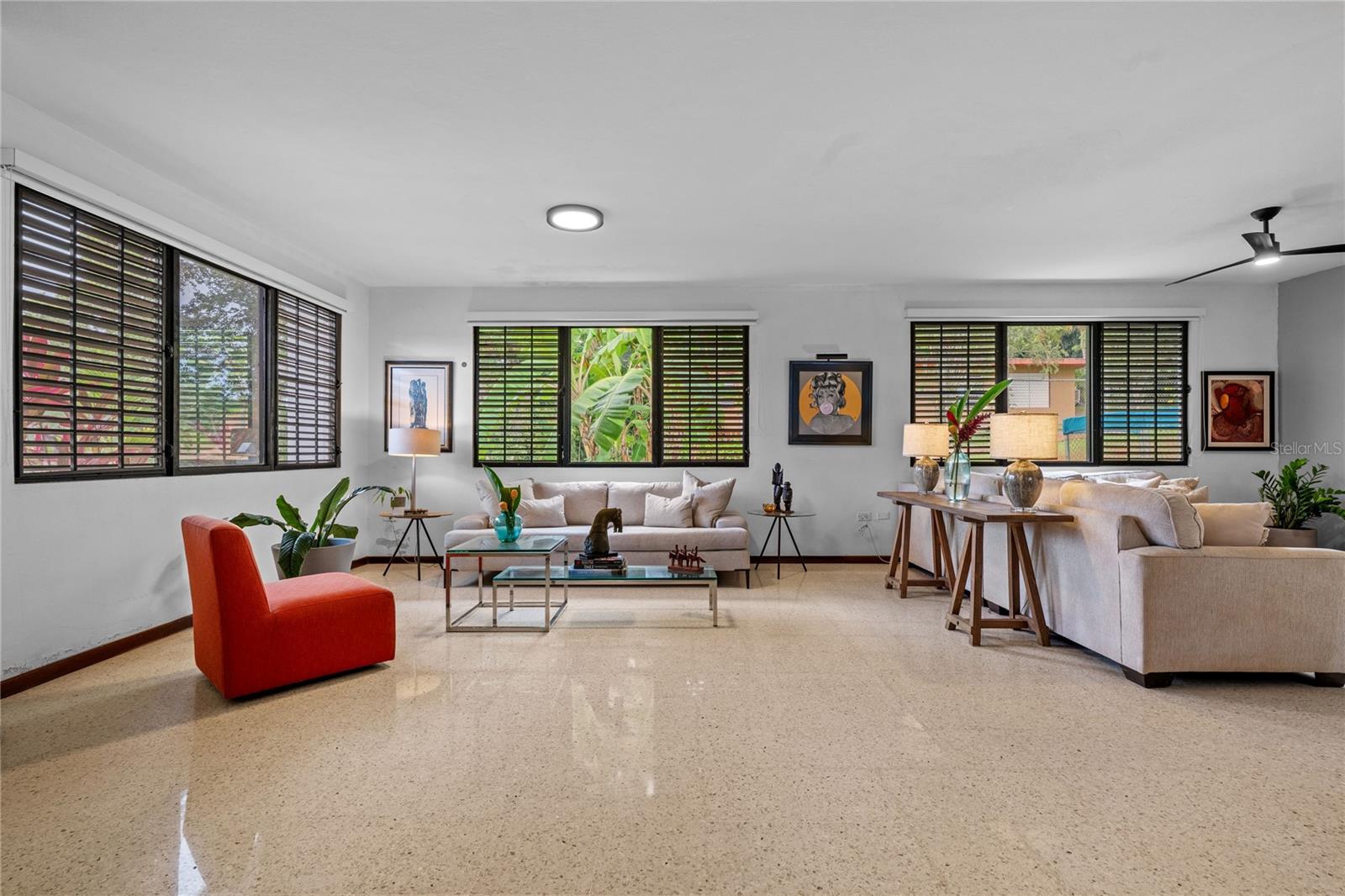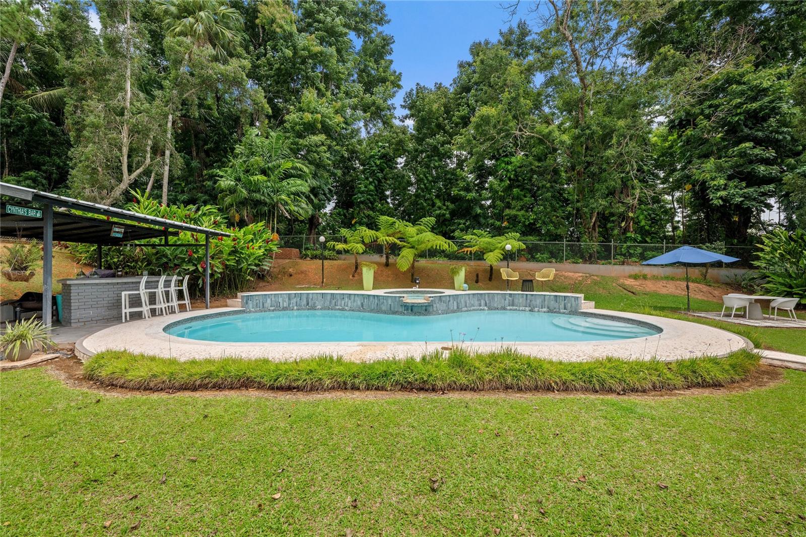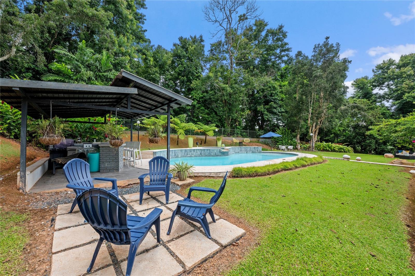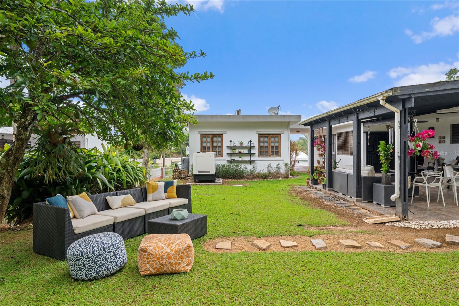 Discover the perfect blend of city convenience and tranquil countryside living in this beautiful one-story home in Lomas del Sol, Guaynabo. This property offers the best of both worlds—easy access to urban life while being surrounded by nature, lush vegetation, and fresh breezes. Situated on an expansive 2,182 m² lot, this contemporary residence boasts 1,864sq ft. The property features impressive outdoor oasis great for entertaining. The interior showcases an open-concept layout, including a living room, dining area, an inviting family room, and kitchen with top-of-the-line appliances. The house spans three bedrooms with two bathrooms, and a powder room, additionally two flex rooms currently used as an office and storage room, convertible to a private apartment. Enjoy resort-style amenities including a Salt Water Pool with an Inverter Motor, an outdoor bar with BBQ area, and a fire-pit or lechónera. Designed for comfort and sustainability, the property is fully equipped with a 12k Generator, 23 Solar Panels, 2 Tesla batteries, and a Solar Water Heater. This home invites you to live a lifestyle that seamlessly combines nature, comfort, and convenience. Don’t miss this rare opportunity, call today to schedule your private showing!