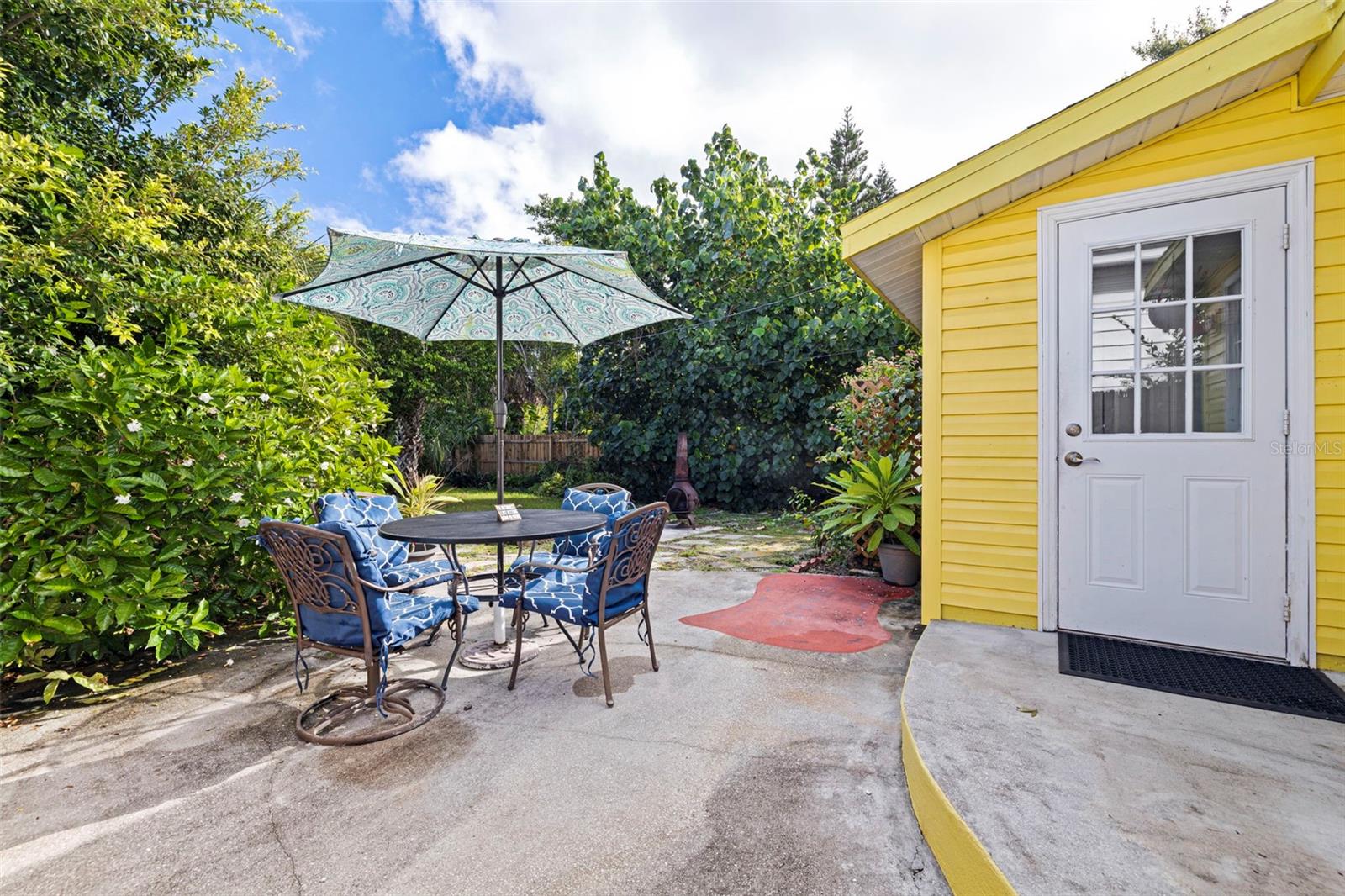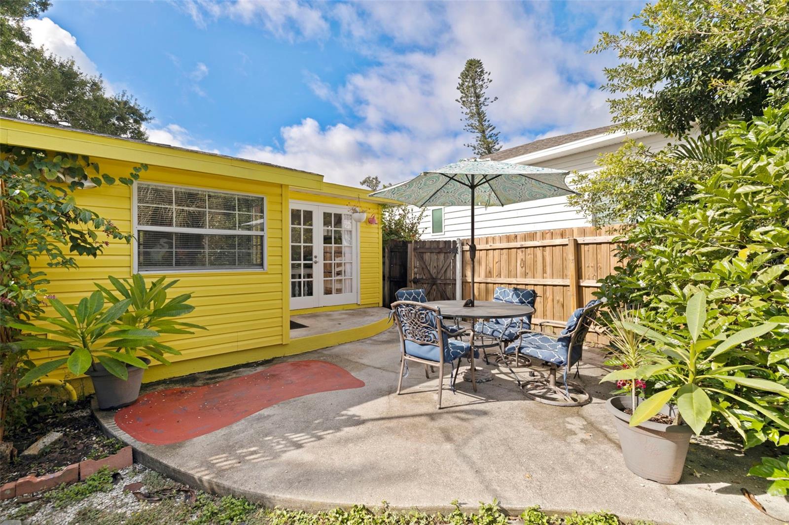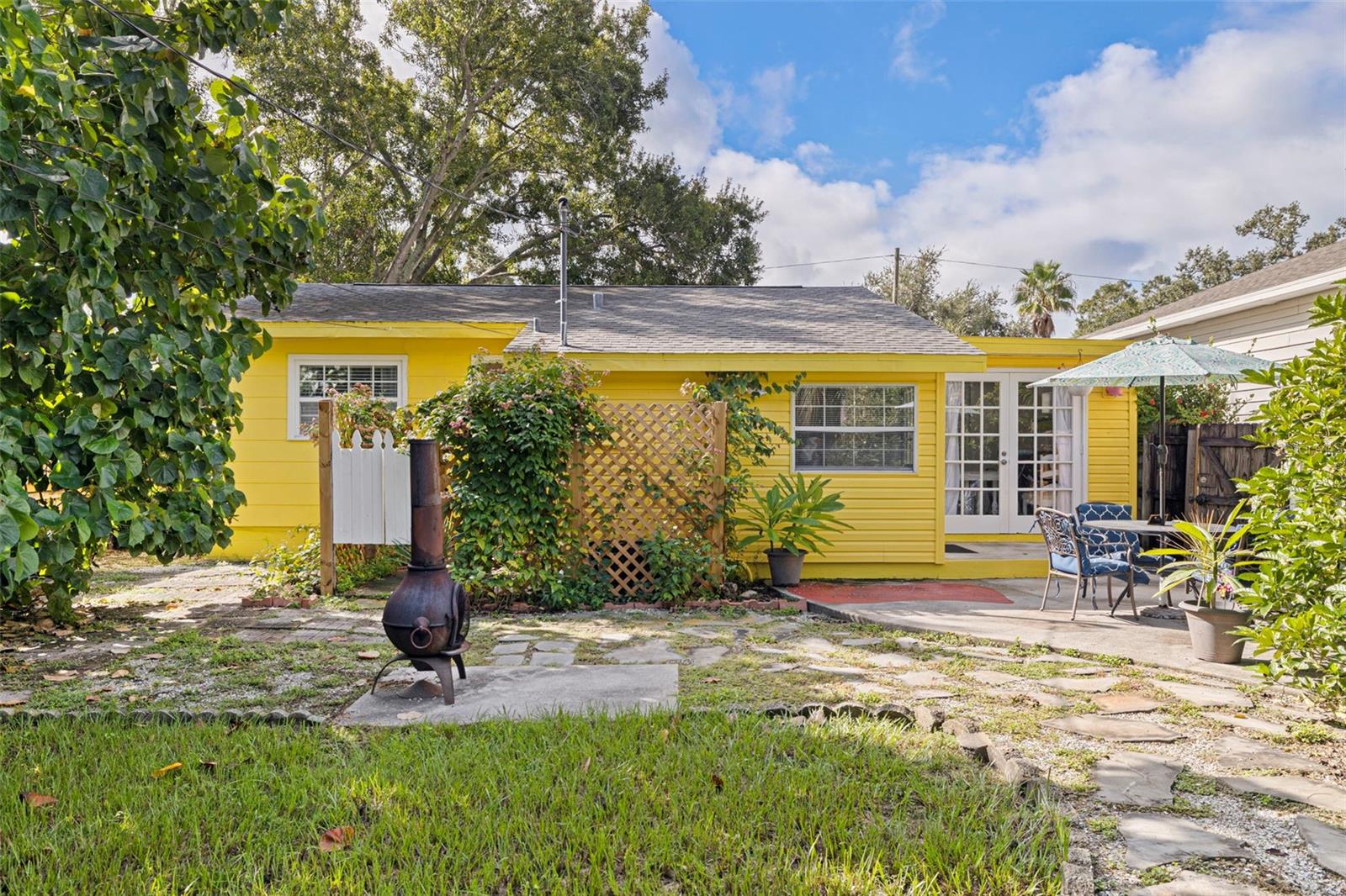 LOVABLE GULFPORT BUNGALOW with OVERSIZED LOT, GARAGE SUITE & TROPICAL OASIS. This delightful 2-BR, 1-BA bungalow is perfectly situated on a 50x172 lot w/ ALLEY ACCESS and NOT IN A FLOOD ZONE. The property offers abundant parking off the alley, plus a spacious 580 sq. ft. DETACHED garage/outbuilding featuring both a large & small roll-up door. The GARAGE is an added gem, offering its own FULL BATHROOM with shower (plumbing upgrades in 2025) and wall-unit A/C (2), making it ideal as a workshop, studio, guest space, or future conversion opportunity. Inside, this home exudes WARMTH & CHARACTER. The living room & bedrooms feature original HARDWOOD floors, while the kitchen & dining areas are finished with durable CERAMIC. The kitchen offers expansive STONE COUNTERTOP space, abundant cabinetry and STAINLESS STEEL appliances including a 2024 DISHWASHER and separate dining room provides plenty of room for entertaining. The interior paint was refreshed just three years ago, giving the home a bright & inviting feel. The bathroom has been tastefully updated with a new toilet, vanity, refinished tile, freshly painted walls, & PLUMBING UPGRADES, while a distinctive artisanal stained-glass window fills the space with light, color, and charm. The home also includes an INDOOR LAUNDRY room for everyday convenience. The CENTRAL A/C system is in good working order, complete with new capacitor in 2025, ensuring comfort year-round. A screened & covered PORCH extends your living space, freshly painted along w/ the front porch, and re-screened in 2022. Beyond, the yard is a lush TROPICAL oasis with mature landscaping, professionally maintained trees, & thoughtful plantings that create a SERENE AND PRIVATE environment. Best of all, the entire backyard is FULLY FENCED for privacy, pets, & peace of mind. Outdoor living is taken up a notch with a PRIVATE OUTDOOR SHOWER—a refreshing feature for beach days or gardening. An OUTDOOR PATIO and ample room for fire pit seating make this the perfect setting for gatherings, relaxing evenings, or weekend barbecues. Addt’l highlights inc. a full EXTERIOR REPAINT in 2024, plus a new white picket fence in the front yard, adding instant curb appeal. Gulfport is one of Tampa Bay’s most beloved WATERFRONT COMMUNITIES, where Old Florida charm meets artistic flair & small-town hospitality. Known for its vibrant downtown, arts district, weekly farmers markets, eclectic shops, & waterfront dining, Gulfport offers a LIFESTYLE unlike anywhere else in the region. Just minutes from St. Pete Beach & downtown St. Petersburg, this colorful COASTAL COMMUNITY is a destination all its own — and now you can call it home. The property is offered completely furnished, making it MOVE-IN READY or ideal as a TURN-KEY VACATION RETREAT. This bungalow has been responsibly maintained and thoughtfully updated, offering a RARE blend of character, functionality, & modern convenience. From the oversized lot and versatile 580 sq. ft. outbuilding to the artisanal details & vibrant Gulfport location, this home is truly a TREASURE ready to welcome its next owner.