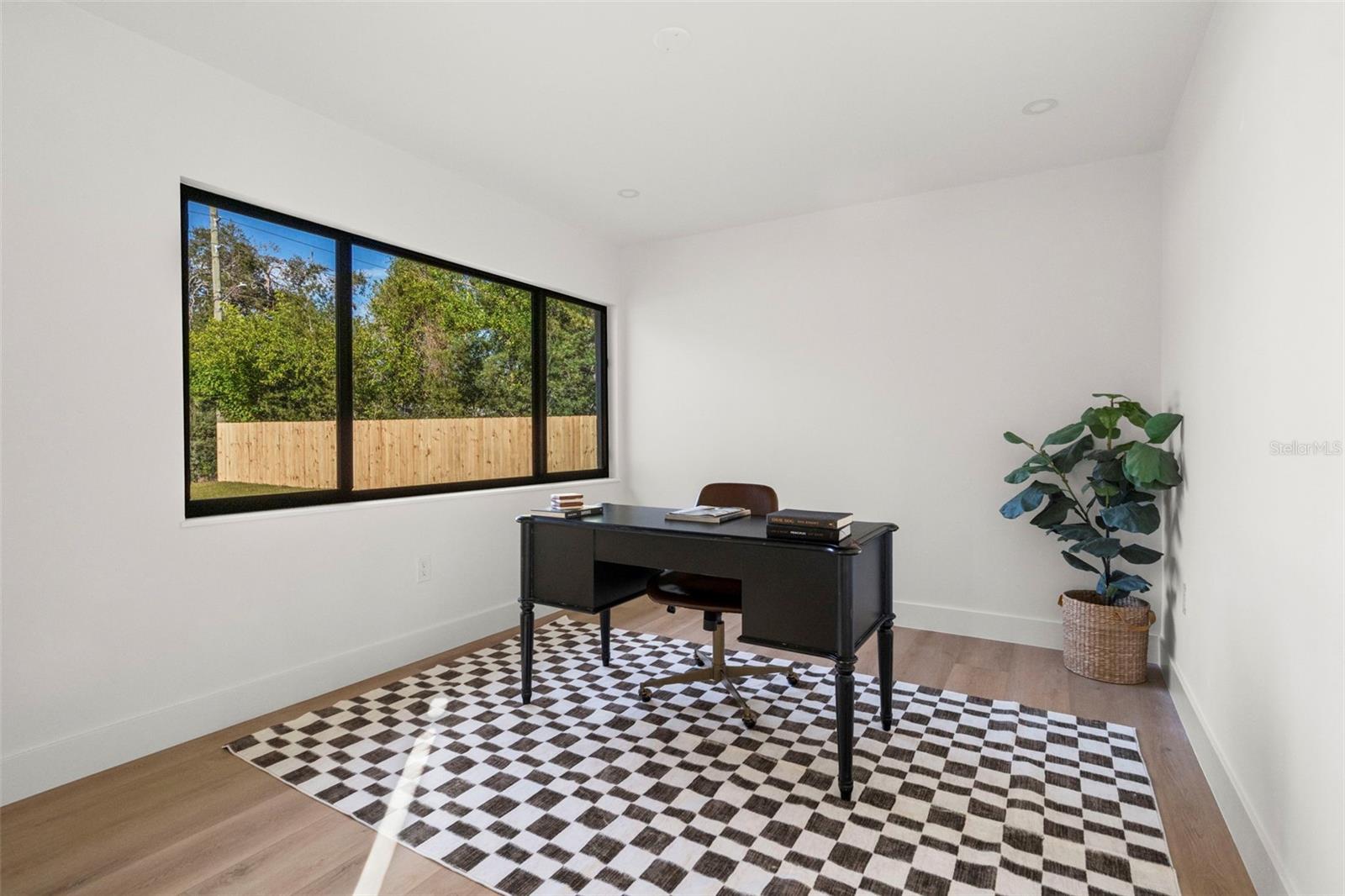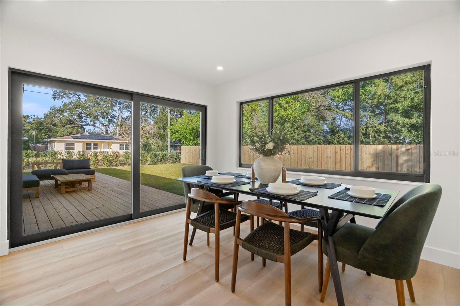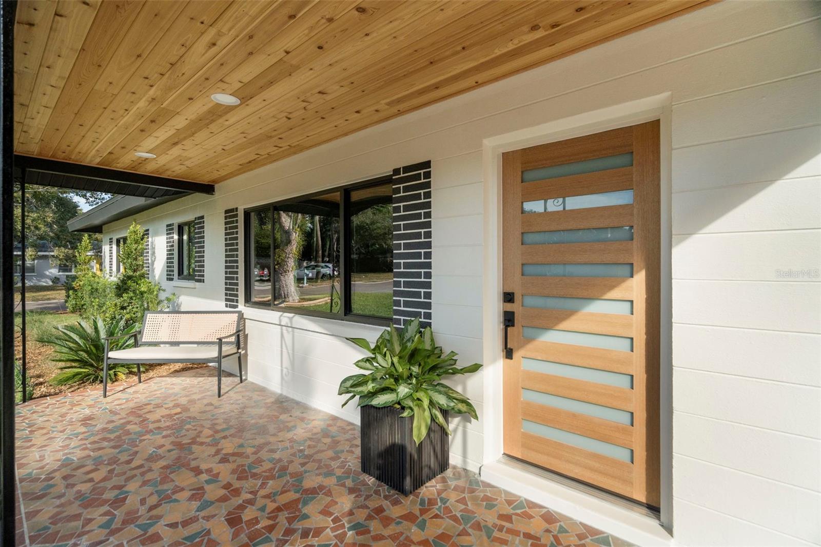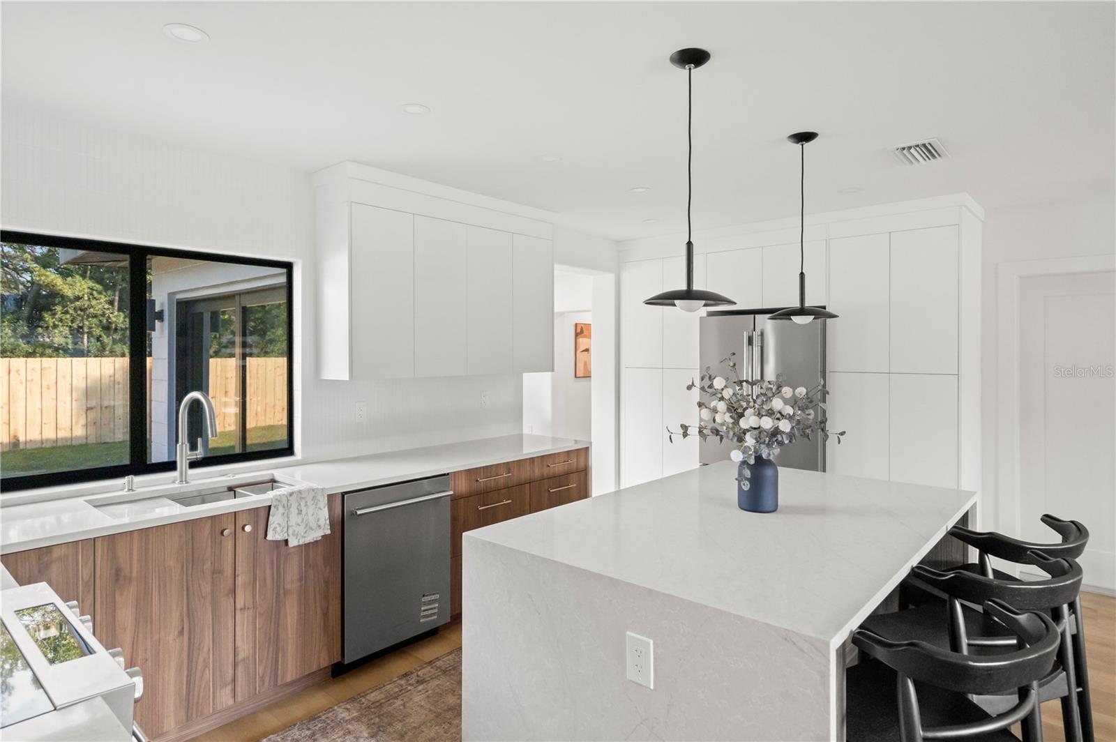 Welcome to this beautifully reimagined home in the heart of Gulfport’s coveted Marina District. Thoughtfully renovated inside and out, this 3-bedroom, 2-bath residence blends timeless mid-century modern design with today’s expectations for comfort, efficiency, and functionality. Clean lines, intentional flow, and abundant natural light define the interior. The open-concept kitchen anchors the home, seamlessly connecting the living and dining spaces for effortless everyday living and entertaining. A built-in pantry surrounds the refrigerator, maximizing storage while maintaining a sleek, integrated look. Top-of-the-line stainless KitchenAid appliances, level-8 quartz countertops, walnut lower cabinetry, and matte white uppers create a warm, modern palette that feels both elevated and inviting. The dining area comfortably accommodates an 80” table and six chairs, while expansive aluminum impact-rated windows flood the home with light from every angle. From the kitchen and dining room, glass doors open to a 30-foot deck overlooking a spacious backyard—ideal for indoor-outdoor living and offering plenty of room for a future pool. A covered front porch with a tongue-and-groove cedar ceiling adds a warm architectural touch at the home’s entry. The home features a fully built-out laundry room with generous counter space, a slop sink, and new Samsung washer and dryer. A large picture window brings in backyard views, making even daily chores feel bright and pleasant. The third bedroom doubles beautifully as a home office, overlooking the backyard and future pool area. The primary suite is a true retreat, featuring a custom built-in closet with automatic lighting designed to sit flush within the wall for maximum functionality. The en-suite bath offers dual vanities, a zero-entry shower with dual shower heads and wands, and an LED-lit niche—spa-like and thoughtfully executed. High-end details throughout the home—including push-to-open cabinetry, fluted glass accents, and level-5 drywall—reflect the exceptional care and craftsmanship that went into this renovation. Beyond the aesthetics, the systems have been comprehensively updated. Though the home has never flooded and is not in a flood zone, it was fully re-wired and re-plumbed. Additional upgrades include a new electrical panel, a brand-new architectural shingle roof plus TPO flat roof, a 2019 water heater with new conduit connections, and an HVAC system originally installed in 2016 with all major components—motor, ductwork, supplies, returns, and thermostat—replaced during renovation. New blown-in R-38 attic insulation enhances comfort and efficiency year-round. Outside, the transformation continues with new sod, podocarpus hedges, fresh fencing, and newly designed plant beds, creating privacy and curb appeal that perfectly complement the home’s modern character. This is a rare opportunity to own a truly turn-key, design-forward home in one of Gulfport’s most desirable neighborhoods—where style, function, and peace of mind come together effortlessly.