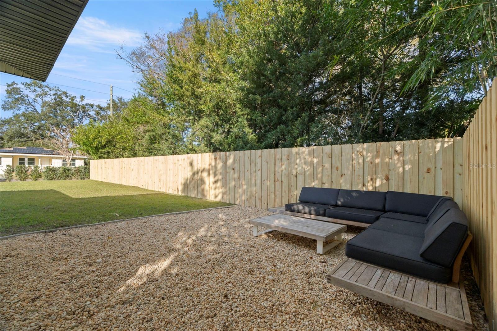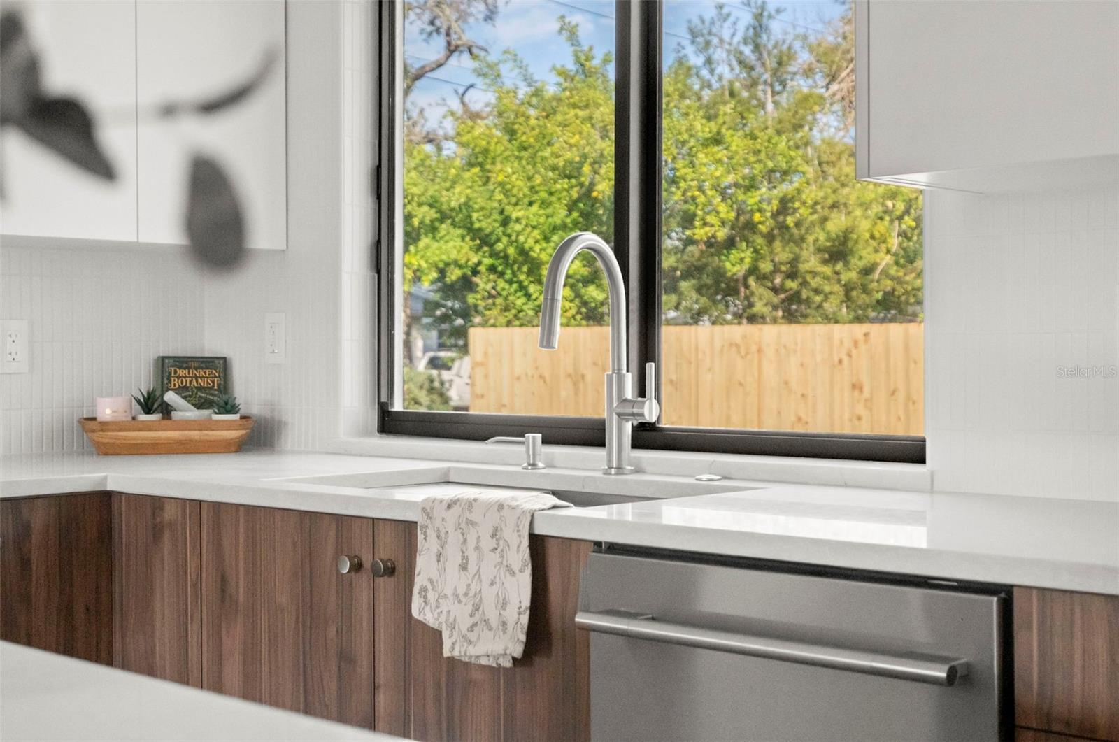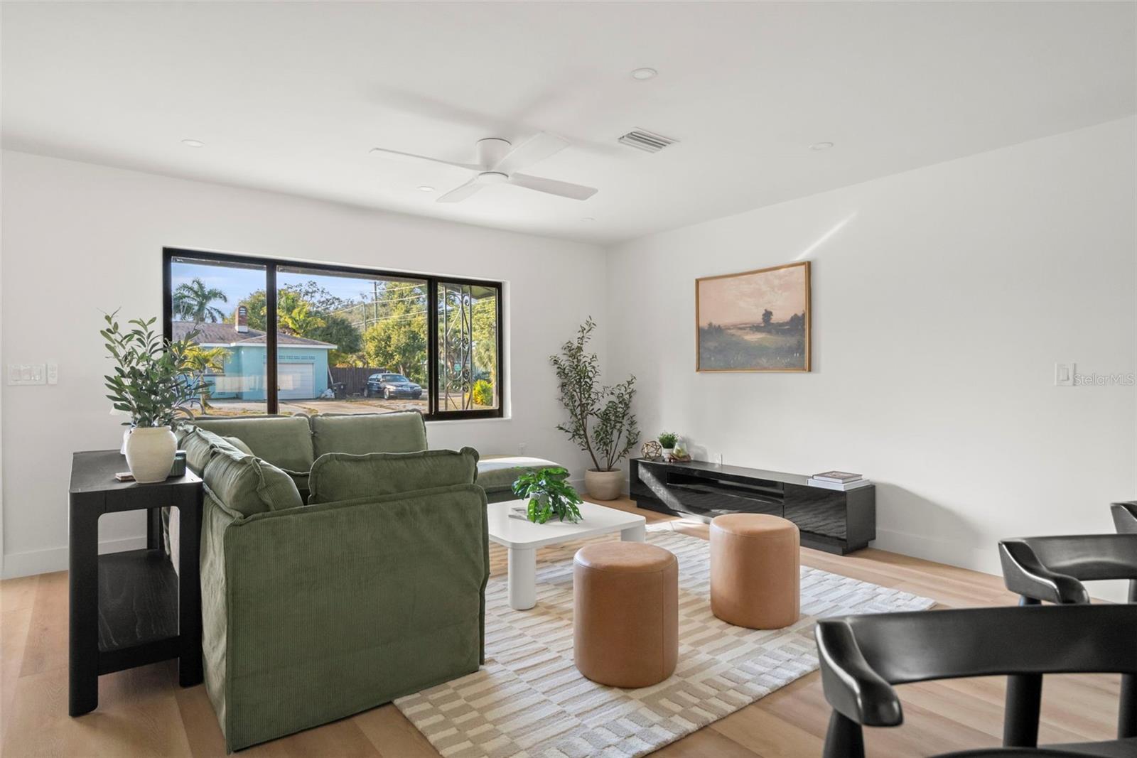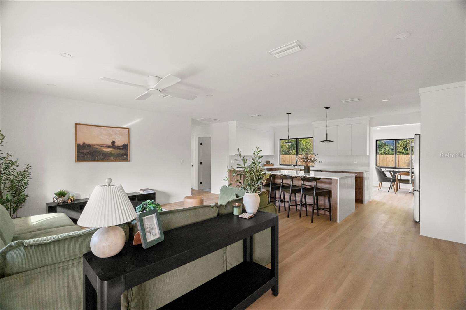Welcome to this beautifully reimagined home in the heart of Gulfport’s coveted Marina District. Thoughtfully renovated inside and out, this 3-bedroom, 2-bath residence blends timeless mid-century modern design with today’s expectations for comfort, efficiency, and functionality. Clean lines, intentional flow, and abundant natural light define the interior. The open-concept kitchen anchors the home, seamlessly connecting the living and dining spaces for effortless everyday living and entertaining. A built-in pantry surrounds the refrigerator, maximizing storage while maintaining a sleek, integrated look. Top-of-the-line stainless KitchenAid appliances, level-8 quartz countertops, walnut lower cabinetry, and matte white uppers create a warm, modern palette that feels both elevated and inviting. The dining area comfortably accommodates an 80” table and six chairs, while expansive aluminum impact-rated windows flood the home with light from every angle. From the kitchen and dining room, glass doors open to a 30-foot deck overlooking a spacious backyard—ideal for indoor-outdoor living and offering plenty of room for a future pool. A covered front porch with a tongue-and-groove cedar ceiling adds a warm architectural touch at the home’s entry. The home features a fully built-out laundry room with generous counter space, a slop sink, and new Samsung washer and dryer. A large picture window brings in backyard views, making even daily chores feel bright and pleasant. The third bedroom doubles beautifully as a home office, overlooking the backyard and future pool area. The primary suite is a true retreat, featuring a custom built-in closet with automatic lighting designed to sit flush within the wall for maximum functionality. The en-suite bath offers dual vanities, a zero-entry shower with dual shower heads and wands, and an LED-lit niche—spa-like and thoughtfully executed. High-end details throughout the home—including push-to-open cabinetry, fluted glass accents, and level-5 drywall—reflect the exceptional care and craftsmanship that went into this renovation. Beyond the aesthetics, the systems have been comprehensively updated. Though the home has never flooded and is not in a flood zone, it was fully re-wired and re-plumbed. Additional upgrades include a new electrical panel, a brand-new architectural shingle roof plus TPO flat roof, a 2019 water heater with new conduit connections, and an HVAC system originally installed in 2016 with all major components—motor, ductwork, supplies, returns, and thermostat—replaced during renovation. New blown-in R-38 attic insulation enhances comfort and efficiency year-round. Outside, the transformation continues with new sod, podocarpus hedges, fresh fencing, and newly designed plant beds, creating privacy and curb appeal that perfectly complement the home’s modern character. This is a rare opportunity to own a truly turn-key, design-forward home in one of Gulfport’s most desirable neighborhoods—where style, function, and peace of mind come together effortlessly.