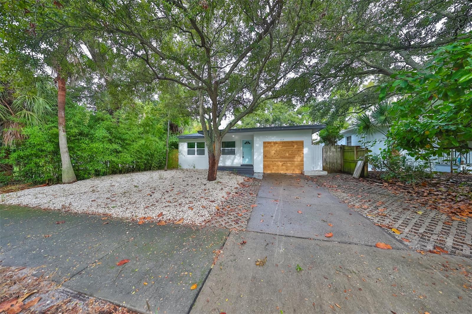 NEW BIG PRICE IMPROVEMENT -"Gulfport Living" - Enjoy stress-free living in this completely updated light and bright 3-bedroom split floorplan home. Upon entering the house, you are greeted by a wide-open plan that seamlessly leads into the living room, kitchen, dining area, and bonus room, which features natural wood luxury vinyl flooring. The dramatic blue and white kitchen features stainless appliances, crisp white soft close cabinets with brushed gold handles, stunning quartz countertops, and floating shelves on an artistic tile wall with a blue sunflower design complementing the blueberry blue island. The large primary bedroom off the kitchen has an ensuite bathroom with a walk-in shower, dramatic blue marble tile, and ample closet space. The additional 2 bedrooms are located at the front and rear of the home and share a hallway bath with custom tile work. The large bonus room full of windows is a sunlit retreat with views of the rear yard and a garden area with an oak tree canopy. A large shed comes complete with electricity and AC. Enjoy fun and funky Gulfport with a bike ride on the Pinellas trail close by or a short drive to Downtown Gulfport and Beach Drive. Located in a non-flood zone. Roof 2024 HVAC 2024. No issues with Helene or Milton. The property is high and dry