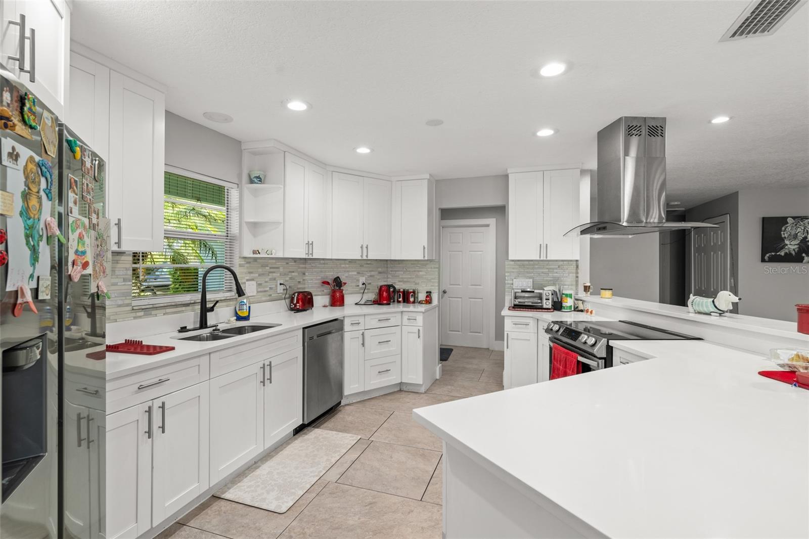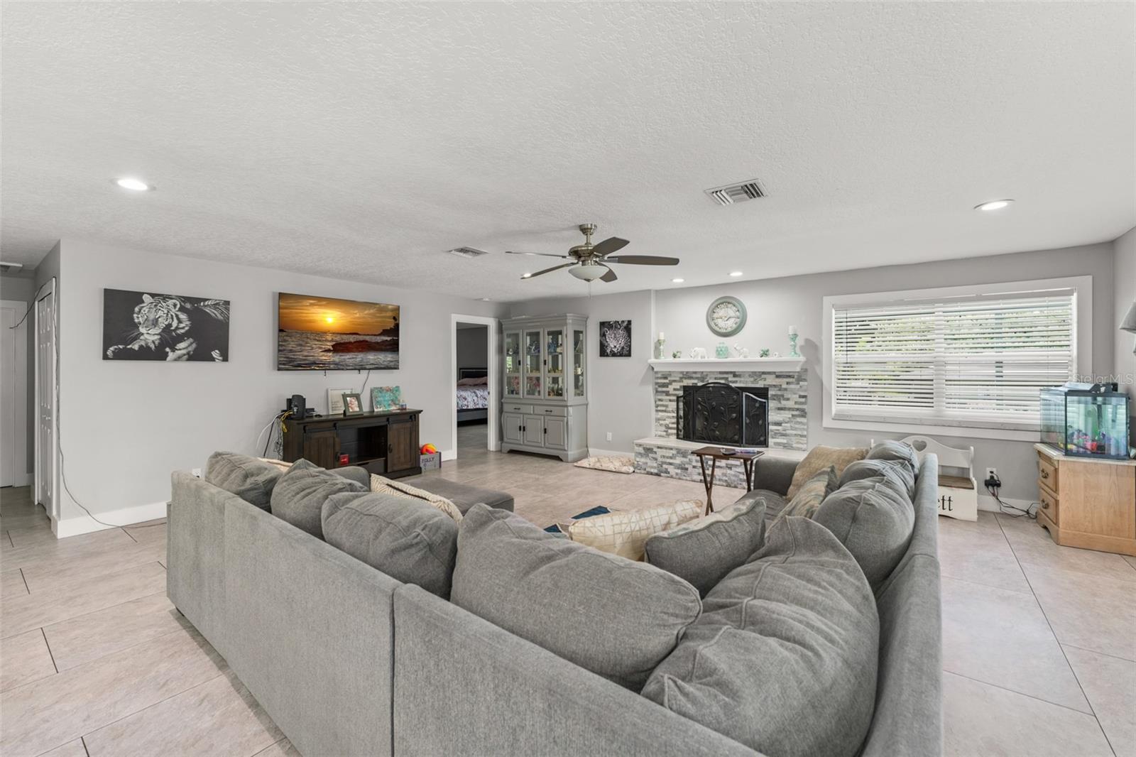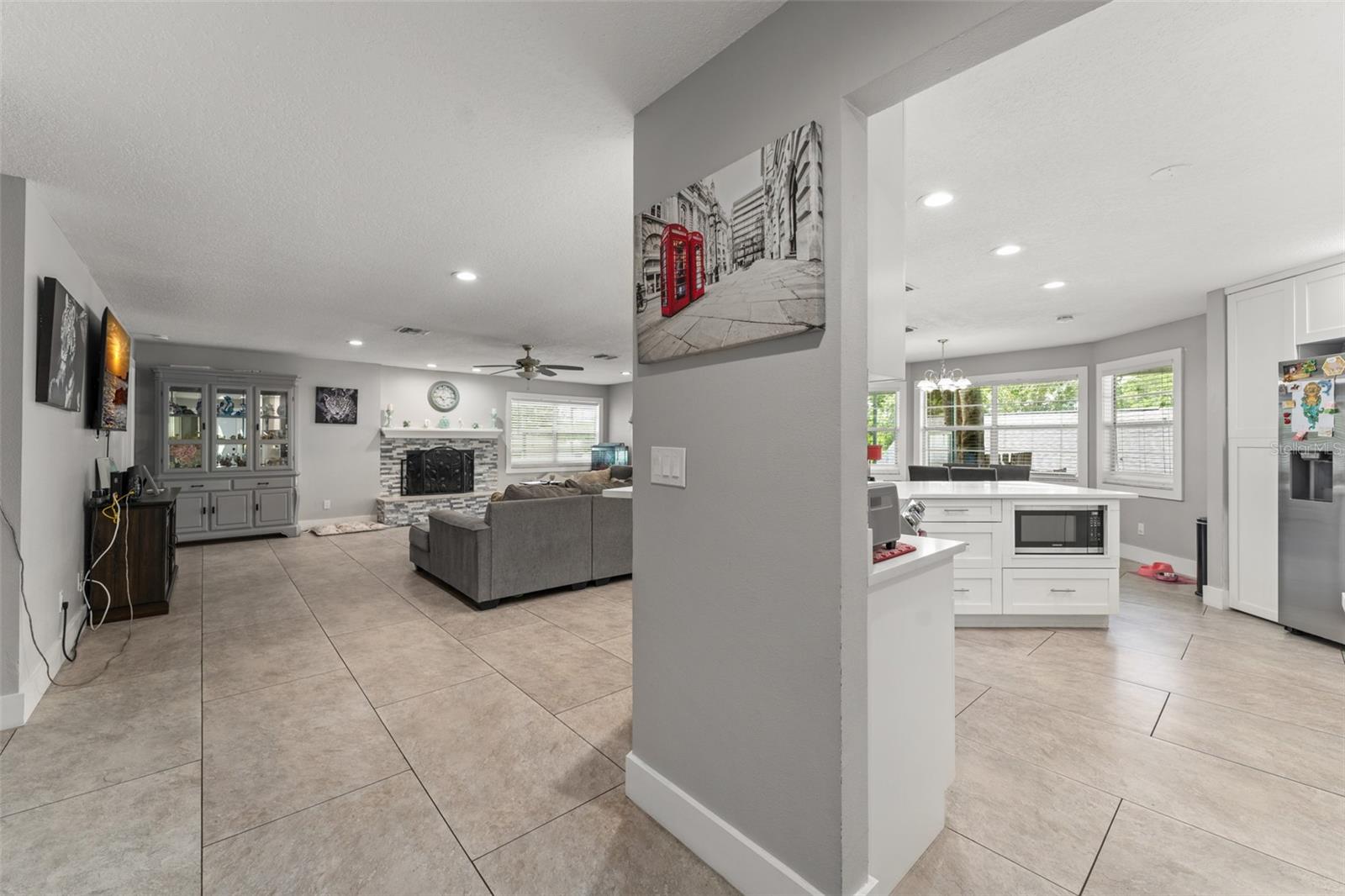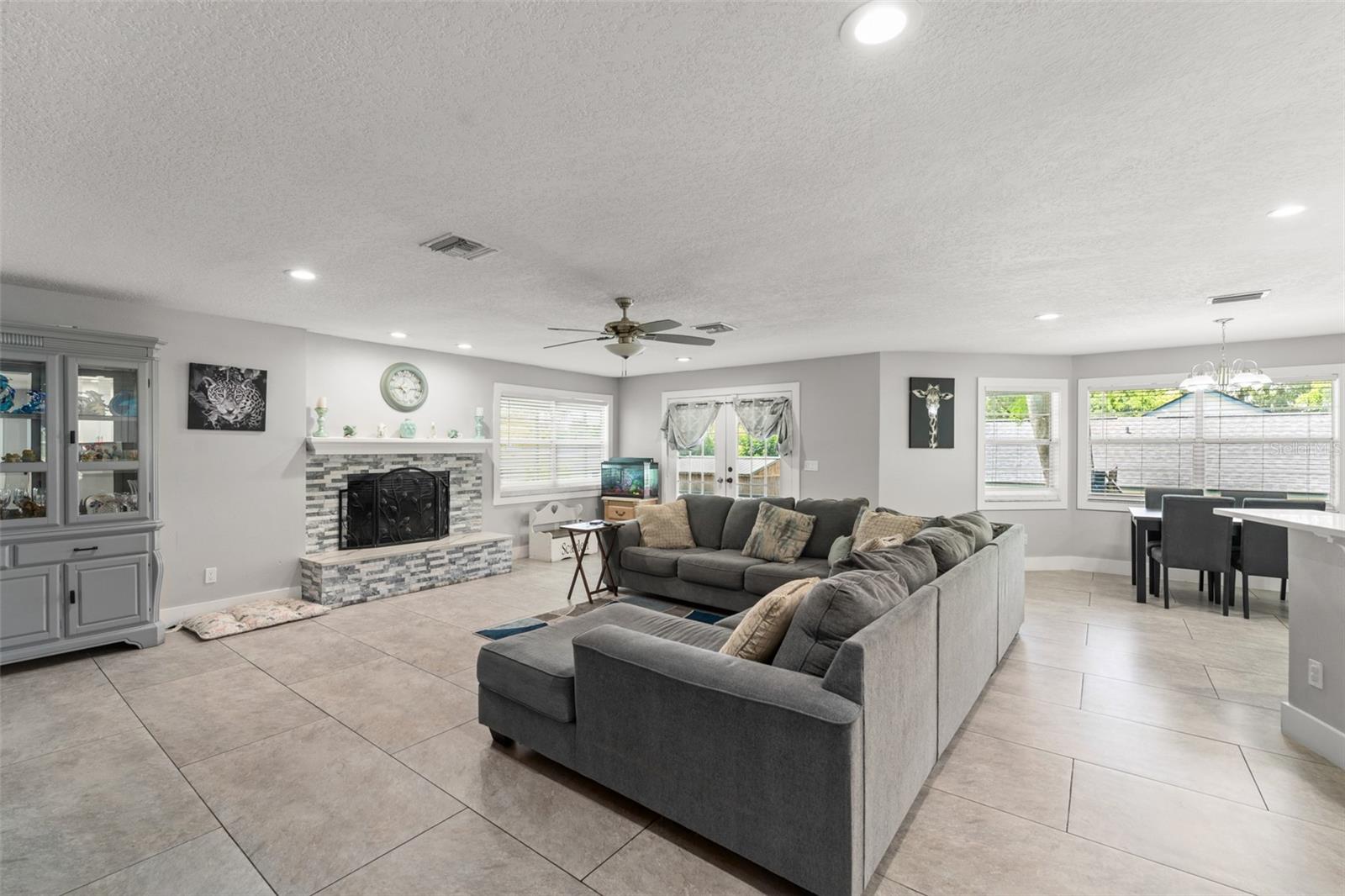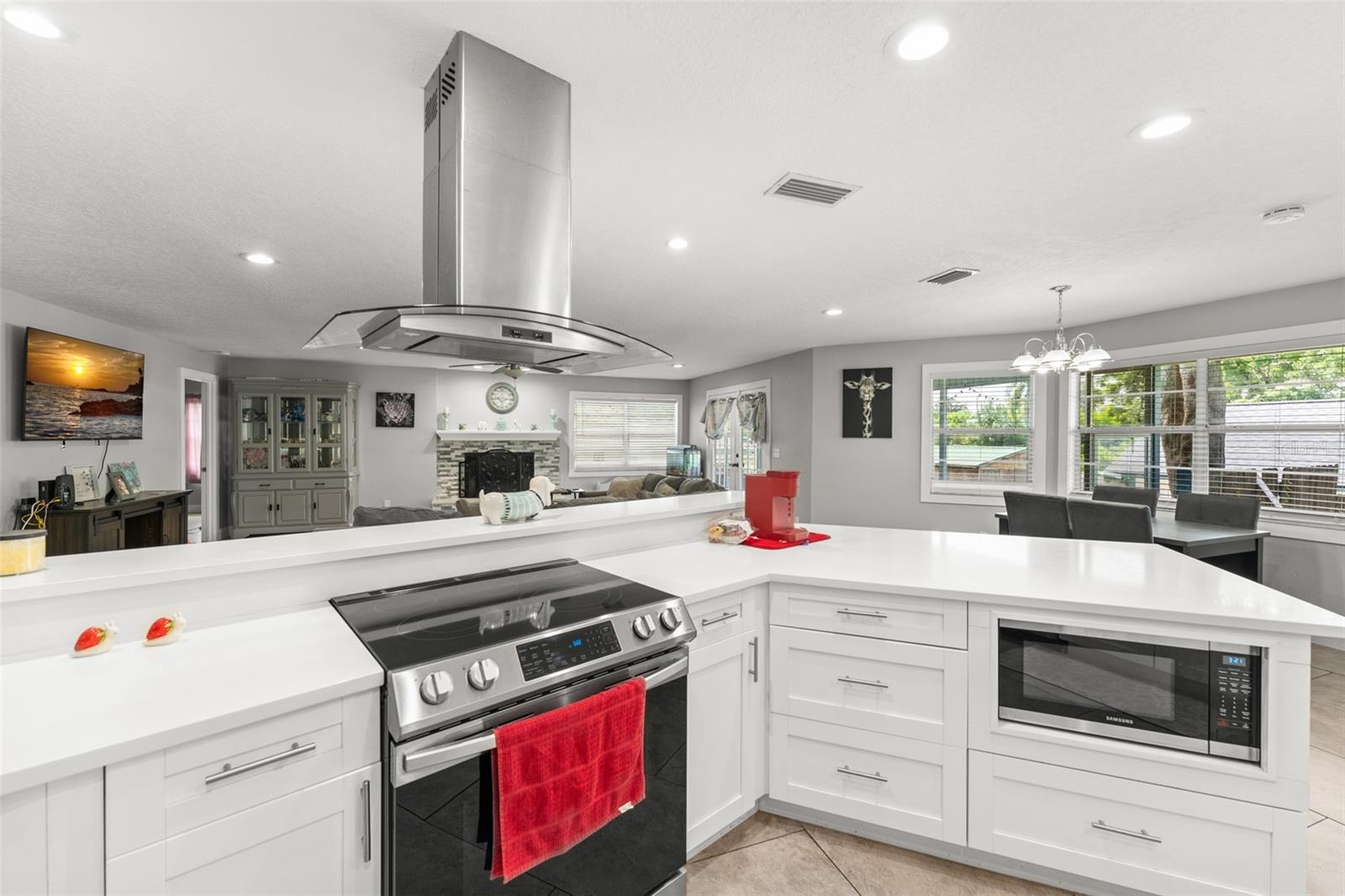 **This property qualifies for a closing cost credit up to $5,800 through the Seller’s preferred lender.**Welcome to a charming 3-bedroom, 2-bathroom single-family home with a 2-car garage, nestled in the heart of Haines City. The beautifully landscaped front yard features a mature shade tree and manicured hedges leading to the inviting front porch—setting the tone for comfort and style. Step inside to a bright and open kitchen, dining, and living room combination that creates the perfect space for everyday living and entertaining. To the right, the upgraded kitchen showcases quartz countertops, sleek white cabinetry, stainless steel appliances, a stand-alone range hood, and breakfast bar seating. The dining area is accented by a picturesque bay window that fills the space with natural light and offers a lovely view of the front yard. The spacious living room features a cozy fireplace and French doors that open to the screened-in porch, providing seamless indoor-outdoor flow. Down the hall are two well-sized bedrooms with built-in closets, just steps from a full bathroom with a tub/shower combo—ideal for guests or family. The private primary suite, located just off the living room, includes a walk-in closet and an ensuite bathroom complete with matching quartz countertops and cabinetry, dual sinks, and a luxurious floor-to-ceiling tiled walk-in shower. This home also features a dedicated laundry room for convenience. Step outside through the French doors to a screened-in porch that wraps around the corner of the home, offering a peaceful place to relax and unwind while overlooking the sparkling pool. The fully fenced backyard includes a grassy area—a blank canvas ready for your personal touch, whether it's a garden, play space, or outdoor lounge. Don’t miss the opportunity to make this move-in-ready home yours—schedule a showing today!