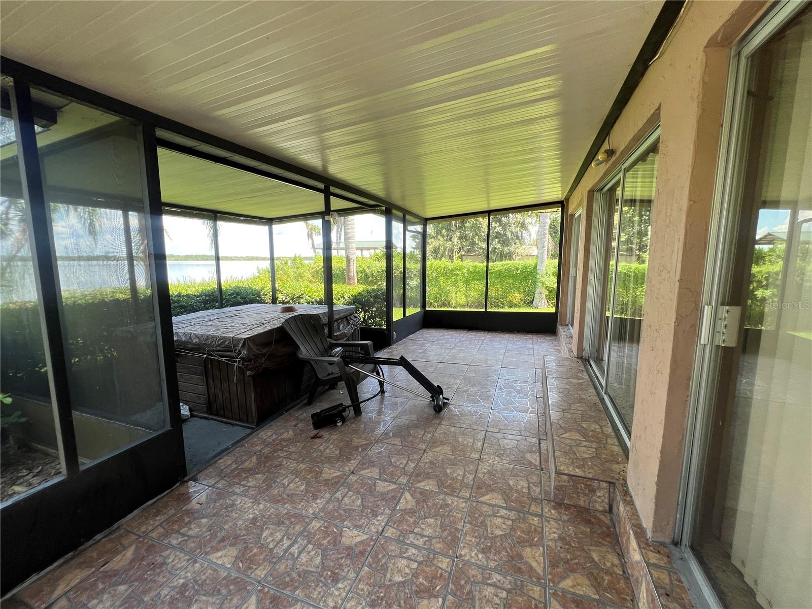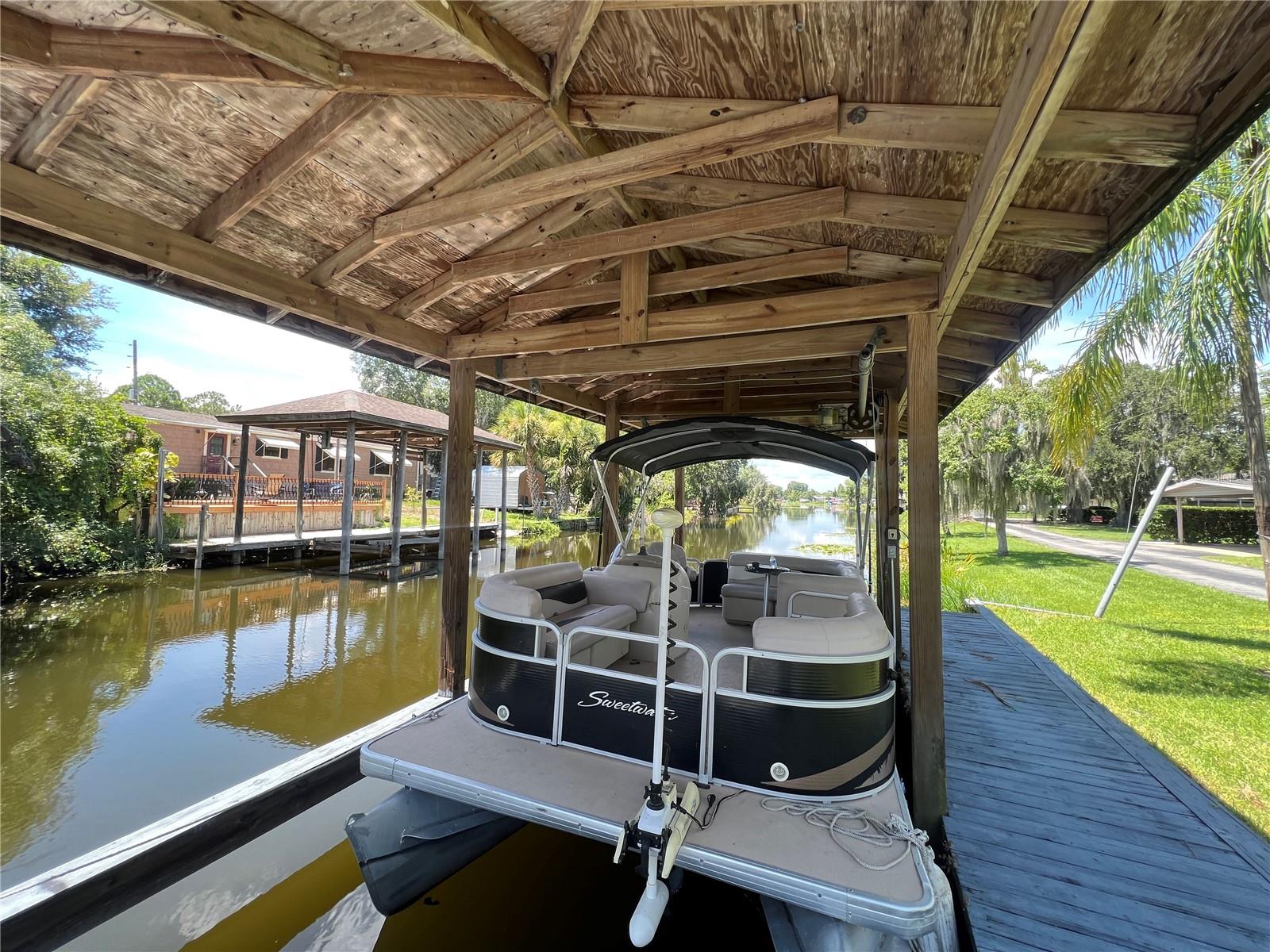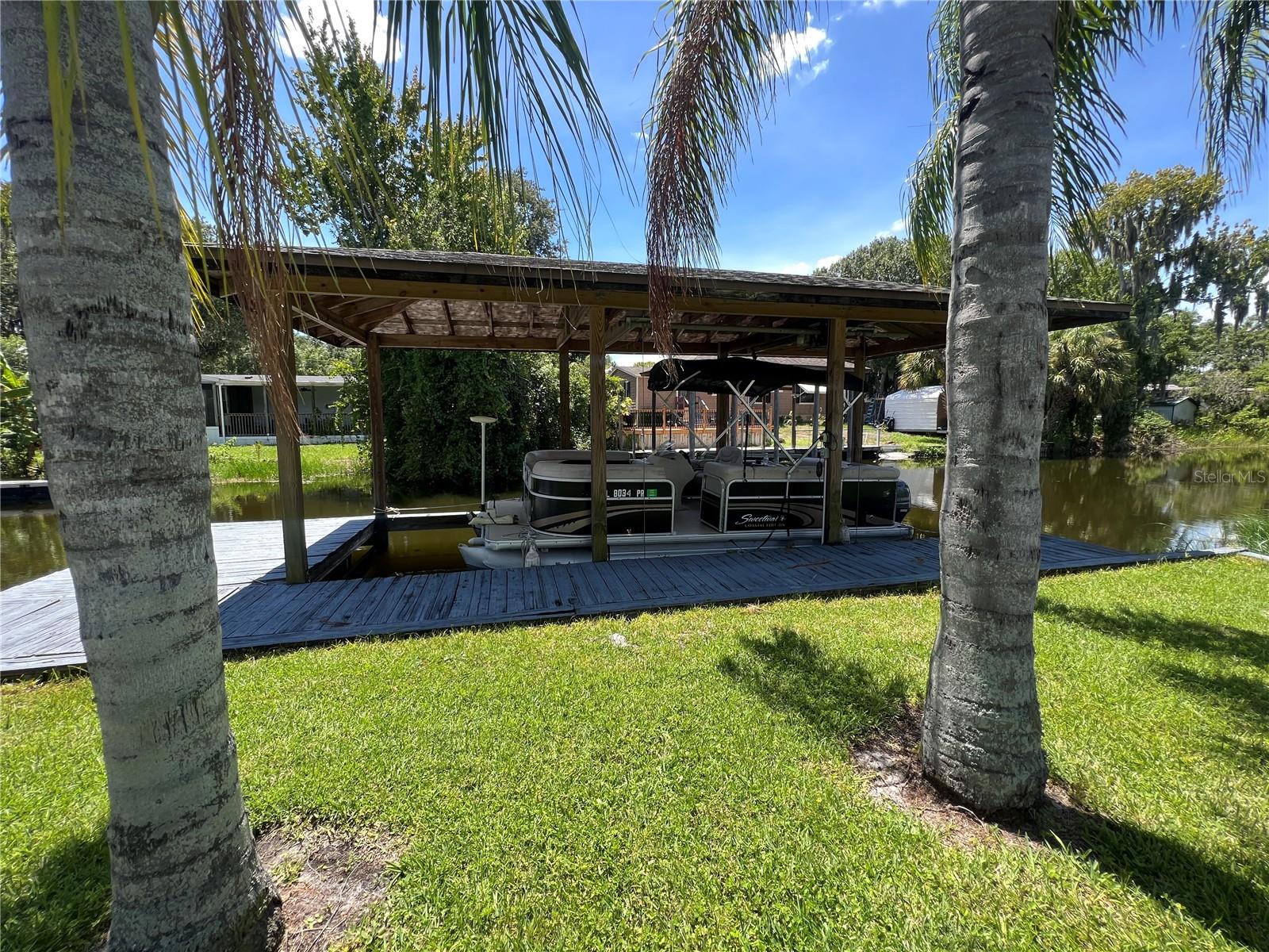 Enjoy lakefront living with this unique waterfront property featuring both a canal in the front and lake access in the back. This 3-bedroom, 2-bathroom home offers approximately 1,400 square feet of living space and boasts a solid foundation with several major updates already completed, including a brand new air conditioner and a roof that's just 6–7 years old. Outdoor enthusiasts will appreciate the newer covered boat lift located at the front canal, along with a private dock at the rear for direct lake access. A spacious, covered back patio provides the perfect spot for relaxing or entertaining and includes a hot tub that stays with the property. With some minor cosmetic updates this is a fantastic opportunity to create your dream lakefront retreat.