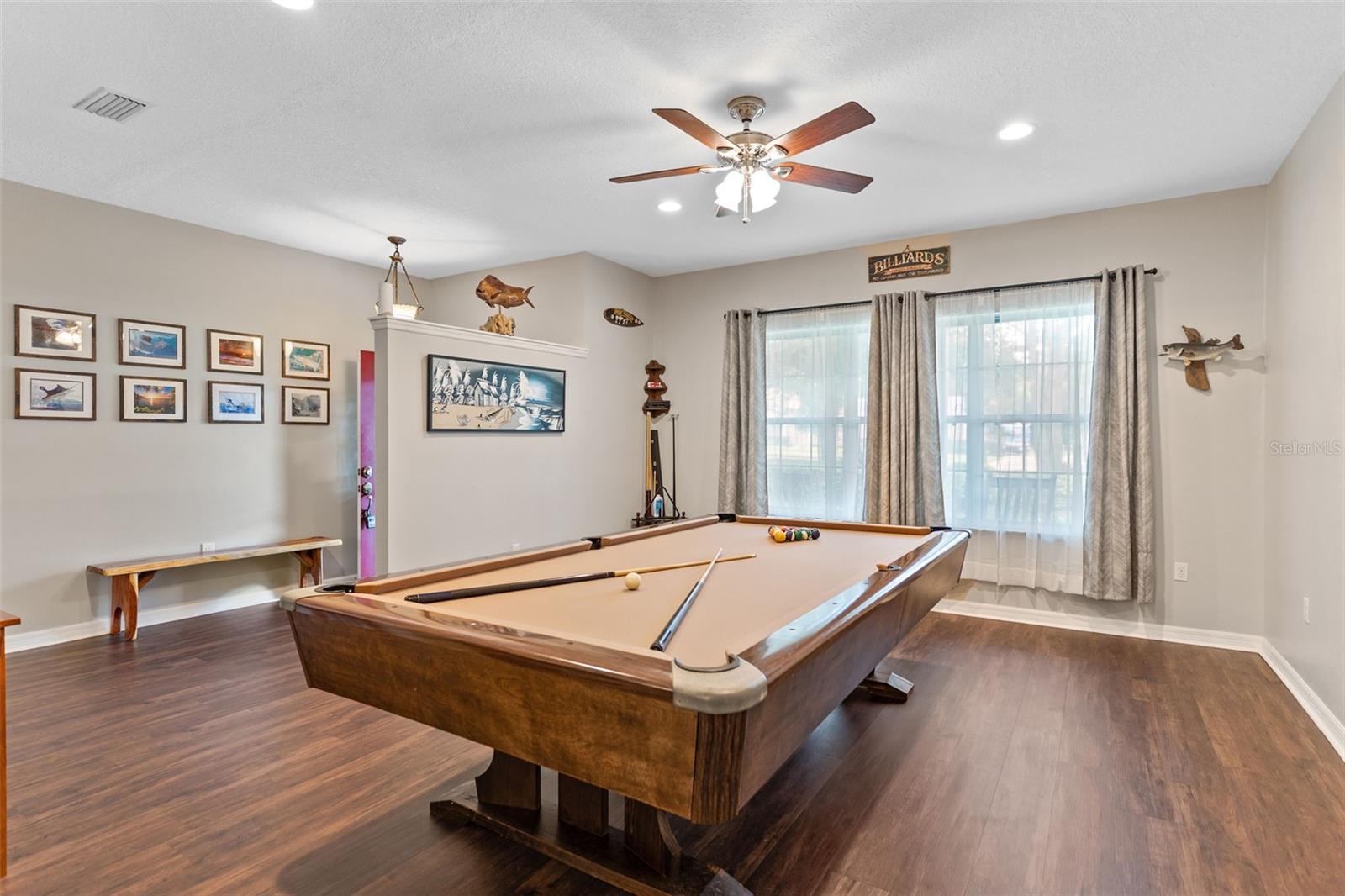 IMPRESSIVE POOL HOME ON GORGEOUS CORNER LOT! Come See this spacious 2,285 sq.ft., 3 BD/2 BA home featuring the desirable floor plan that offers an open concept living area with cathedral ceiling, an attractive open kitchen and split bedroom design giving the owners’ suite quiet seclusion. Handsome luxury plank flooring begins at the foyer and continues through to the living areas and into the master suite. To the left of the foyer is the formal dining room, yet, a versatile space with wide opening leading directly to the spaciousness of the great room, kitchen that offers casual dining and seating-at-the countertop. Beautiful wood cabinets and granite counters grace the kitchen that has a walk-in pantry and stainless steel appliances. French doors by the dinette open onto the Florida room made of large windows allowing view across the screened pool/spa and beyond to the mesmerizing landscaping throughout the fenced lawn. The secluded master en suite has a spacious walk-in closet and a room that is ideal to use as an office or den; the master bathroom is outfitted with a soaking tub, large shower and a door giving access to Florida room for poolside convenience. The additional bedrooms have carpeted flooring and stand near the second full bathroom. This beautiful corner lot has stunning landscaping with outlined islands accenting oak trees, crape myrtles and ornamental plantings. The driveway to the side-positioned garage is extra wide providing a parking pad for additional autos or boat. Within the fenced backyard is a detached building that is ideal for use as a workshop or hobby cottage. This beautiful home is like Nearly New with the many updated components and features/inside and outside since 2023-2025; currently boasting a brand NEW ROOF and newer A/C, new tankless water heater, pool equipment, generator ready, newer appliances, ceiling fans and more! This impressive property is nestled within the oak hammock of the Spring Pines community(No HOA). It’s a short drive to I-4 for Orlando, Tampa, Gulf or Ocean Beaches; a convenient Central Florida location! Call today, schedule your private viewing of this beauty!